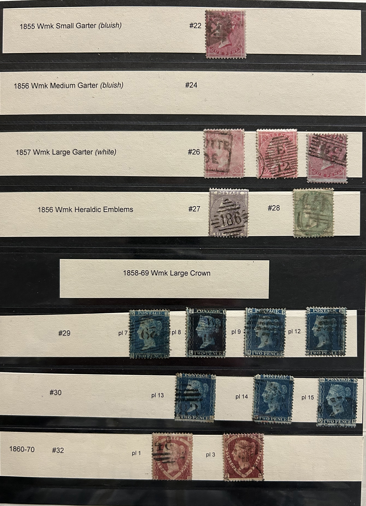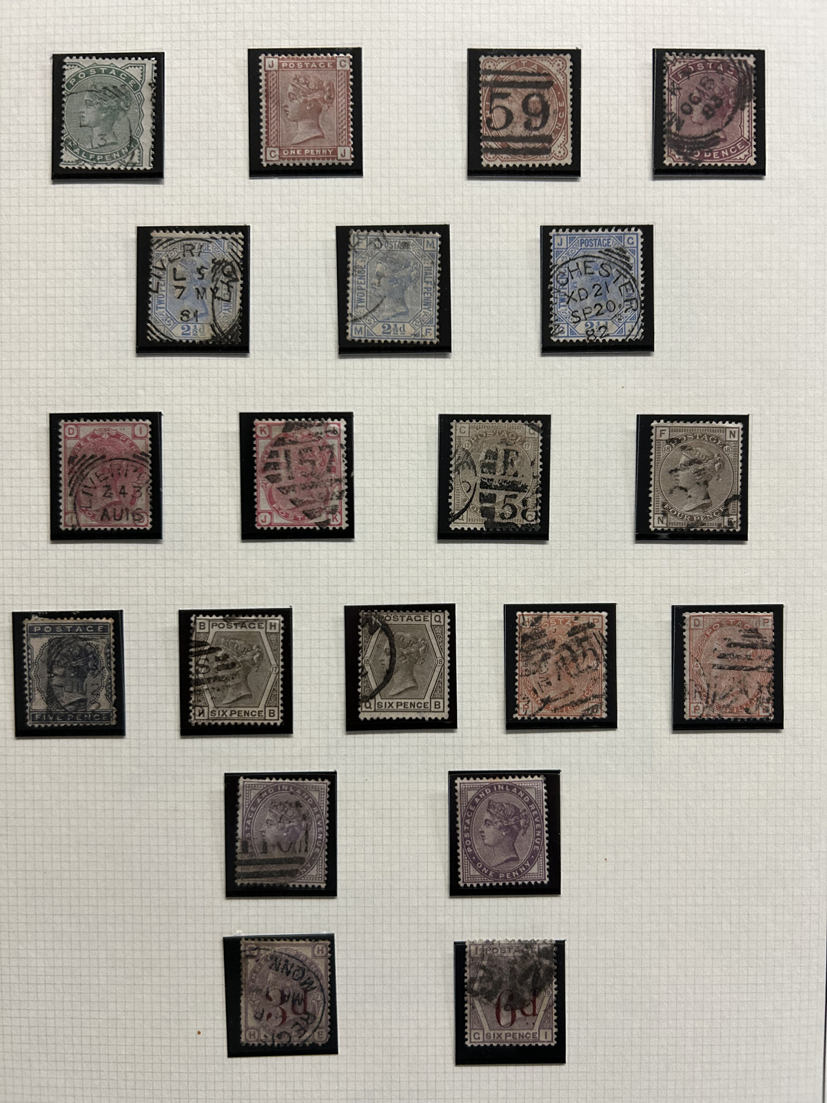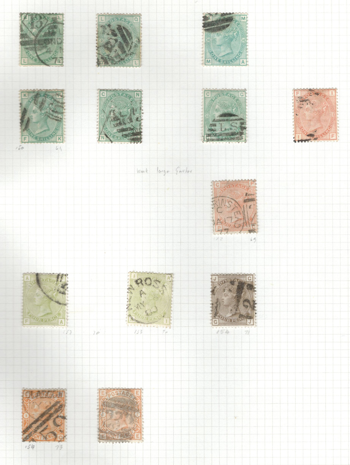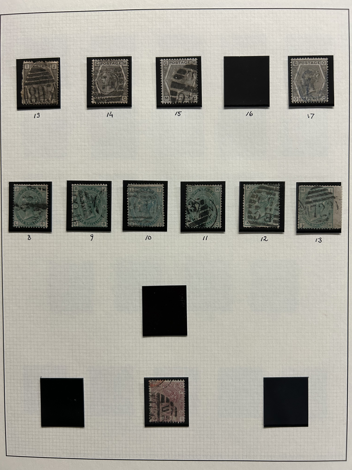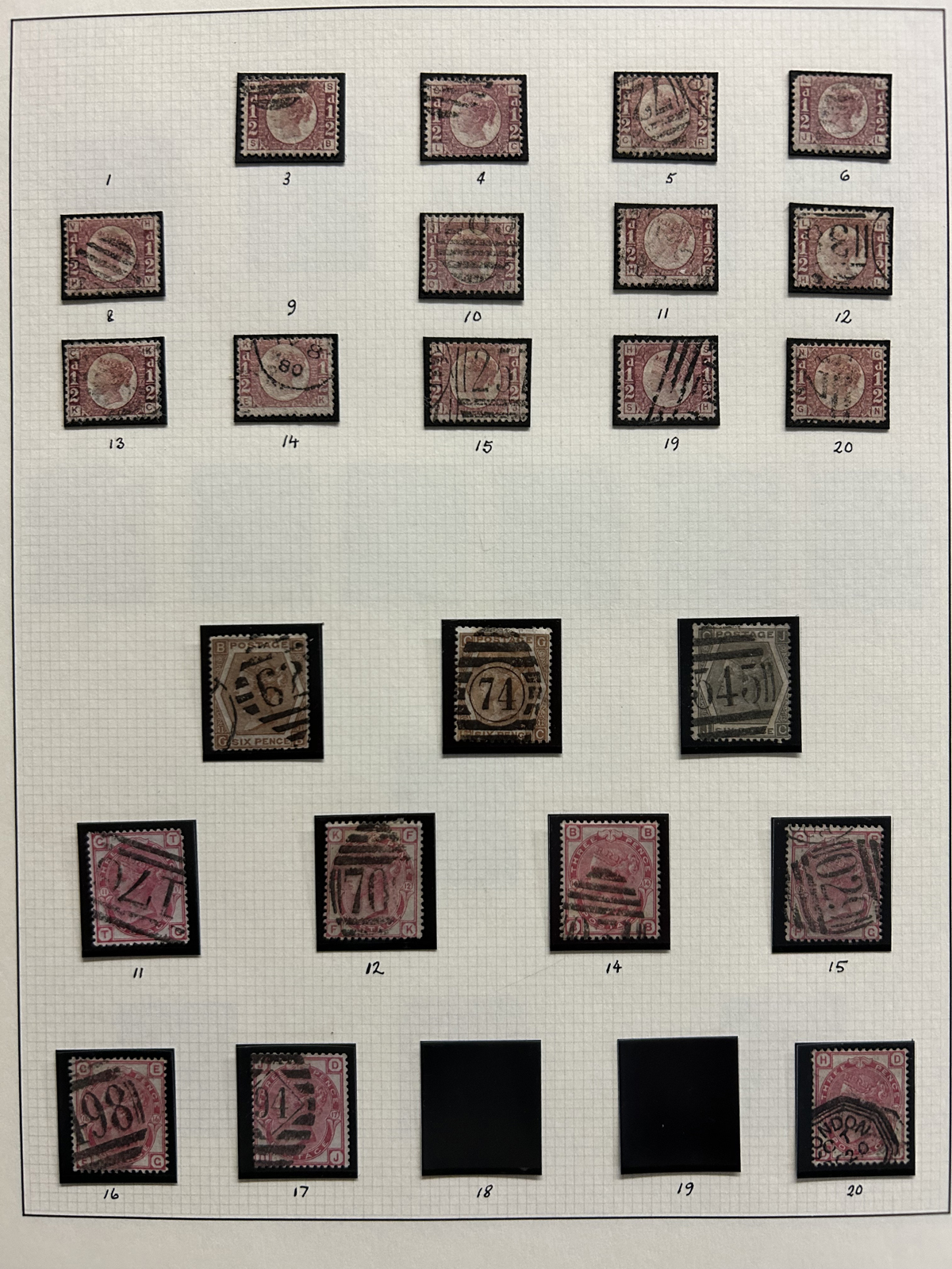 669 O 1/126 imageValuable and Extensive Collection of Queen Victoria Issues, 1840 to 1900, all displayed on 22 quadrille pages. Starts off with 5 Penny Blacks ($375 each), 17 imperforate Penny Reds with Maltese Cross cancels ($977 total), 12 imperforate 2d blue 1841 issues (with varieties, a pair, a strip of three), 9 perforated Penny Reds (incl. 2 pairs, a few perf. 16, etc.), 2 pages (12 stamps) of the perforated 2d blue issues (incl. at least one perf. 16), and the following Scott #s: 22 ($500), 24 ($625), 25 ($600), 26 (x4, $175 each), 27 (x3 shades, $140 each), 28 (x3, $400 each), 32 (x5, chosen for dated town cancels, $80 each), 34 (x3, $150 each), 37 ($375), 39 (x4, $160 each), 40 (x2, $550 each), 42 ($350), 43 (x4, $62 each), 44 ($275), 45 (x3, $160), 46 ($700), 48 (x3, $325 each), 49 (x5, with diff. plate #s, $477 total), 50 (x2, $210 each), 51 (x3, with plates 8 and 9, $430 total), 52 (x2, $350 each), 53 (x2, $475 each), 54 (x4, plates 4 to 7, $285 total), 55 ($260), 57 (x2, $775 each), 58 (x10, with at least 7 diff. plates), 59 (x4, $75 each), 60 (x2, $350 each), 61 (x9, plates 11 to 20, $905 total), 62 (x4, plates 13 to 16, $420 total), 64 (x6, plates 8 to 13, $1,155 total), 65 ($650), 66 (x3, $140 each), 67 (x15, plates 3 to 16, $1,575 total), 68 (x4, plates 17 to 20, $282 total), 69 ($550), 70 (x2, plates 15, 16, $725 total), 71 ($575), 73 (x2, $400 each), 74 ($3,750), 78 (x2), 79, 80, 81 (x2, $140 each), 82 (x5, plates 21 and 22, $262 total), 83 (x2, plates 20 and 21, $290 total), 84 (x2, plates 17 and 18, $180 total), 85 ($200), 86 (x3, plates 17 and 18, $277 total), 87 (x2, plates 13 and 14, $400 total), 88 (x3, $52 each), 89 (x3), 94 (x3, $185 each), 96 ($185), 98, 99 ($52), 100 ($92), 101, 102 (x2, $115 each), 103 (x2, $245 each), 104 ($245), 105 (x2 $280 each), 107 ($380), 108 (x3, $290 each), 109 (x3, $615 each), and 111-122 (set, plus extras, $751 total). A clean collection, with many better cancels (incl. c.d.s.) and better stamps (as noted above), also useful for its shades and different plate numbers, and more. Scott catalogue value approaches the U$40,000 mark, overall fine or better, and generally better quality than is often seen. All pages scanned online. (Scan 1) (Scan 2) (Scan 3) (Scan 4) (Scan 5) (Scan 6) (Scan 7) (Scan 8) (Scan 9) (Scan 10) (Scan 11) (Scan 12) (Scan 13) (Scan 14) (Scan 15) (Scan 16) (Scan 17) (Scan 18) (Scan 19) (Scan 20) (Scan 21) (All Scans) (All Images)