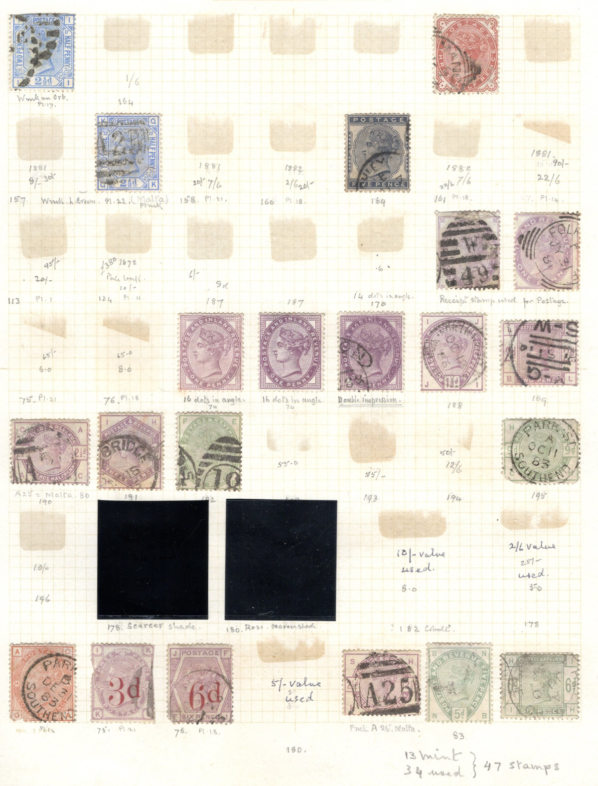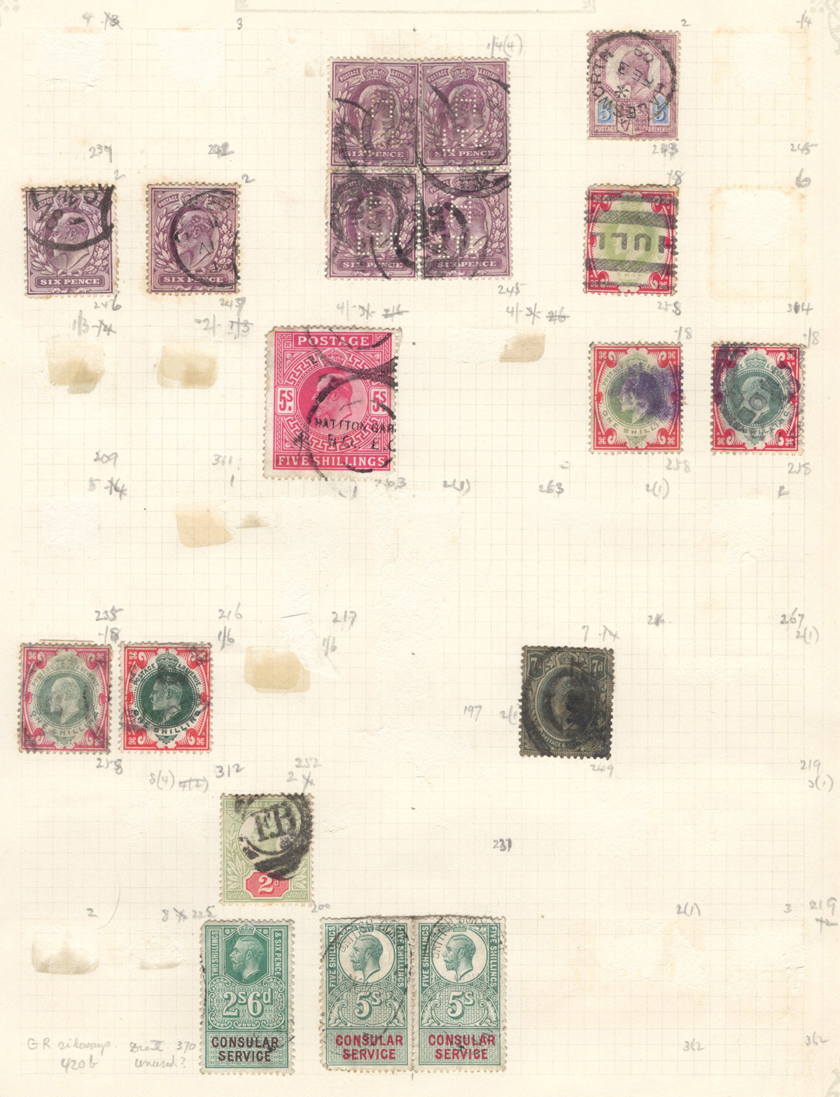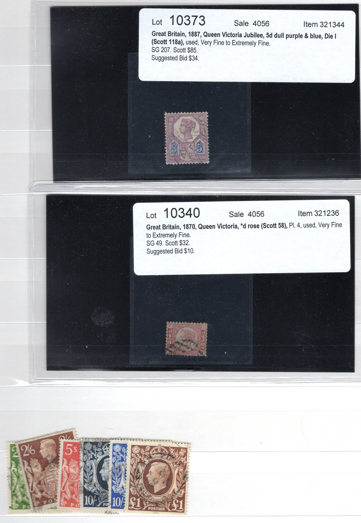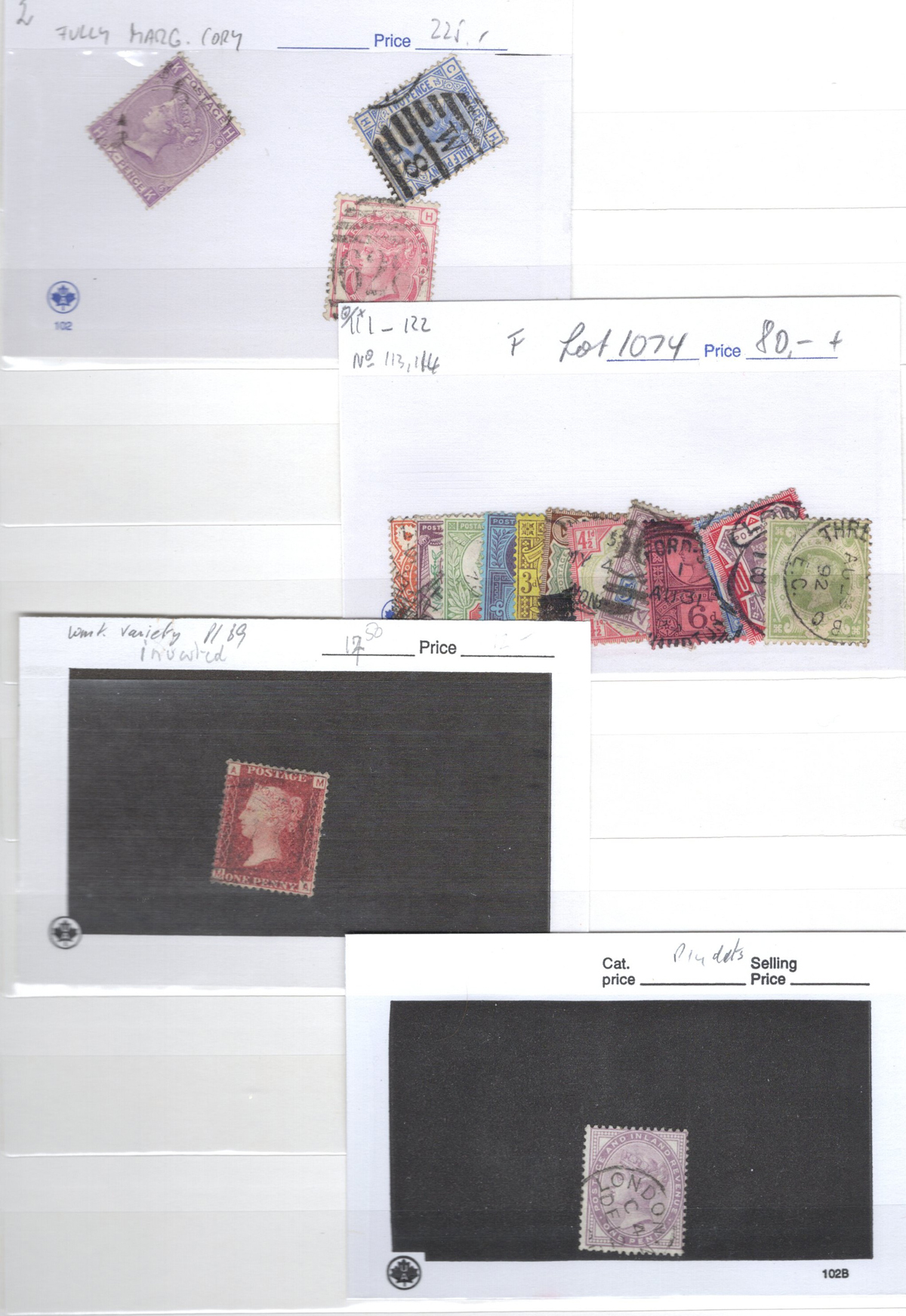 665 O/og   imageOld Time Holding of Mostly Queen Victoria to King George V Issues, all in a stockbook plus two collections on pages. The stockbook contains a mostly jumbled mix of material, with many valuable items such as a page containing early QV items including a nice embossed 6d stamp, etc. Also saw the 2sh6d QV issues (x9 used, several with nice postmarks), the 5sh QV (x2), a page of Officials and QV stamps postmarked or overprinted for use elsewhere, a page containing 4 pieces with QV stamps postmarked in 1899 "F.P.O. British Army Africa", 2 pages of mint and used early Postage Dues, as well as numerous other QV to KGV duplicated material. A high catalogue value in this stockbook. Also two very old collections that have been picked but still contain useful material, mostly QV to KGV, noting several imperforate Penny Reds, a plating exercise for the perforated Penny Red issue (missing 175 and 225) and much more. Quality varies drastically (especially in one of the old collections) still a great number of sound, useful and valuable stamps throughout. Our photos only show part of the lot, should easily be worth our low estimate. (Scan 1) (Scan 2) (Scan 3) (Scan 4) (Scan 5) (Scan 6) (Scan 7) (Scan 8) (Scan 9) (Scan 10) (Scan 11) (Scan 12) (Scan 13) (Scan 14) (Scan 15) (Scan 16) (Scan 17) (Scan 18) (All Scans) (All Images)