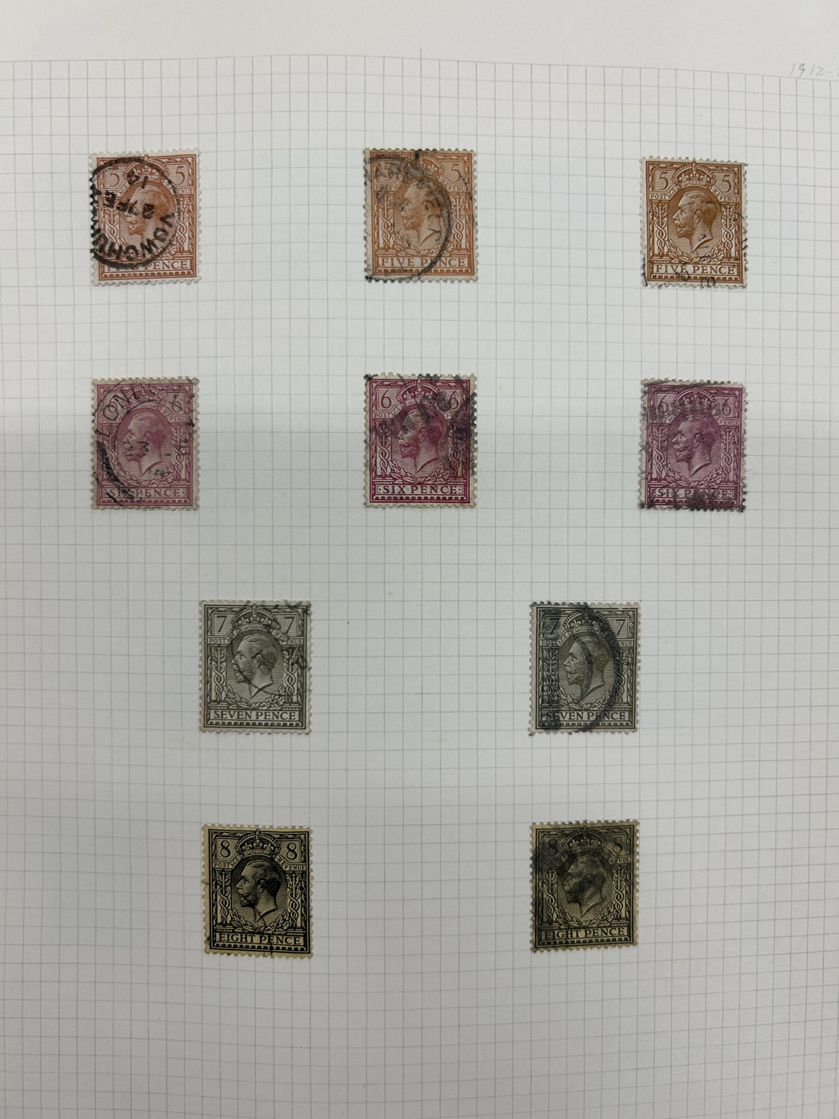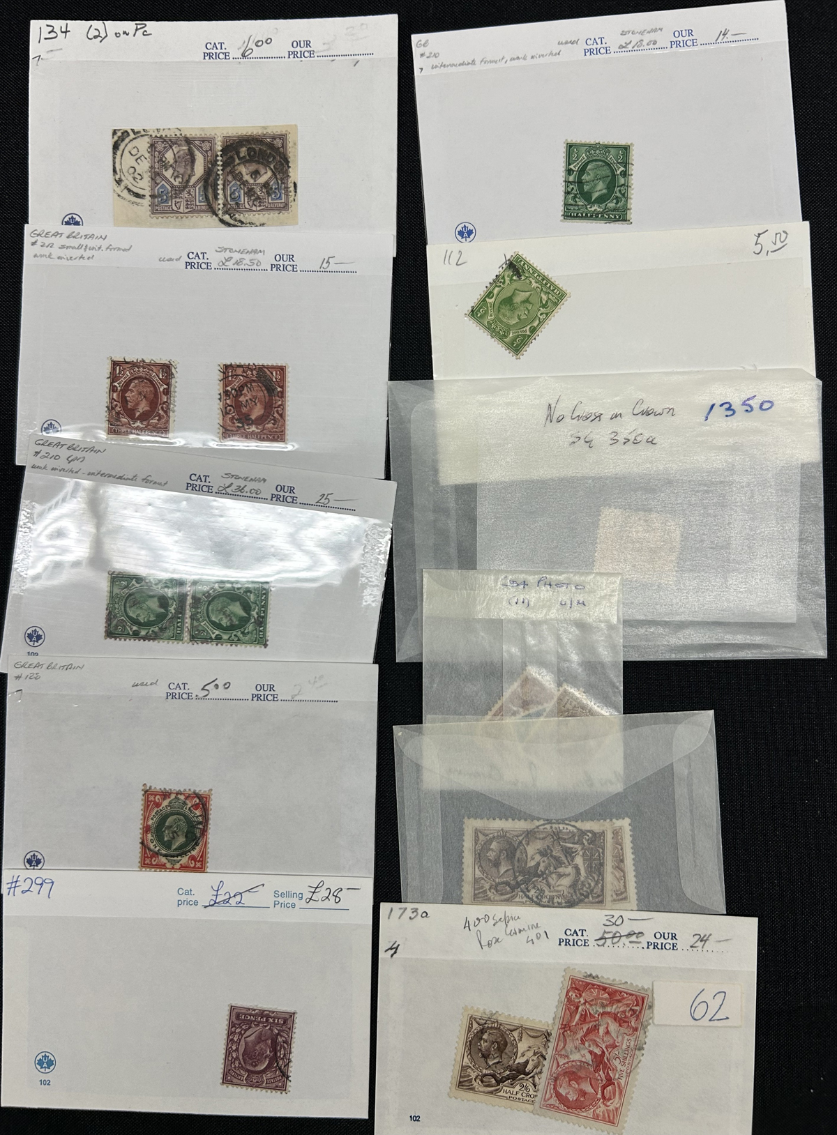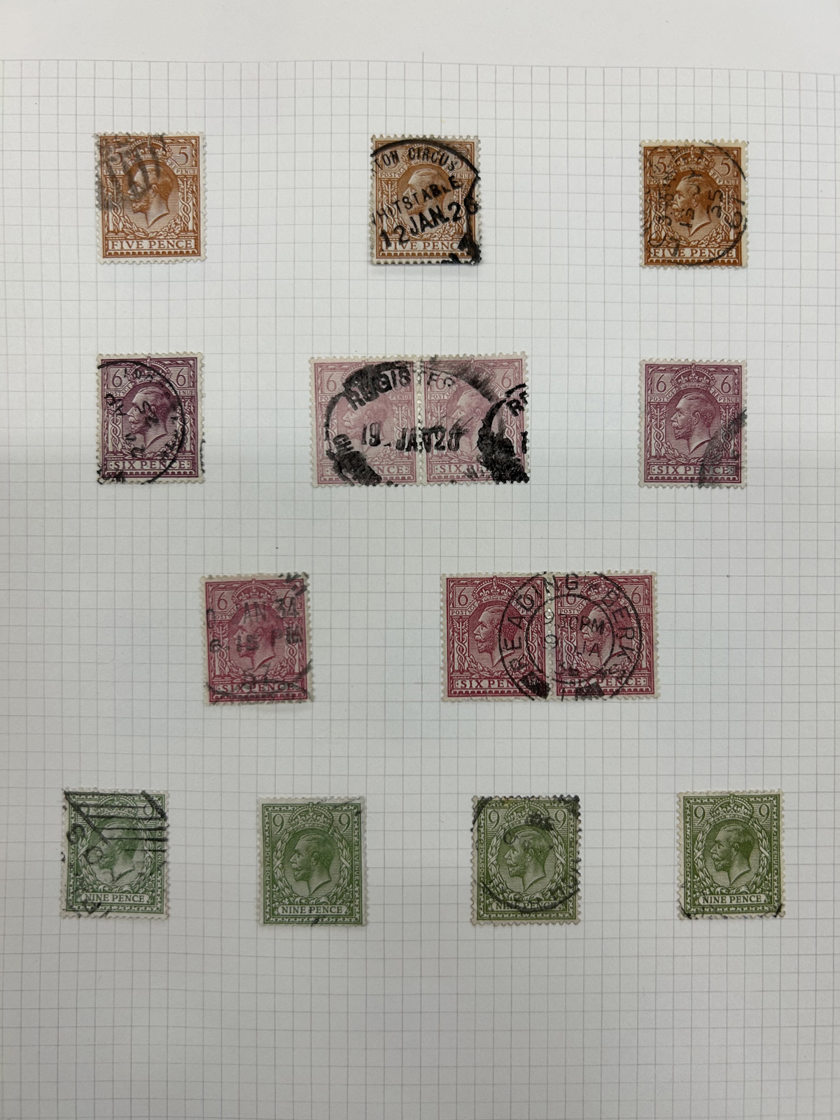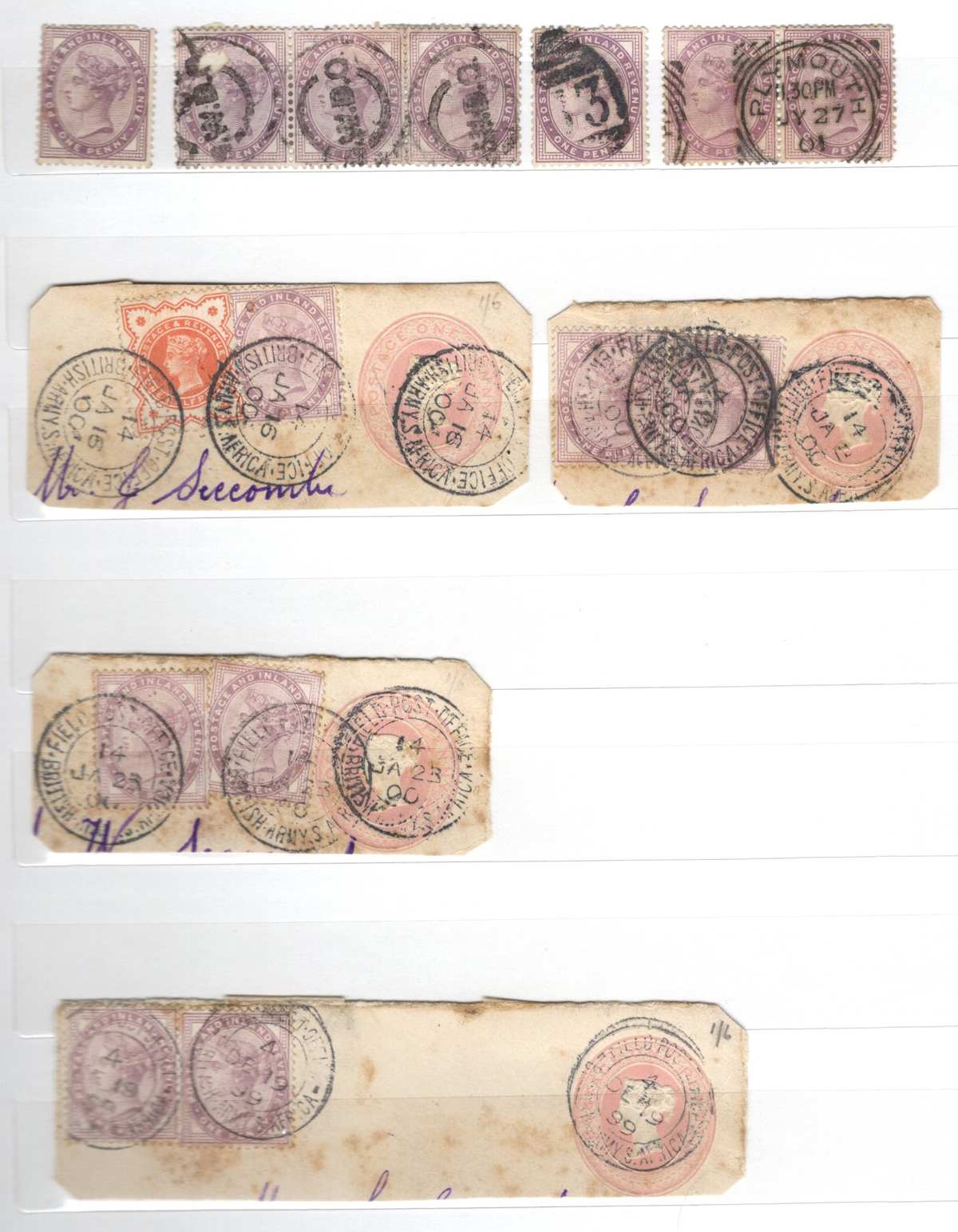 665 O/og   imageOld Time Holding of Mostly Queen Victoria to King George V Issues, all in a stockbook plus two collections on pages. The stockbook contains a mostly jumbled mix of material, with many valuable items such as a page containing early QV items including a nice embossed 6d stamp, etc. Also saw the 2sh6d QV issues (x9 used, several with nice postmarks), the 5sh QV (x2), a page of Officials and QV stamps postmarked or overprinted for use elsewhere, a page containing 4 pieces with QV stamps postmarked in 1899 "F.P.O. British Army Africa", 2 pages of mint and used early Postage Dues, as well as numerous other QV to KGV duplicated material. A high catalogue value in this stockbook. Also two very old collections that have been picked but still contain useful material, mostly QV to KGV, noting several imperforate Penny Reds, a plating exercise for the perforated Penny Red issue (missing 175 and 225) and much more. Quality varies drastically (especially in one of the old collections) still a great number of sound, useful and valuable stamps throughout. Our photos only show part of the lot, should easily be worth our low estimate. (Scan 1) (Scan 2) (Scan 3) (Scan 4) (Scan 5) (Scan 6) (Scan 7) (Scan 8) (Scan 9) (Scan 10) (Scan 11) (Scan 12) (Scan 13) (Scan 14) (Scan 15) (Scan 16) (Scan 17) (Scan 18) (All Scans) (All Images)