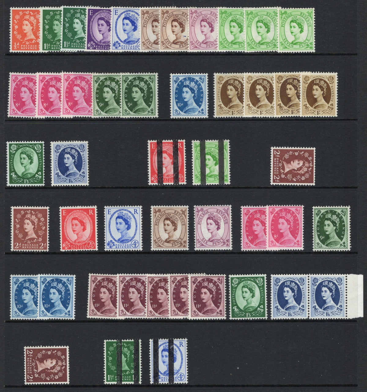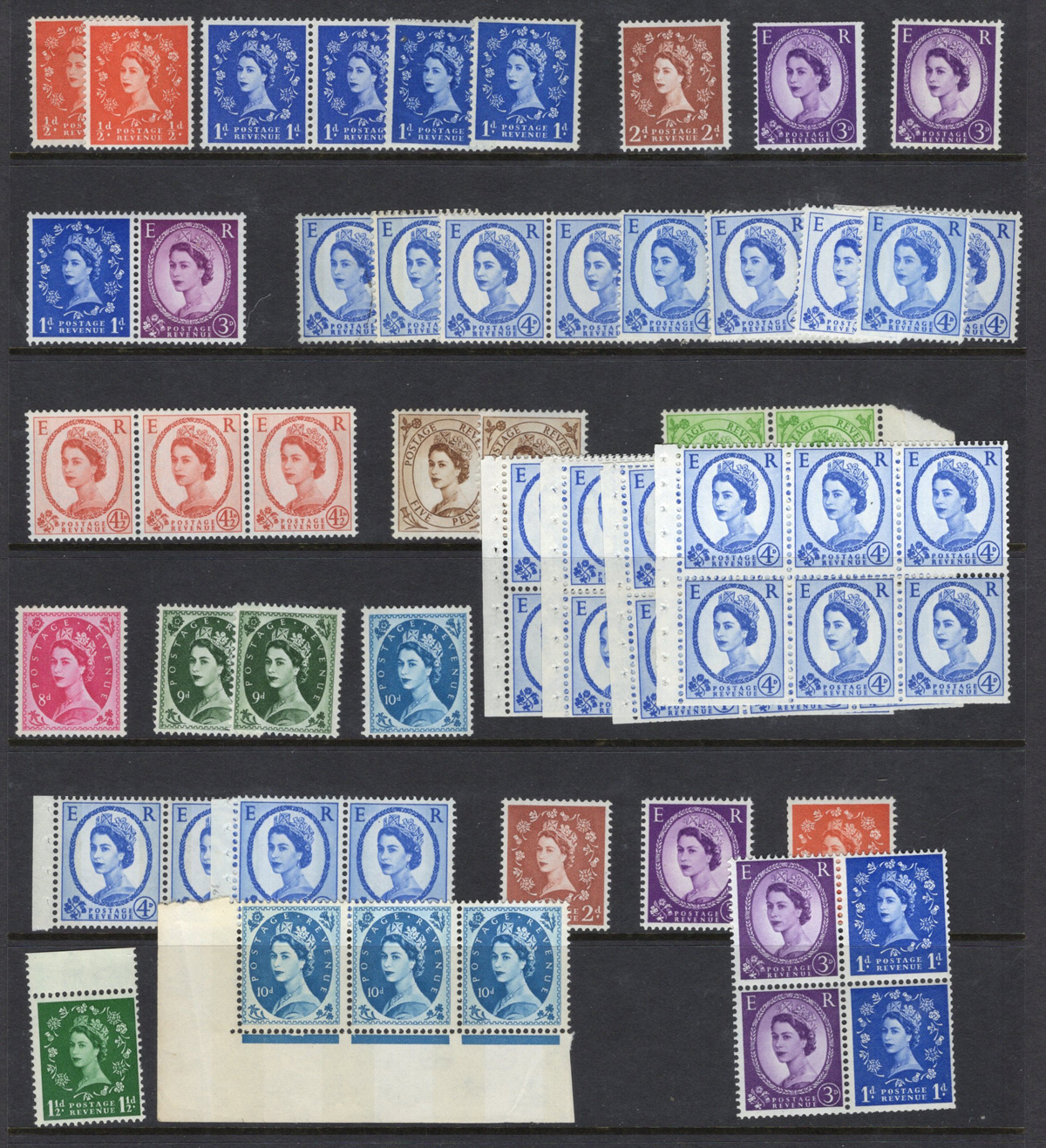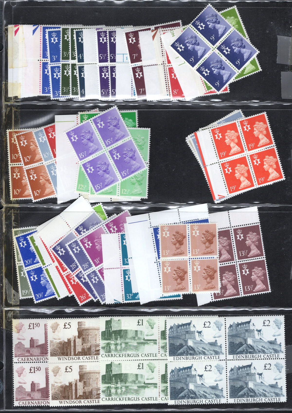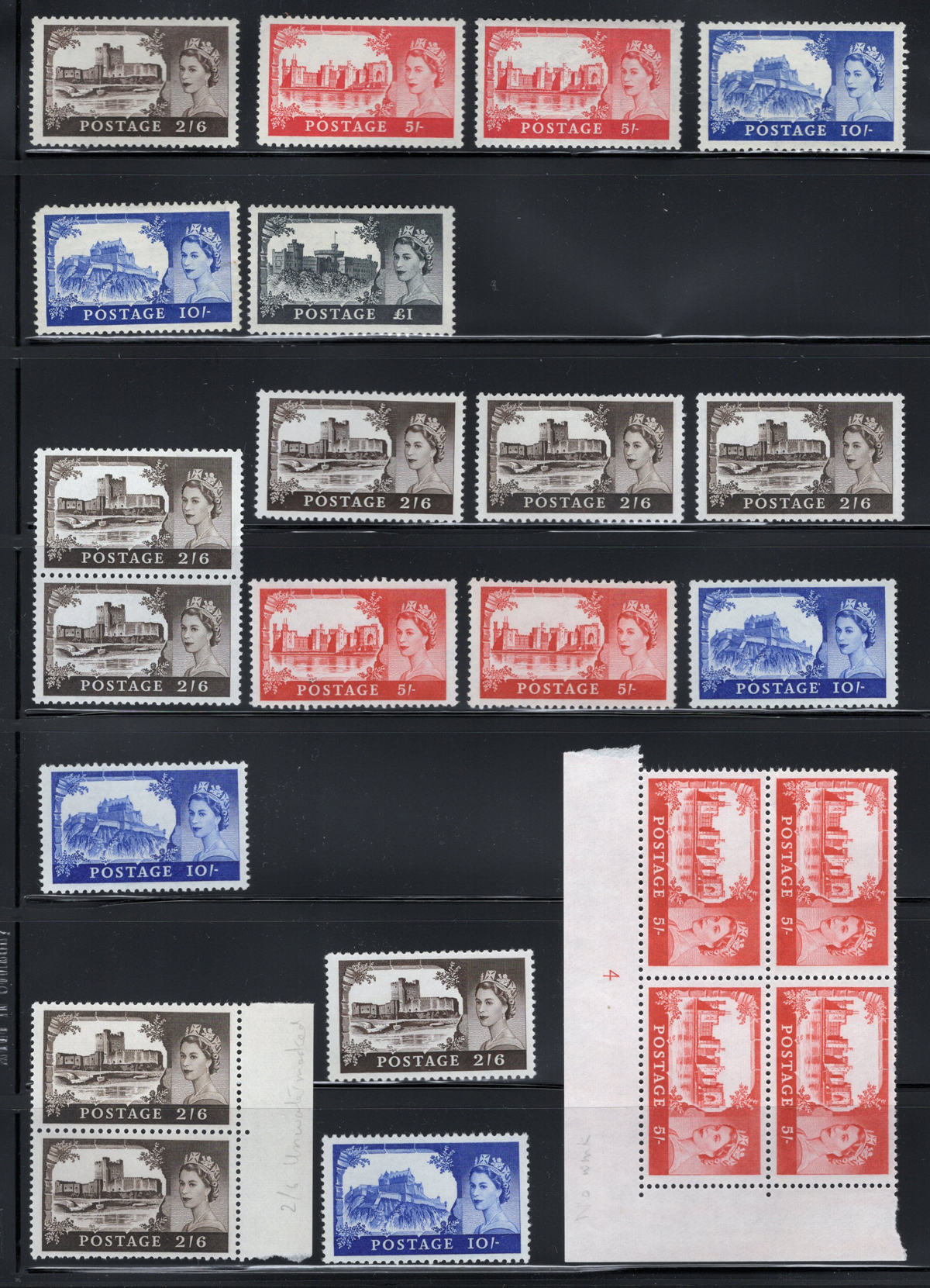 666 O/og/nh   imageCollection / Accumulation of Queen Elizabeth II Definitive Issues, in stock pages in a binder and on album pages. In the binder we note a page of mint Castles (a selection from all three printings, Scott c.v. about $458), followed by a collection of mint QEII Wilding issues filling three pages, with phosphor, complete sets, etc. the rest being 14 pages crammed with a holding of mint Machin issues, mostly in blocks of four, including a page full of "large format" high values, a block of 4 of the £10 value, etc. Also note an envelope containing over a dozen glassines full of more mint Machins and Wildings. Last but not least is a collection of Machins on 18 quadrille pages, mix of mint and used, covering a wide range of issues, incl. Regionals. Photos only show a portion of the lot, very fine throughout. (Scan 1) (Scan 2) (Scan 3) (Scan 4) (Scan 5) (Scan 6) (Scan 7) (Scan 8) (Scan 9) (Scan 10) (Scan 11) (All Scans) (All Images)
