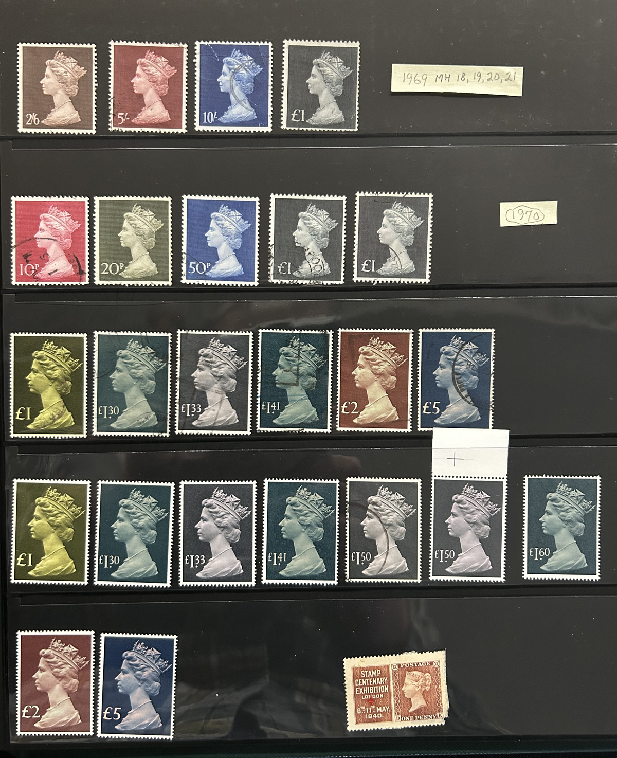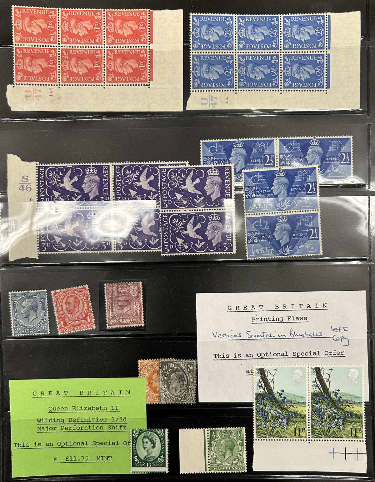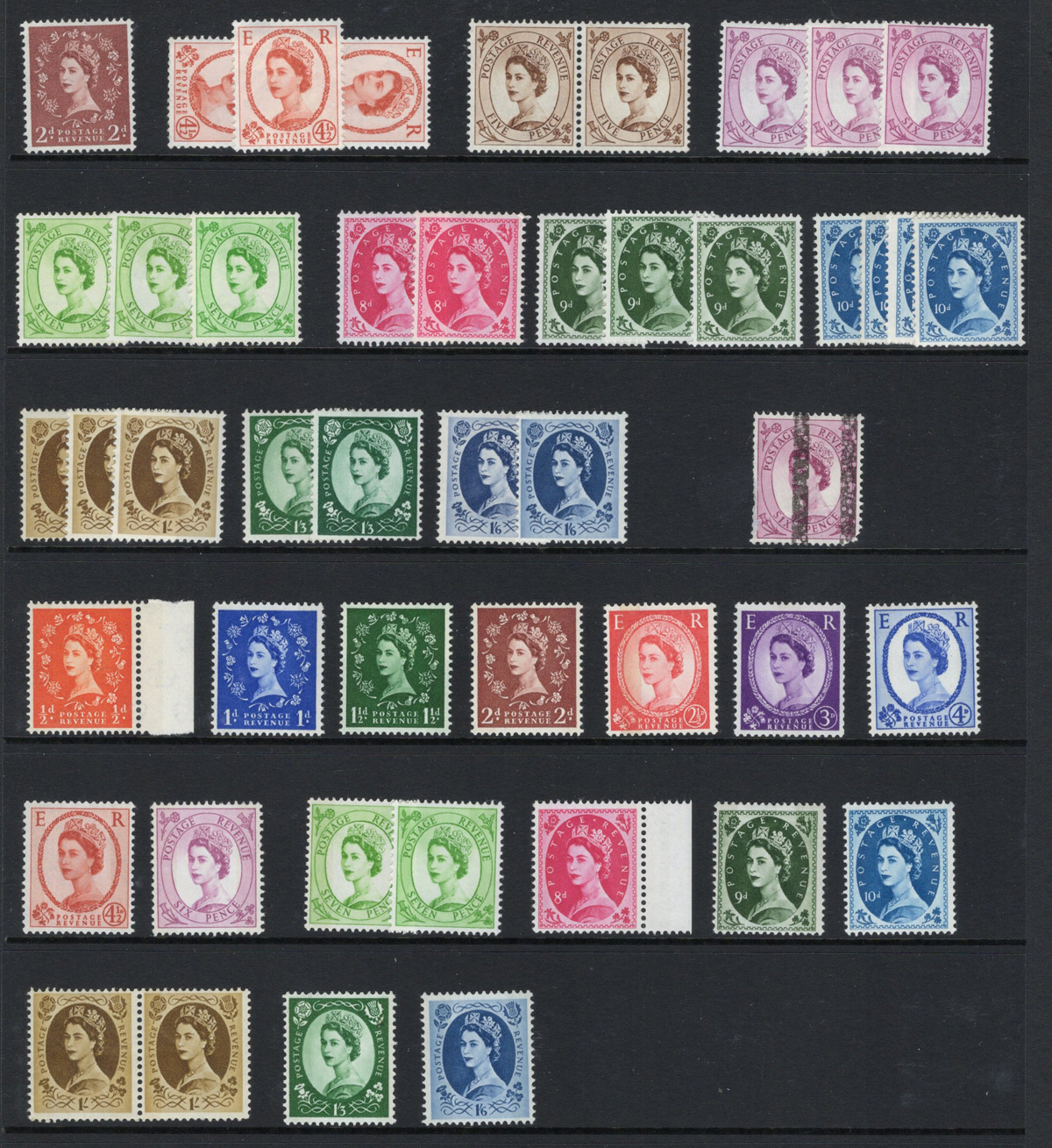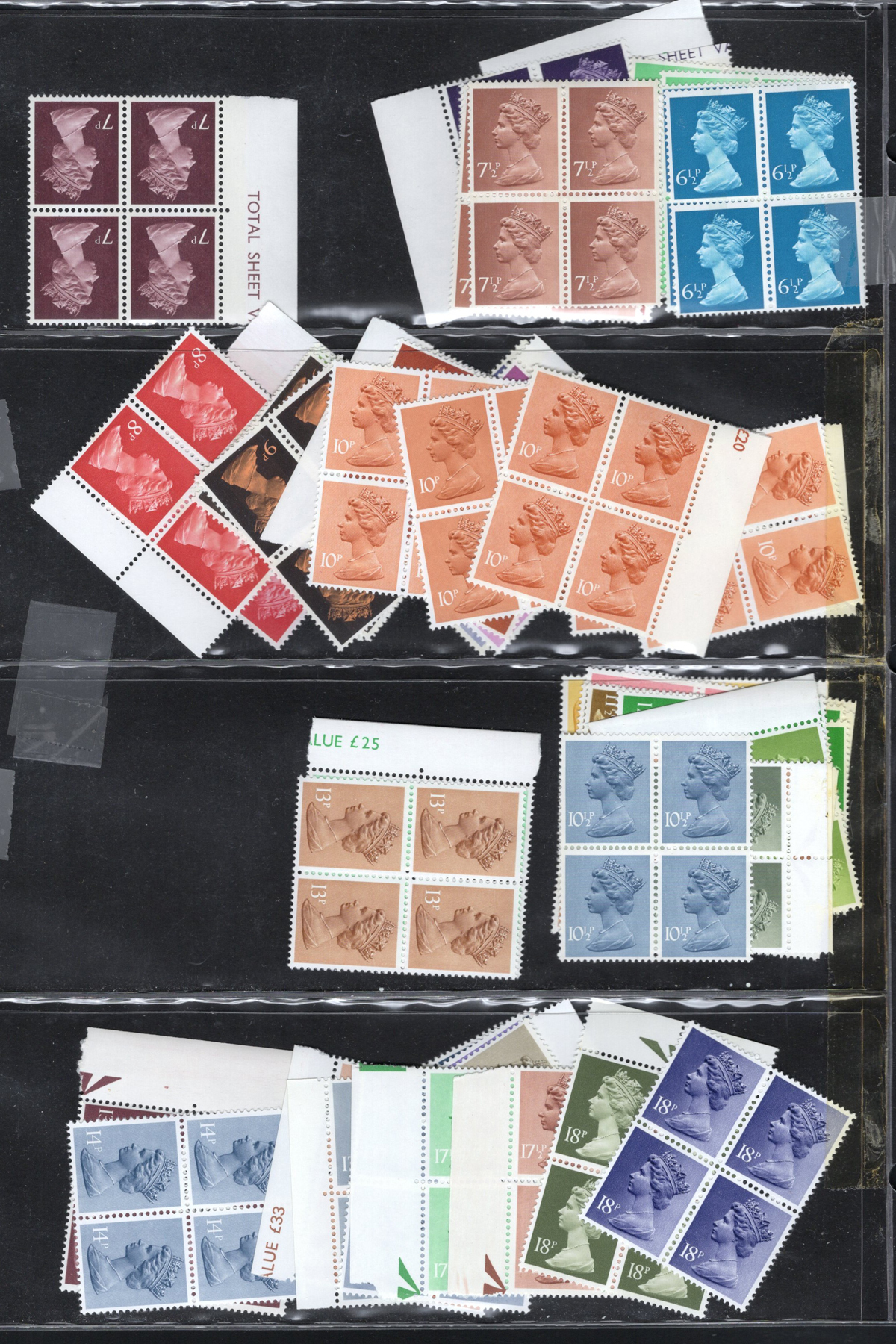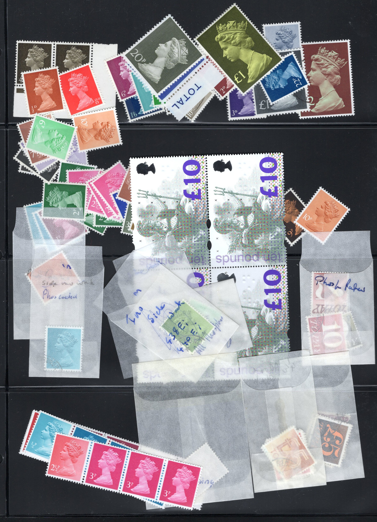 666 O/og/nh   imageCollection / Accumulation of Queen Elizabeth II Definitive Issues, in stock pages in a binder and on album pages. In the binder we note a page of mint Castles (a selection from all three printings, Scott c.v. about $458), followed by a collection of mint QEII Wilding issues filling three pages, with phosphor, complete sets, etc. the rest being 14 pages crammed with a holding of mint Machin issues, mostly in blocks of four, including a page full of "large format" high values, a block of 4 of the £10 value, etc. Also note an envelope containing over a dozen glassines full of more mint Machins and Wildings. Last but not least is a collection of Machins on 18 quadrille pages, mix of mint and used, covering a wide range of issues, incl. Regionals. Photos only show a portion of the lot, very fine throughout. (Scan 1) (Scan 2) (Scan 3) (Scan 4) (Scan 5) (Scan 6) (Scan 7) (Scan 8) (Scan 9) (Scan 10) (Scan 11) (All Scans) (All Images)