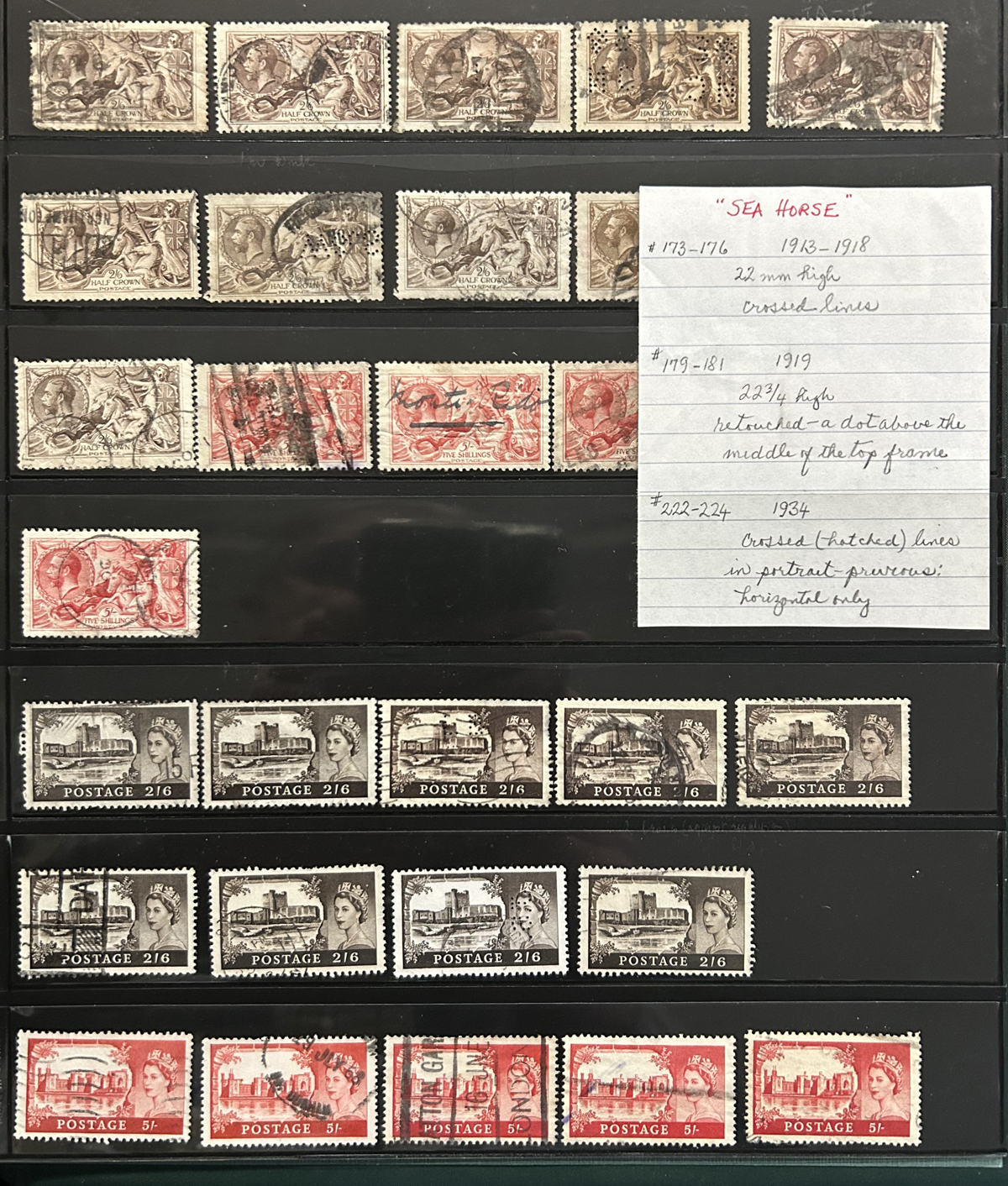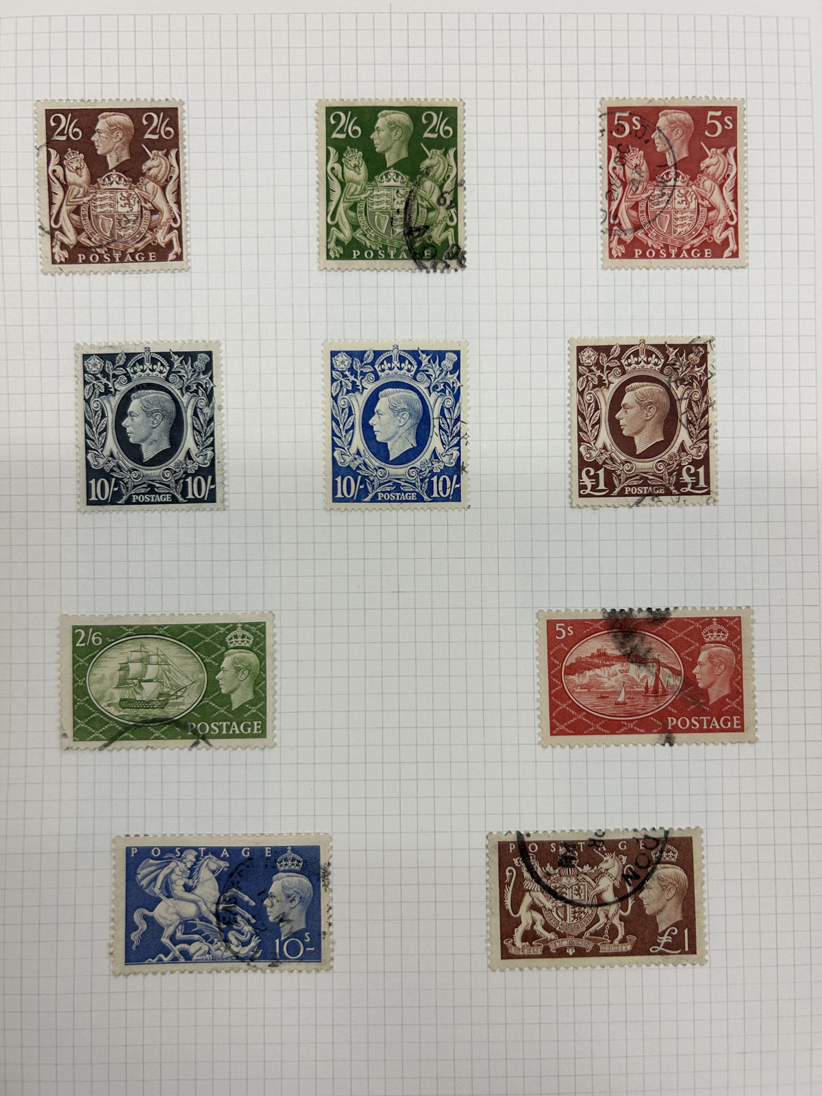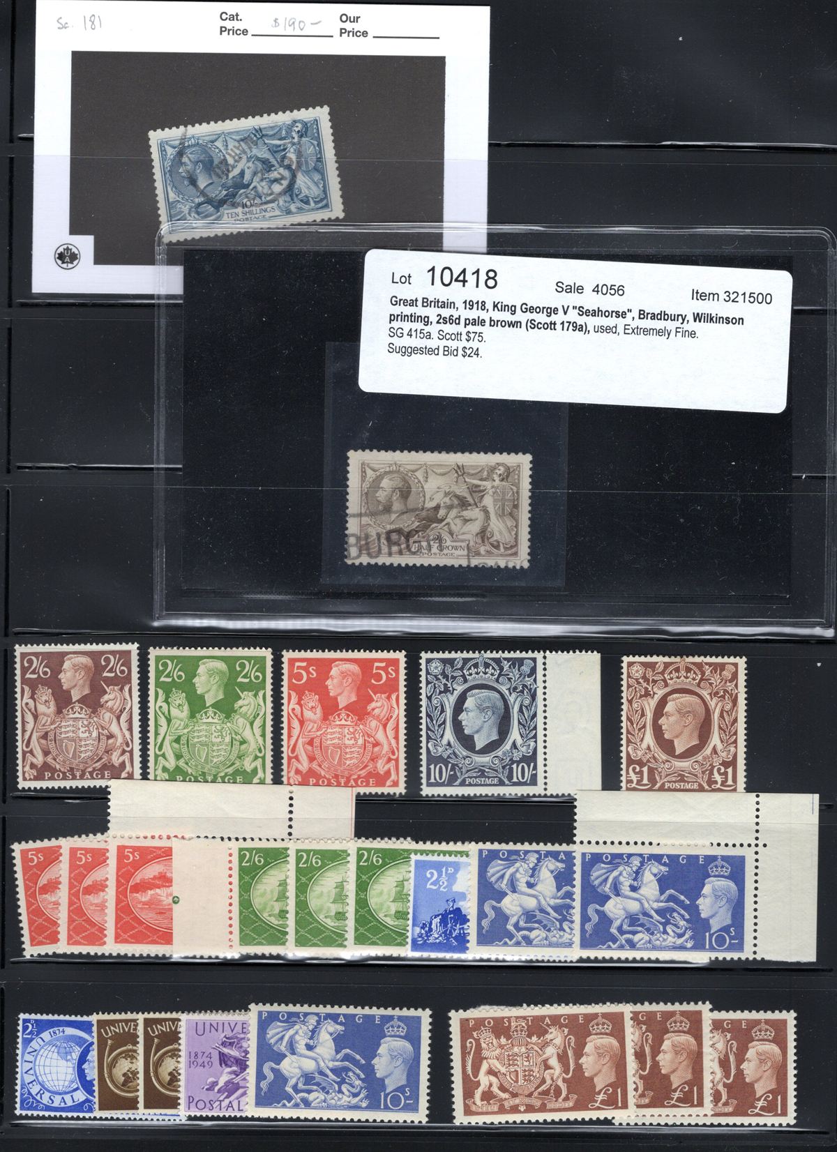 667 O/og/nh   imageCollection of Used Great Britain, KGV to the 1990s, neatly displayed on quadrille pages filling two S.G. Springback albums. King George V (incl. some Seahorses) issues fill 12 pages with shades, different printings, etc. KGVI is just as extensive and mostly complete, as well as QEII issues to the end and includes all the Castles, several souvenir sheets or se-tenant blocks, but no Machins. A very clean collection, with mostly choice cancels and good quality throughout. The lot is accompanied by mint and used filling dozens of glassines, a small stockbook and a stock page, noting several high denomination KGVI issues to the £ (mint, Scott c.v. $467 alone) as well as many KGV and KEVII issues with some watermark varieties, shades, etc. Well worth a close look as there should be good value in there. Overall fine or better, our photos only show a small portion of the lot. (Scan 1) (Scan 2) (Scan 3) (Scan 4) (Scan 5) (Scan 6) (Scan 7) (Scan 8) (Scan 9) (Scan 10) (Scan 11) (Scan 12) (Scan 13) (Scan 14) (Scan 15) (All Scans) (All Images)