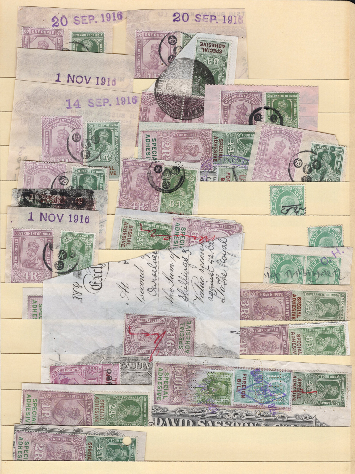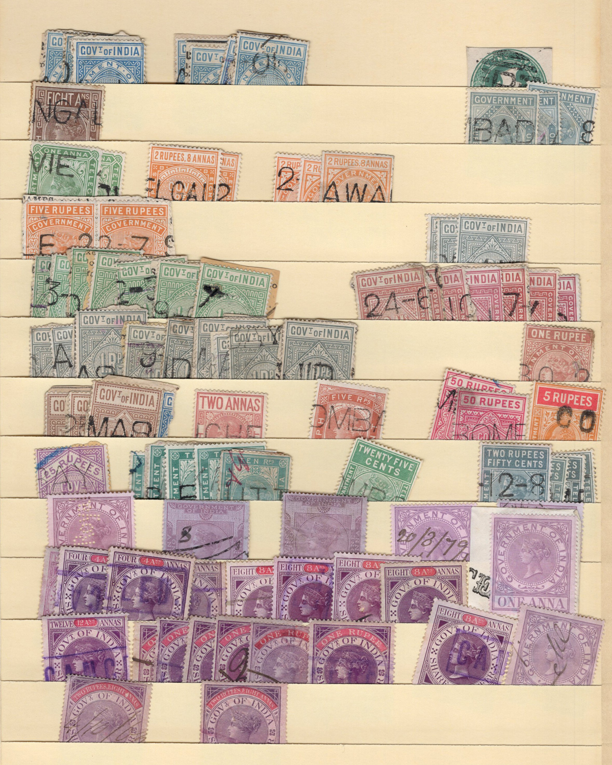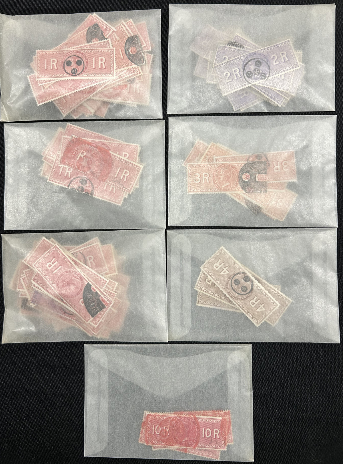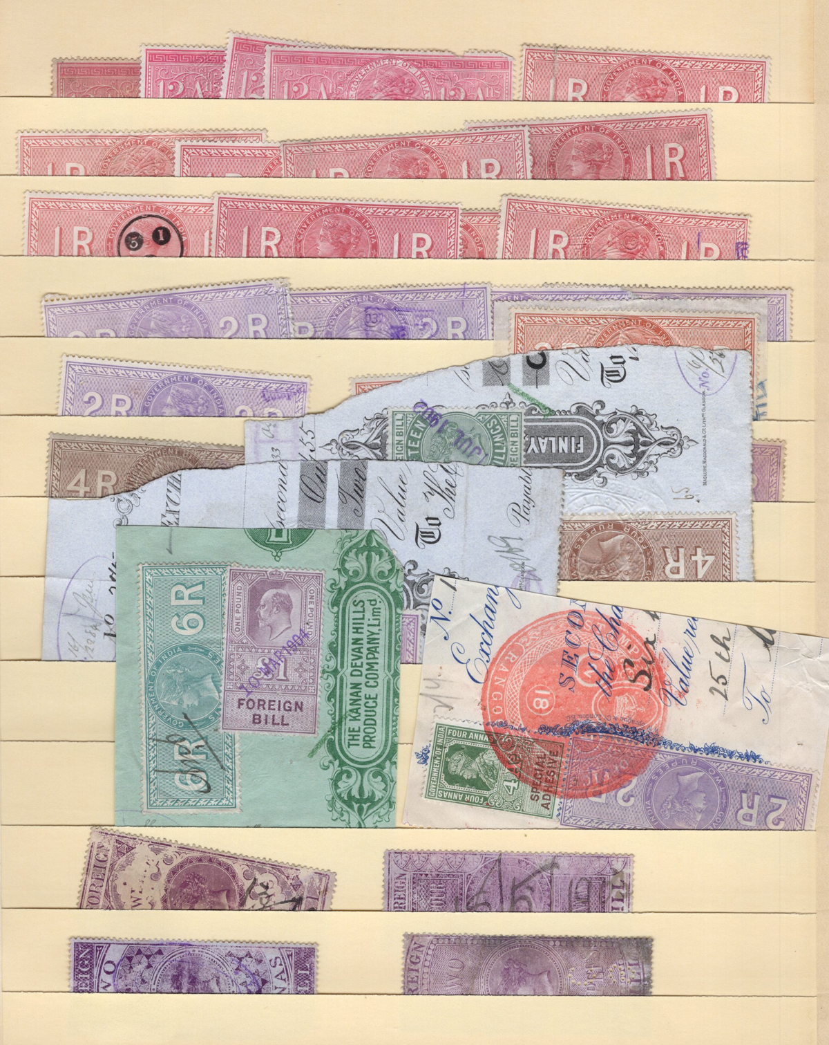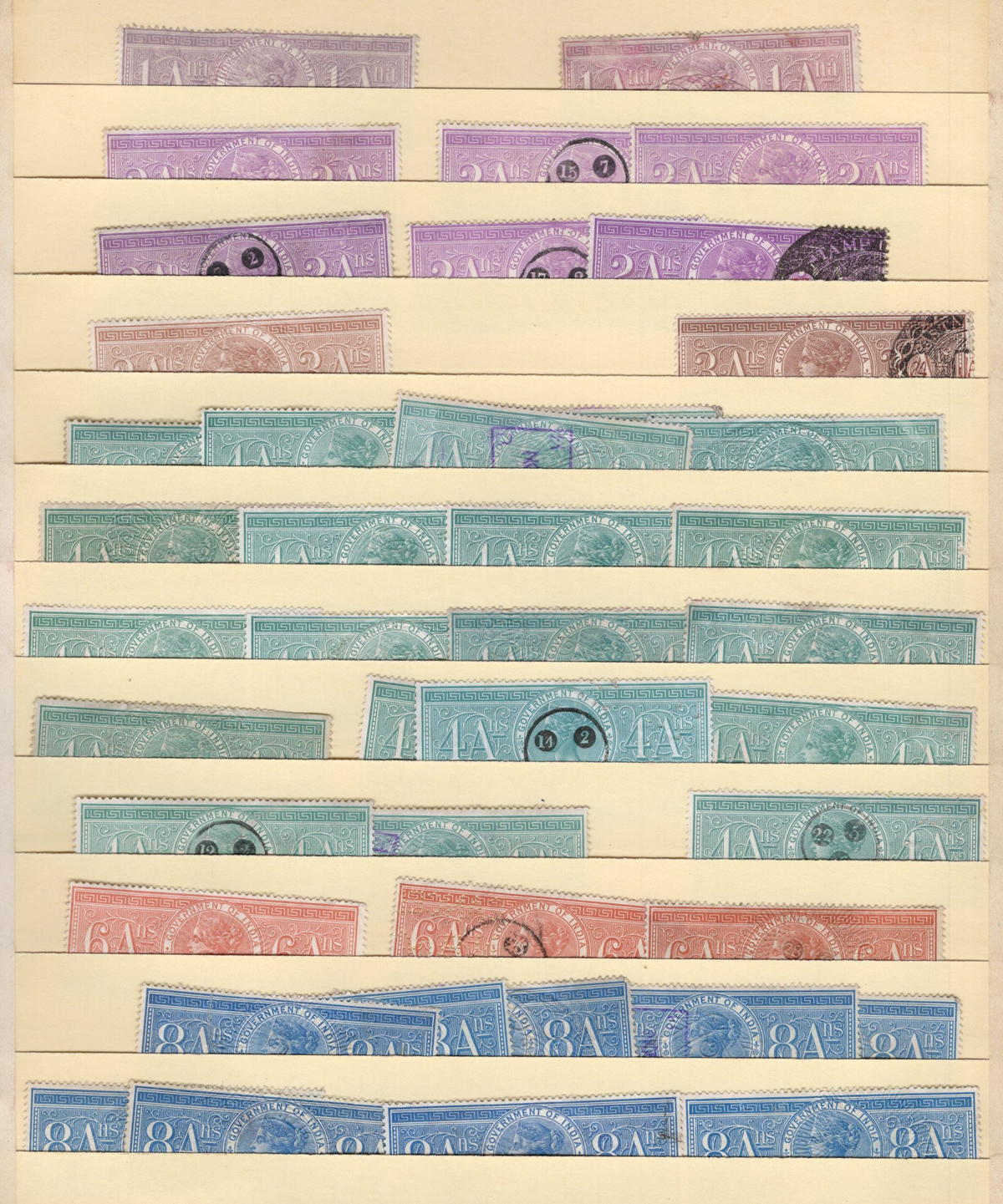 676 O   imageGroup / Stock of Used India Queen Victoria Revenue Stamps, listed in Barefoot as the 1868 "Special Adhesive" new colours, with the following values, each in glassines: 1a dull lilac (x1, from the earlier printing), 2a bright lilac (x12), 3a brown (x29), 4a green (x44), 6a brown (x10), 8a blue (x98), 12a red (x15), 1R red (x139), 2R dull violet (x27), 3R brown (x10), 4R brown (x4), and 10R red (x3). A good quality lot, with potential for cancels, etc. See pictures for an overview. (Scan 1) (Scan 2) (All Scans) (All Images)