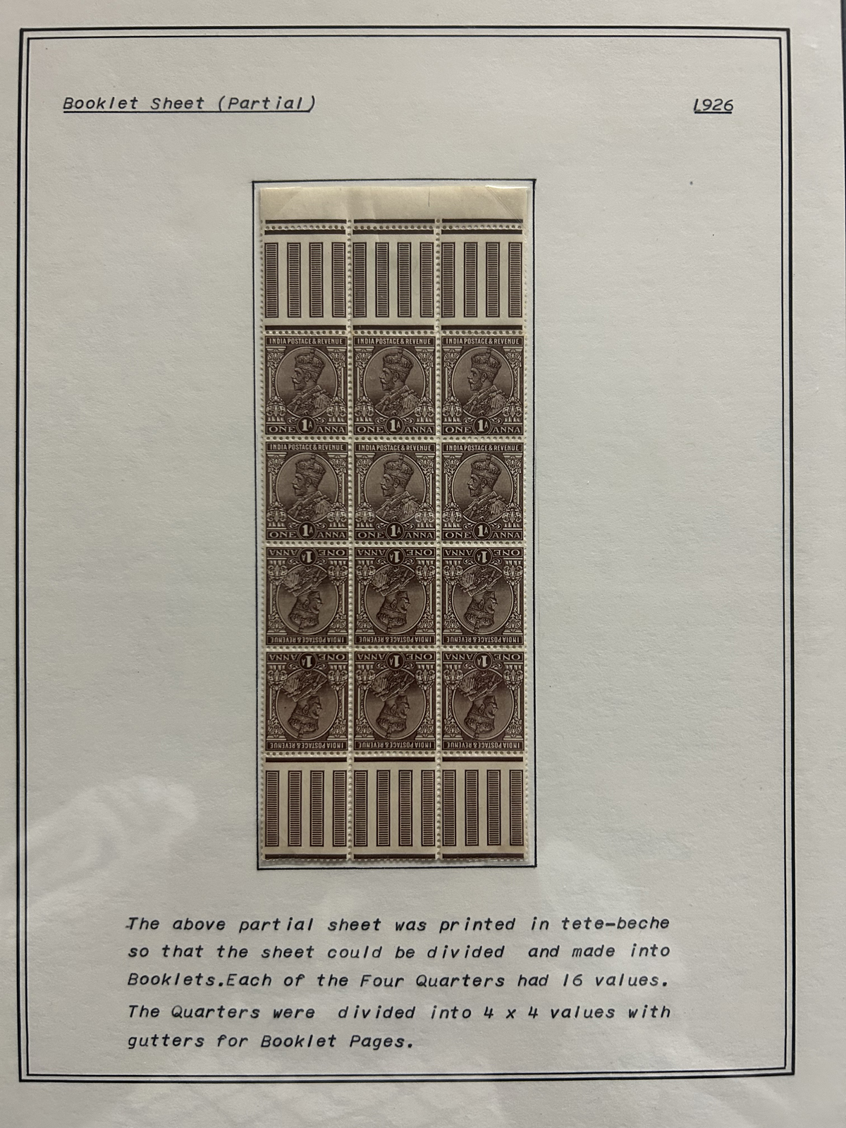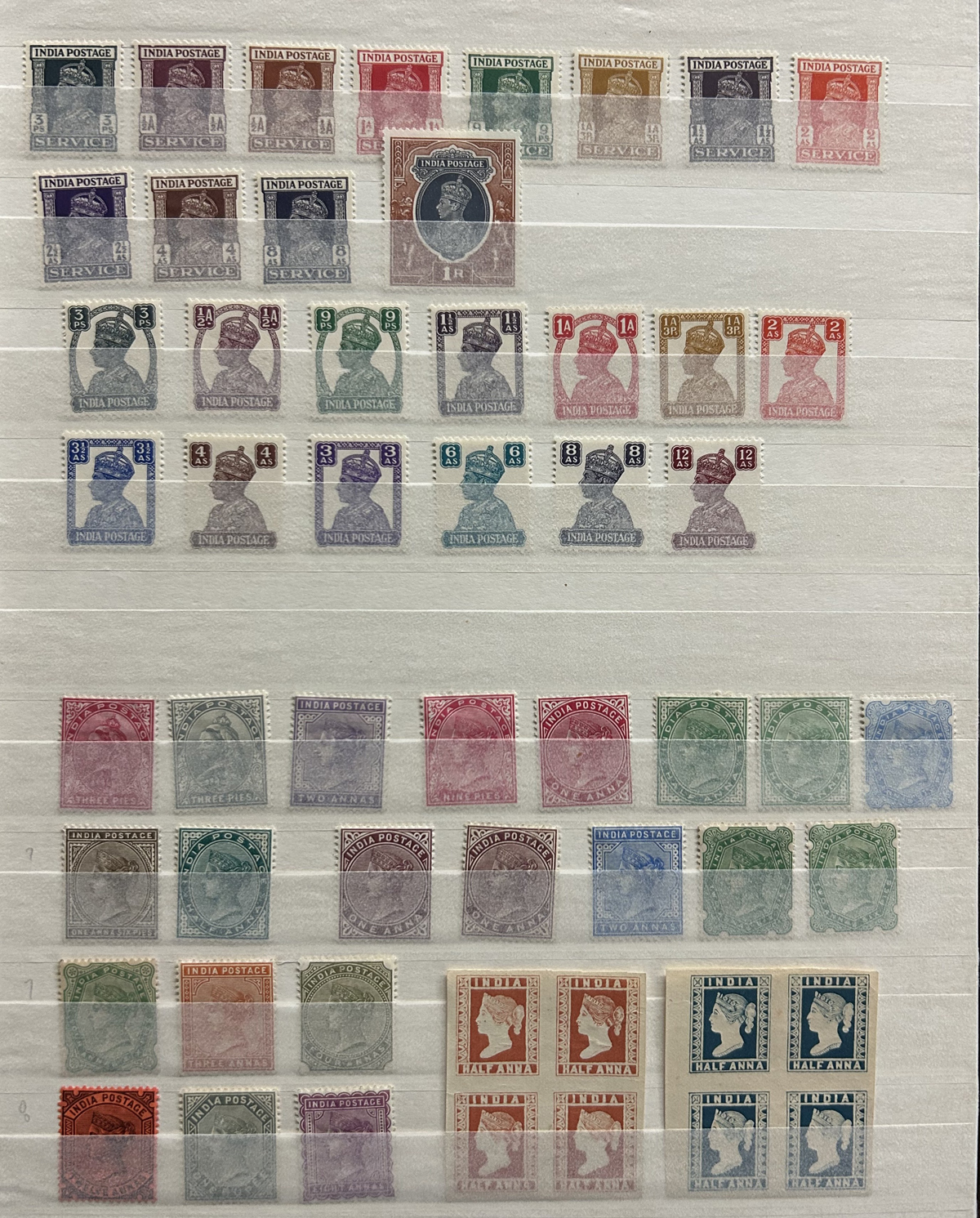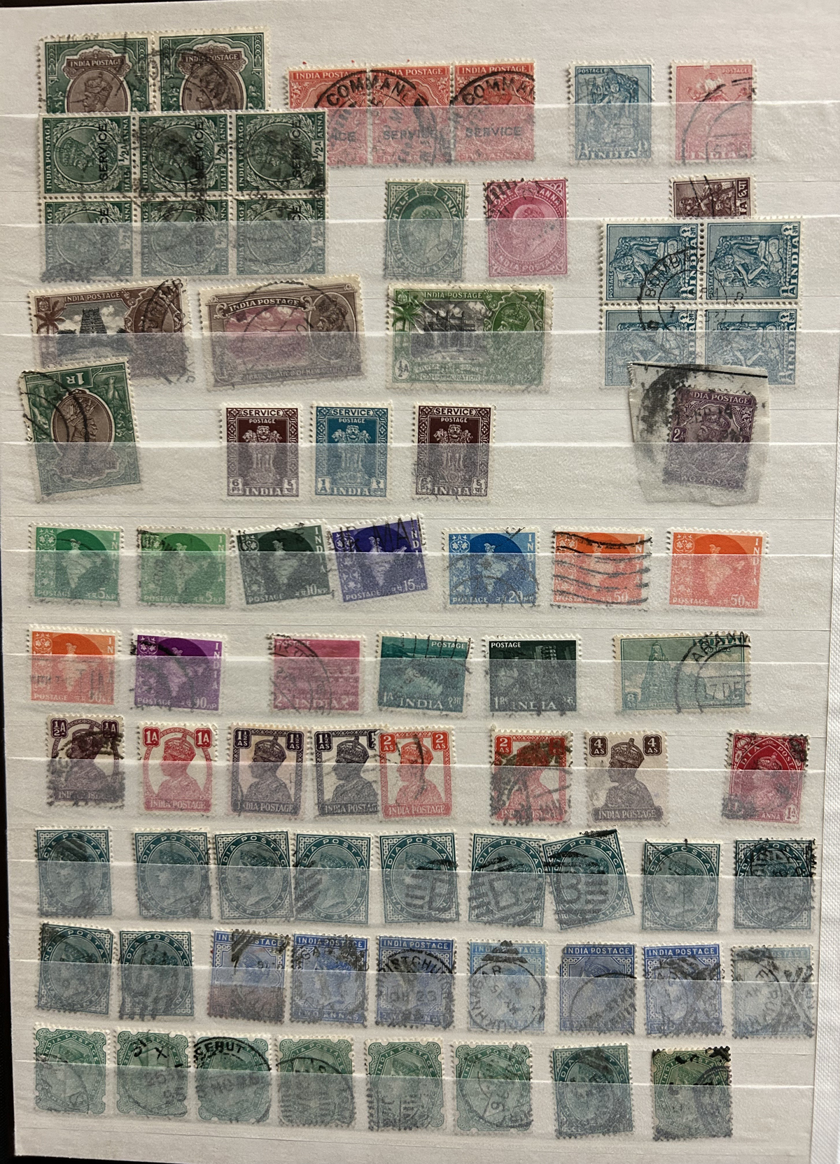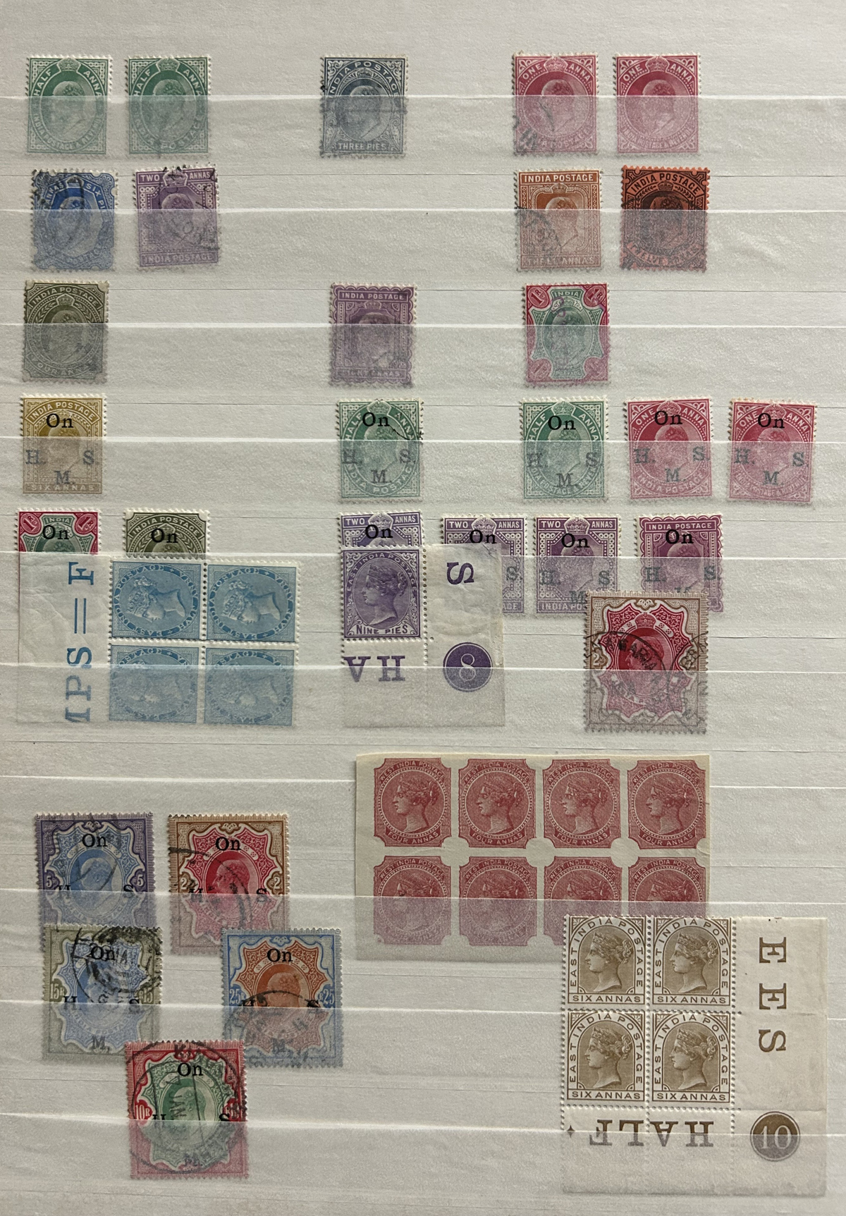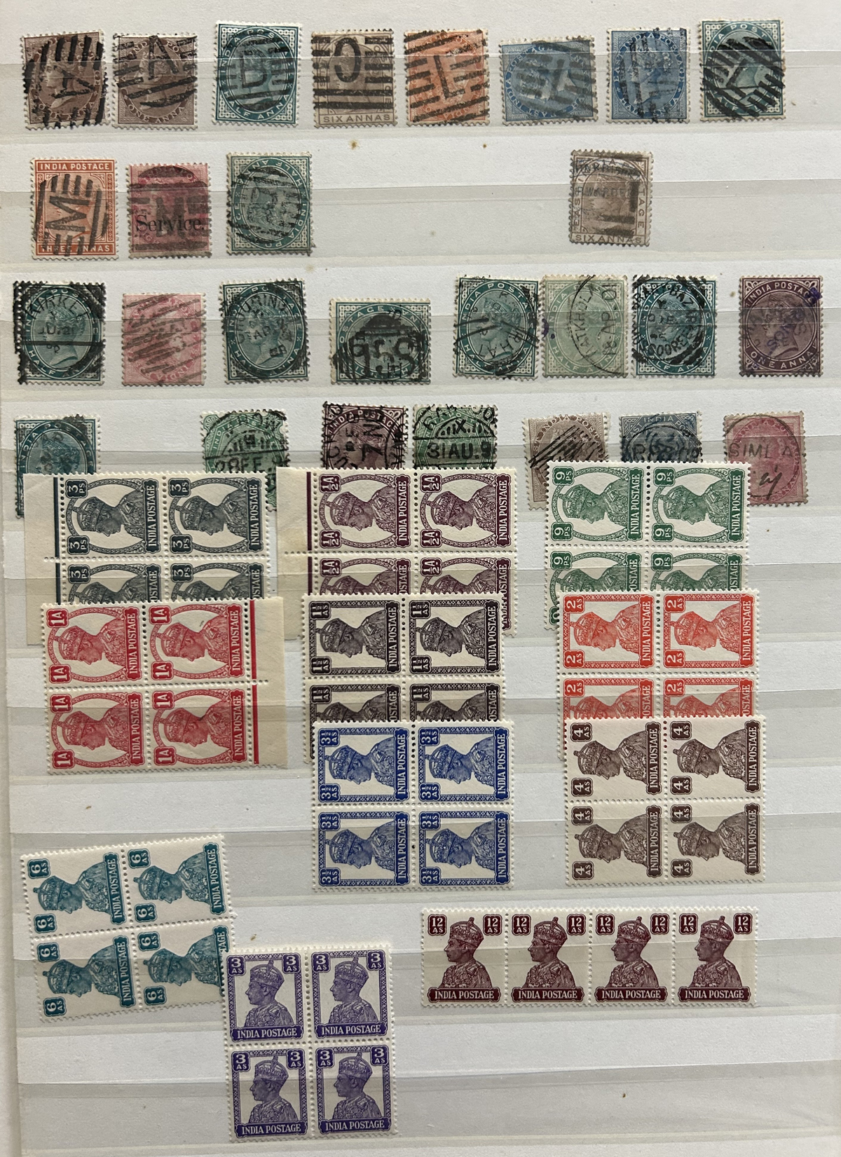 680 O/og/nh   imageStockbook Full of Interesting Mint and Used India Issues, a good variety of material which includes 11 stamps overprinted POSTAL SERVICE, several KGV booklet panes or tête-bêche multiples, a print of a full sheet of the first India East Company issue of 1854, die sunk on card (plate II), a good number of mint QV, KEVII, KGV and KGVI issues, including high values, a block of 8 of what appears to be an essay or proof of Scott #26 in claret, a mint margin block of 4 of Scott O76b (double overprint) as well as lots more, including pages of used issues many with postmark interest. Overall fine to very fine. viewing our sample pictures will give a better idea of the value within. (Scan 1) (Scan 2) (Scan 3) (Scan 4) (Scan 5) (Scan 6) (Scan 7) (Scan 8) (Scan 9) (Scan 10) (All Scans) (All Images)