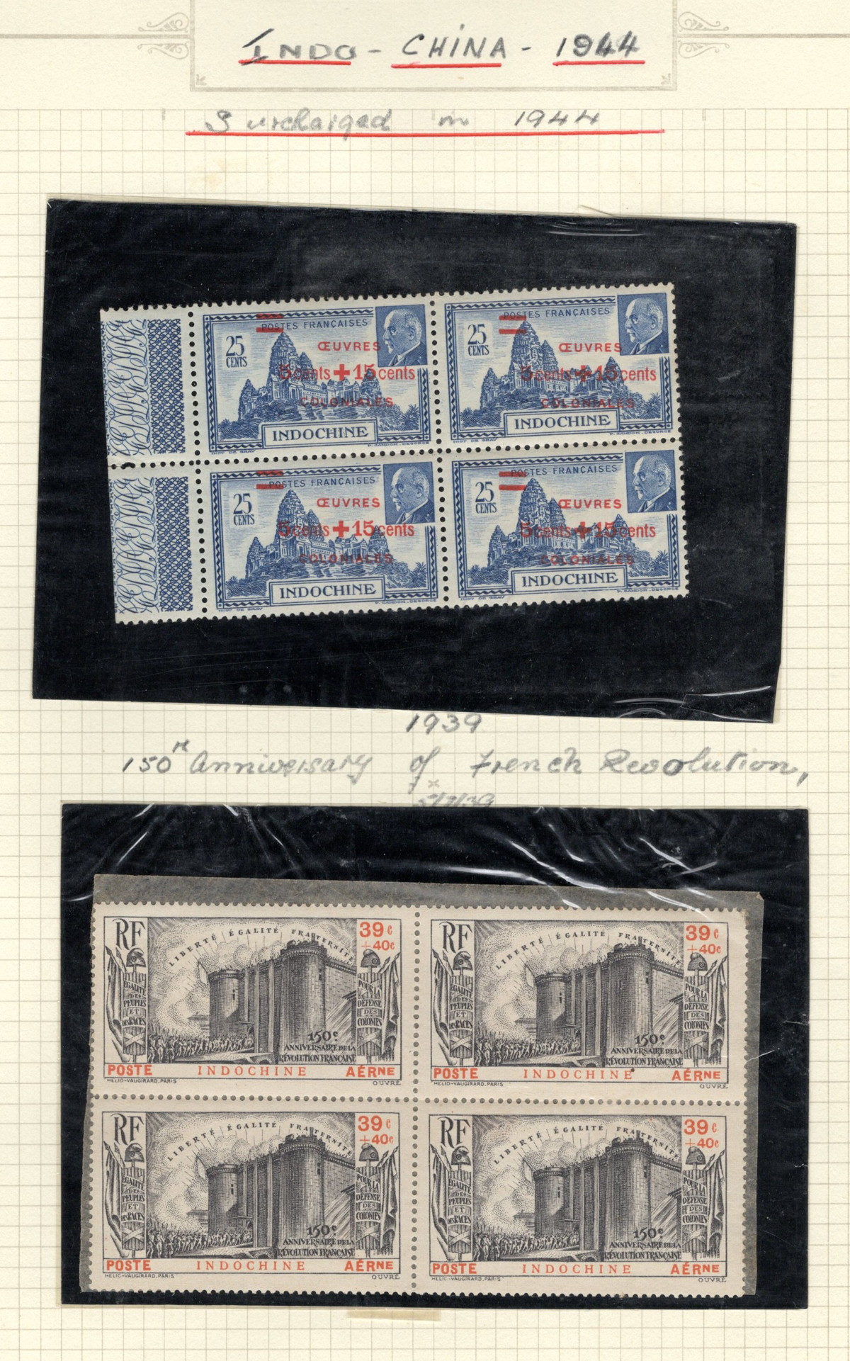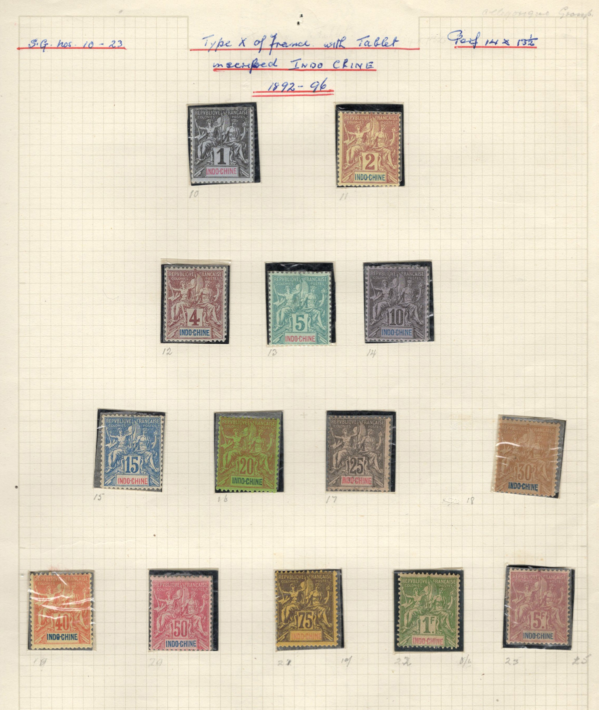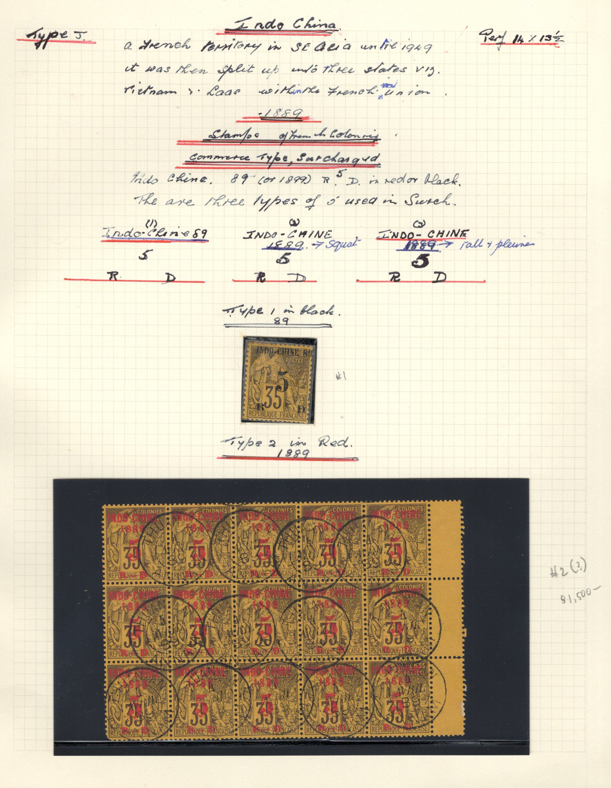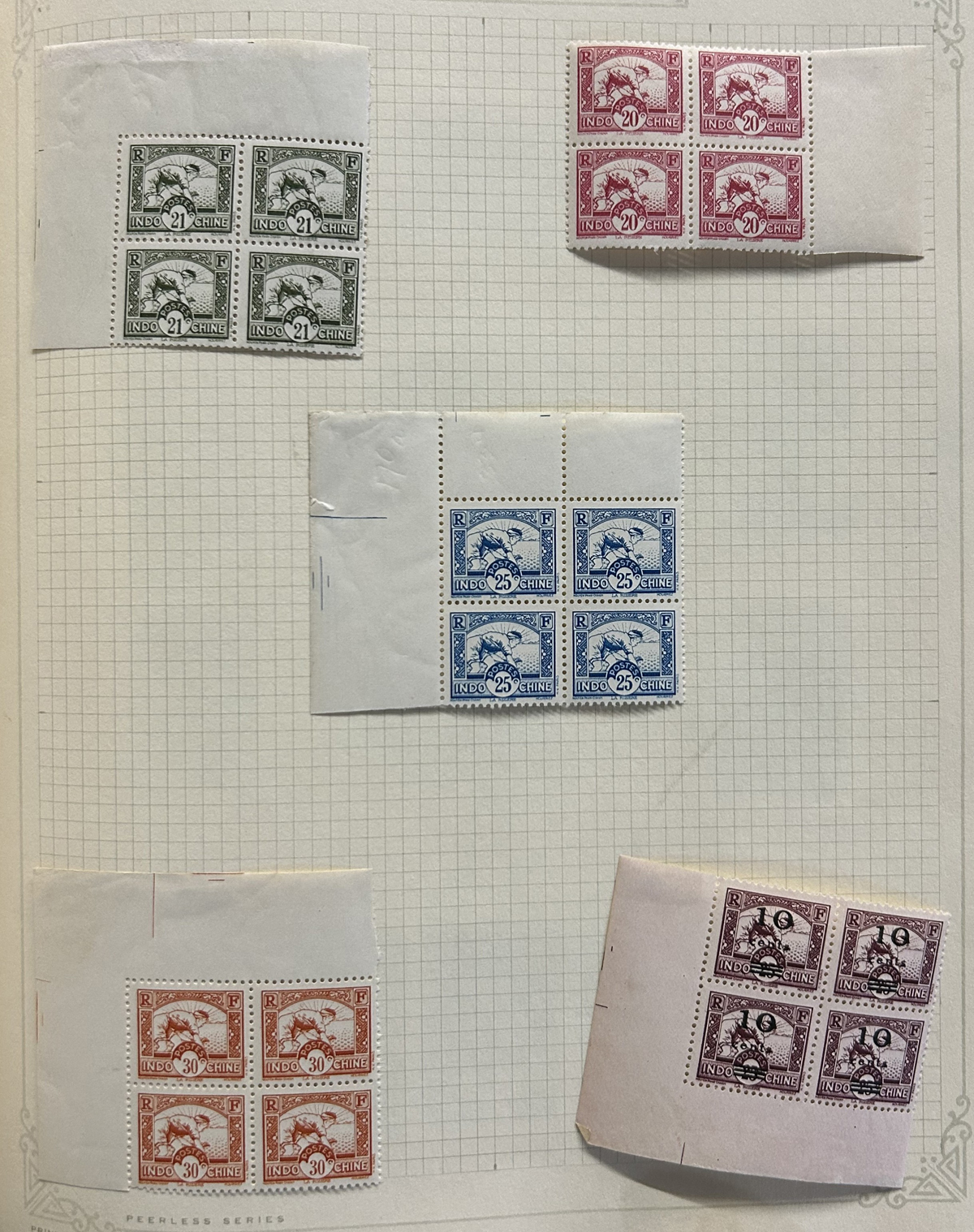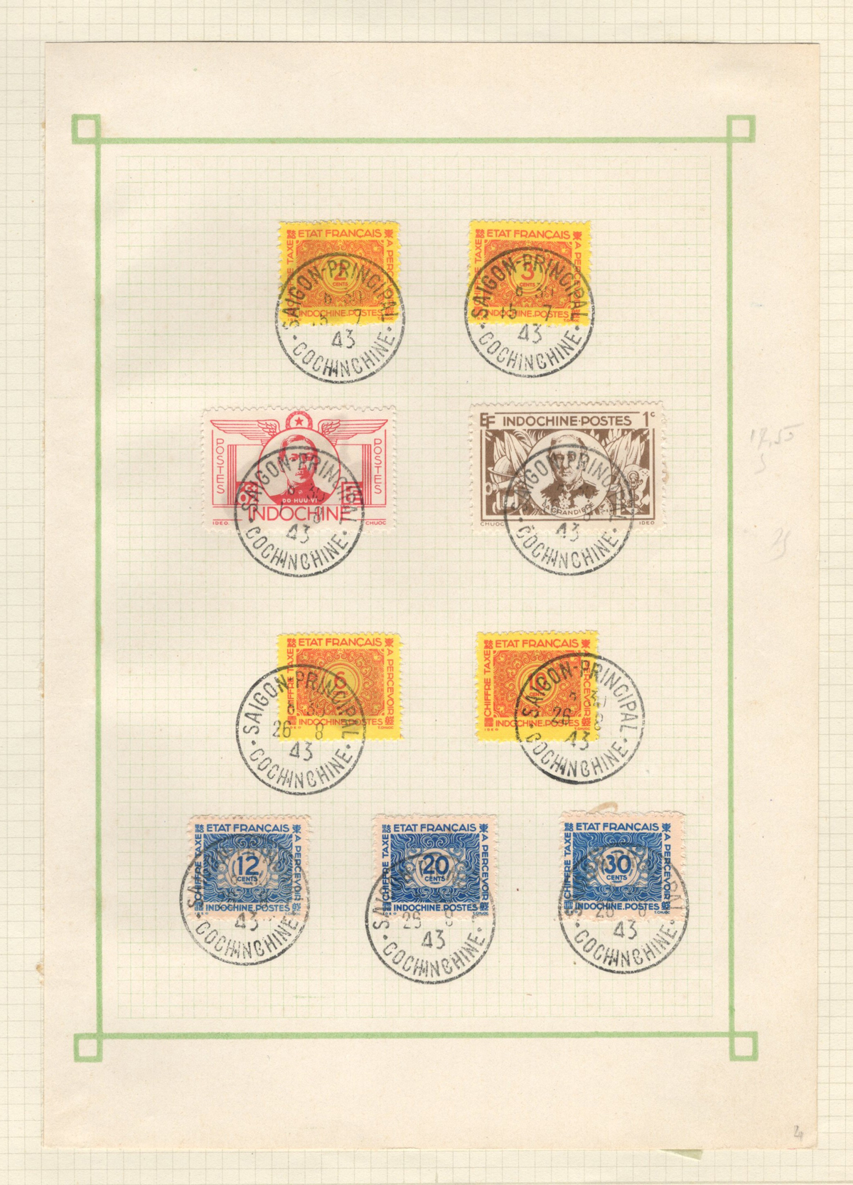 684 O/og/nh   imageOld Time Extensive Collection of French Indo-China, 1889 to 1946, all on about 80 quadrille pages. This collection has an excellent coverage of the material issued in the period, with regular issues, Postage Dues, Airmail, Semi-Postals and Officials. Starts off strong, with Scott #s 2 (a lovely sheet margin block of 15, with c.d.s. from Thuan-An / Annam, which if a genuine block would catalogue $1,500 - we can provide a high quality scan of this item - just ask), 3/21 (partial mint set, $421), 24/40 (mint, missing only the 10c, $567), same partial set but used ($367, not including two "millésime" pairs), mint and used surcharges 59/94 ($487), 41-58 (mint, $328), same set but used ($275), same set but surcharged 65/82 (mint, missing #74, $390 and used, $293), and so on to the end, often with both mint and used issues, plus mint blocks, first day souvenir sheets, noted #s B8-B13 (two mint sets, $242 each), used ($242), J18-J30 (mint, $172), O17-O32 (mint, $147), and much more, including a few covers of the era. The many mint stamps are encapsulated in mounts, and so we have only checked a half-dozen for gum, half of which were NH. A few faults here and there, still an overall fine to very fine, and quite valuable collection. Our scans only show a small portion. (Scan 1) (Scan 2) (Scan 3) (Scan 4) (Scan 5) (Scan 6) (Scan 7) (Scan 8) (Scan 9) (Scan 10) (Scan 11) (Scan 12) (Scan 13) (Scan 14) (Scan 15) (Scan 16) (Scan 17) (Scan 18) (All Scans) (All Images)