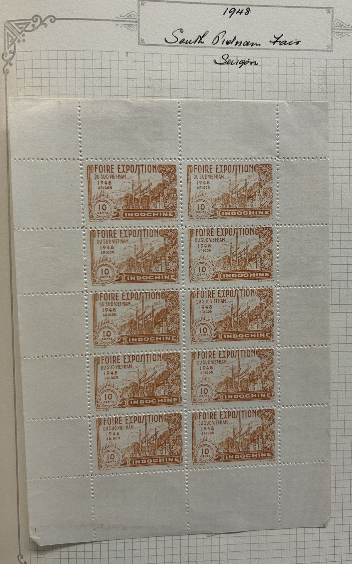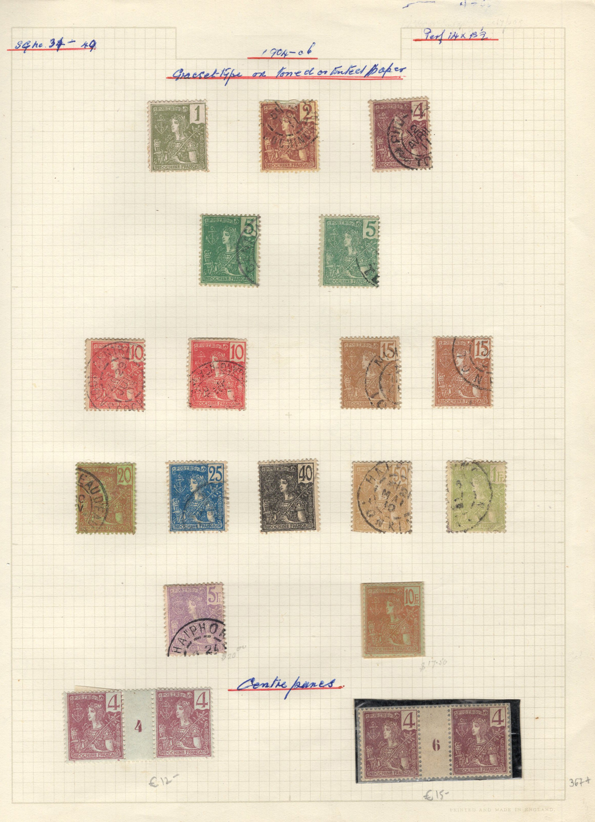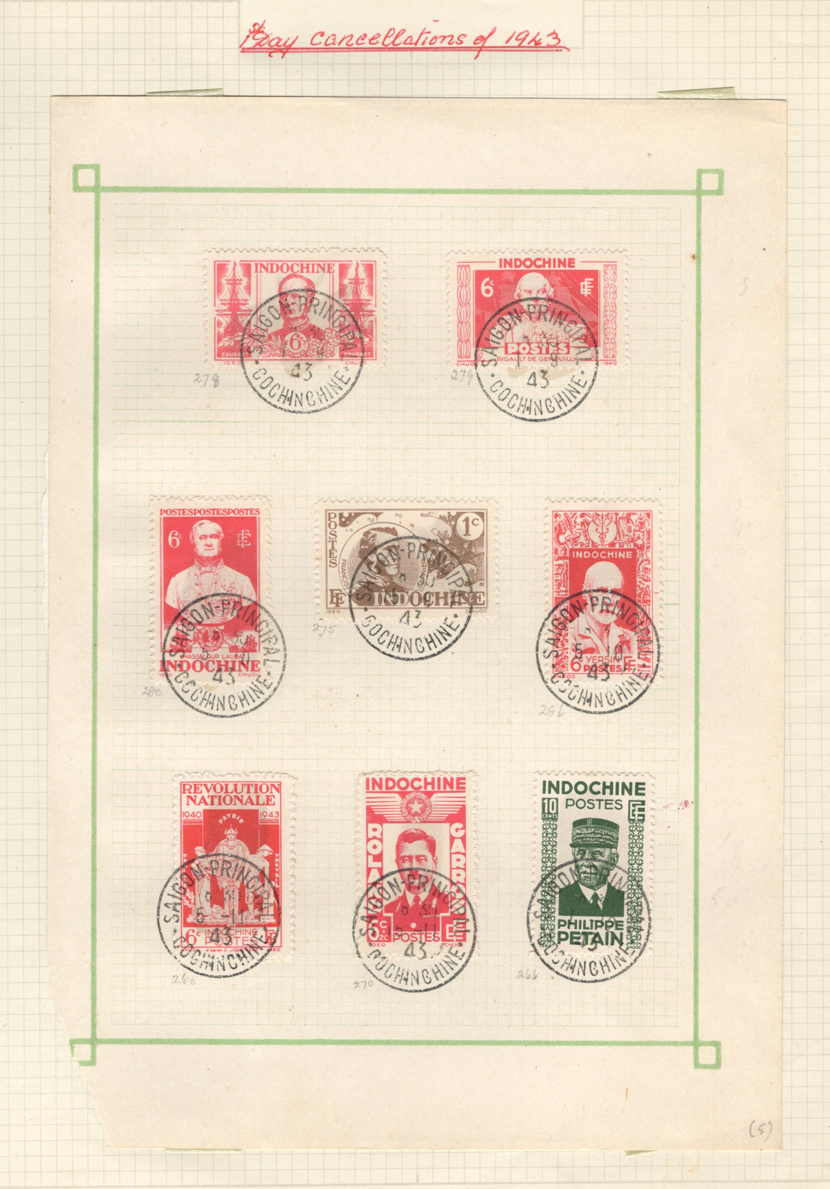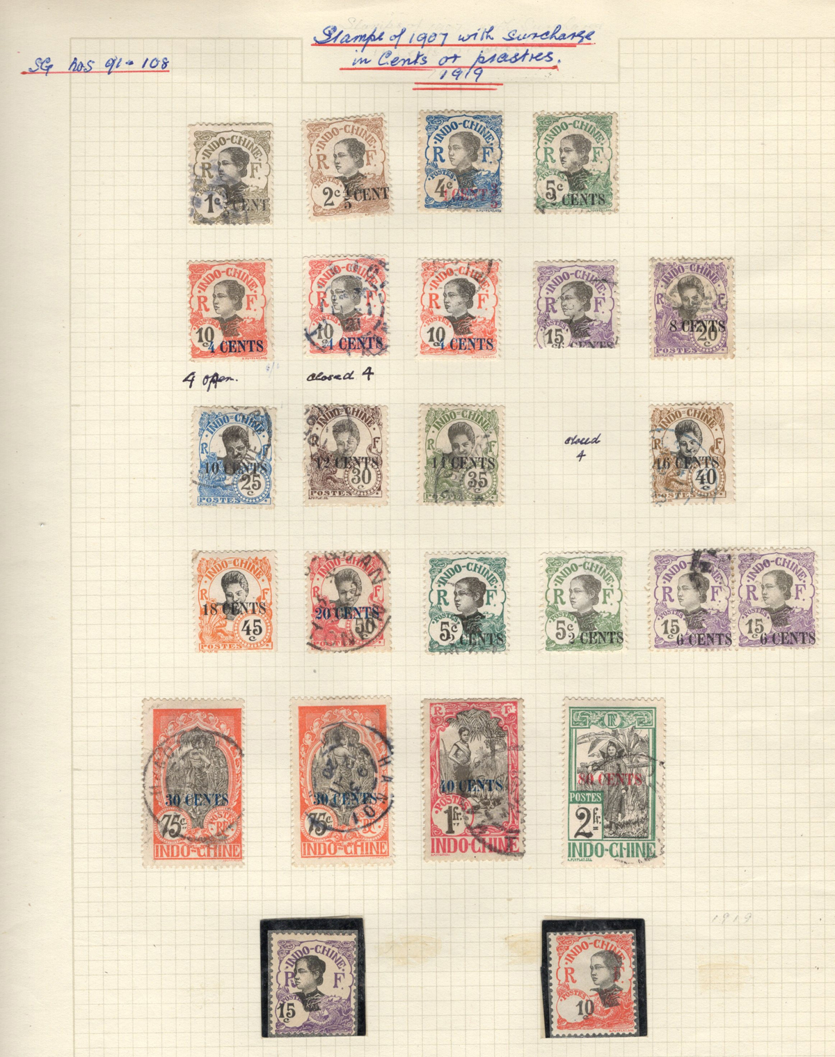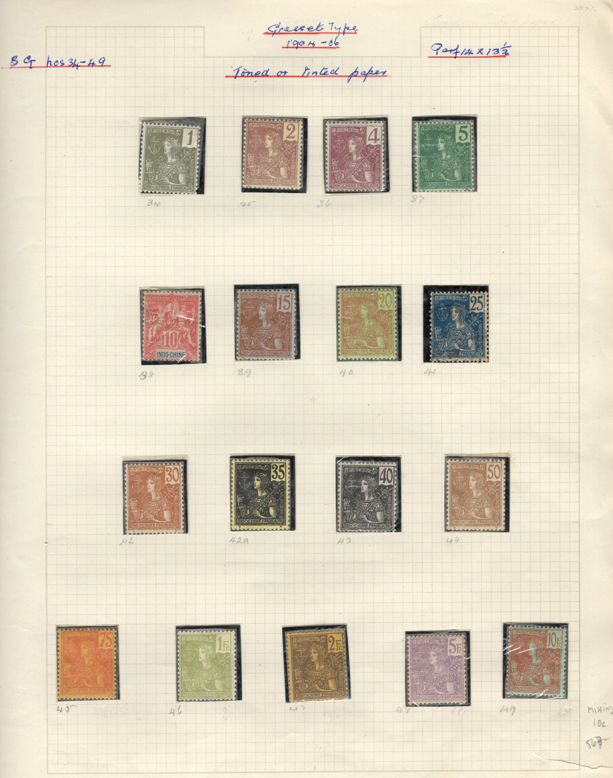 684 O/og/nh   imageOld Time Extensive Collection of French Indo-China, 1889 to 1946, all on about 80 quadrille pages. This collection has an excellent coverage of the material issued in the period, with regular issues, Postage Dues, Airmail, Semi-Postals and Officials. Starts off strong, with Scott #s 2 (a lovely sheet margin block of 15, with c.d.s. from Thuan-An / Annam, which if a genuine block would catalogue $1,500 - we can provide a high quality scan of this item - just ask), 3/21 (partial mint set, $421), 24/40 (mint, missing only the 10c, $567), same partial set but used ($367, not including two "millésime" pairs), mint and used surcharges 59/94 ($487), 41-58 (mint, $328), same set but used ($275), same set but surcharged 65/82 (mint, missing #74, $390 and used, $293), and so on to the end, often with both mint and used issues, plus mint blocks, first day souvenir sheets, noted #s B8-B13 (two mint sets, $242 each), used ($242), J18-J30 (mint, $172), O17-O32 (mint, $147), and much more, including a few covers of the era. The many mint stamps are encapsulated in mounts, and so we have only checked a half-dozen for gum, half of which were NH. A few faults here and there, still an overall fine to very fine, and quite valuable collection. Our scans only show a small portion. (Scan 1) (Scan 2) (Scan 3) (Scan 4) (Scan 5) (Scan 6) (Scan 7) (Scan 8) (Scan 9) (Scan 10) (Scan 11) (Scan 12) (Scan 13) (Scan 14) (Scan 15) (Scan 16) (Scan 17) (Scan 18) (All Scans) (All Images)