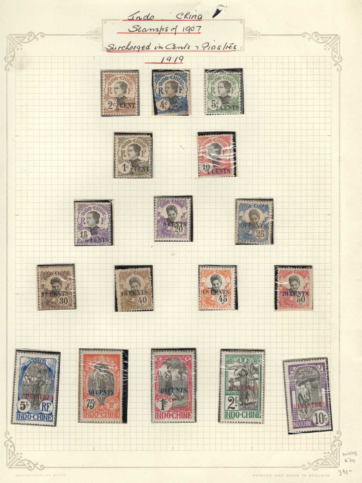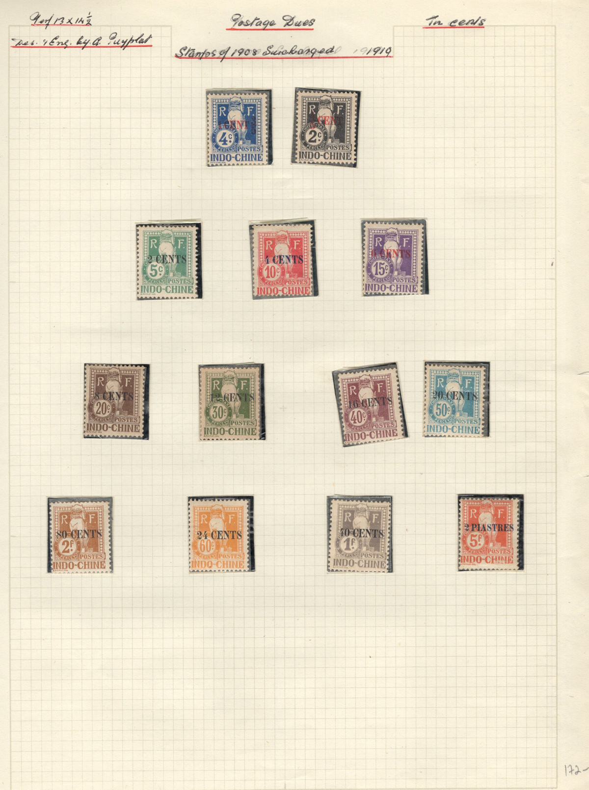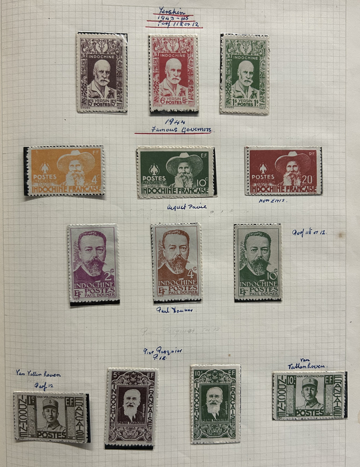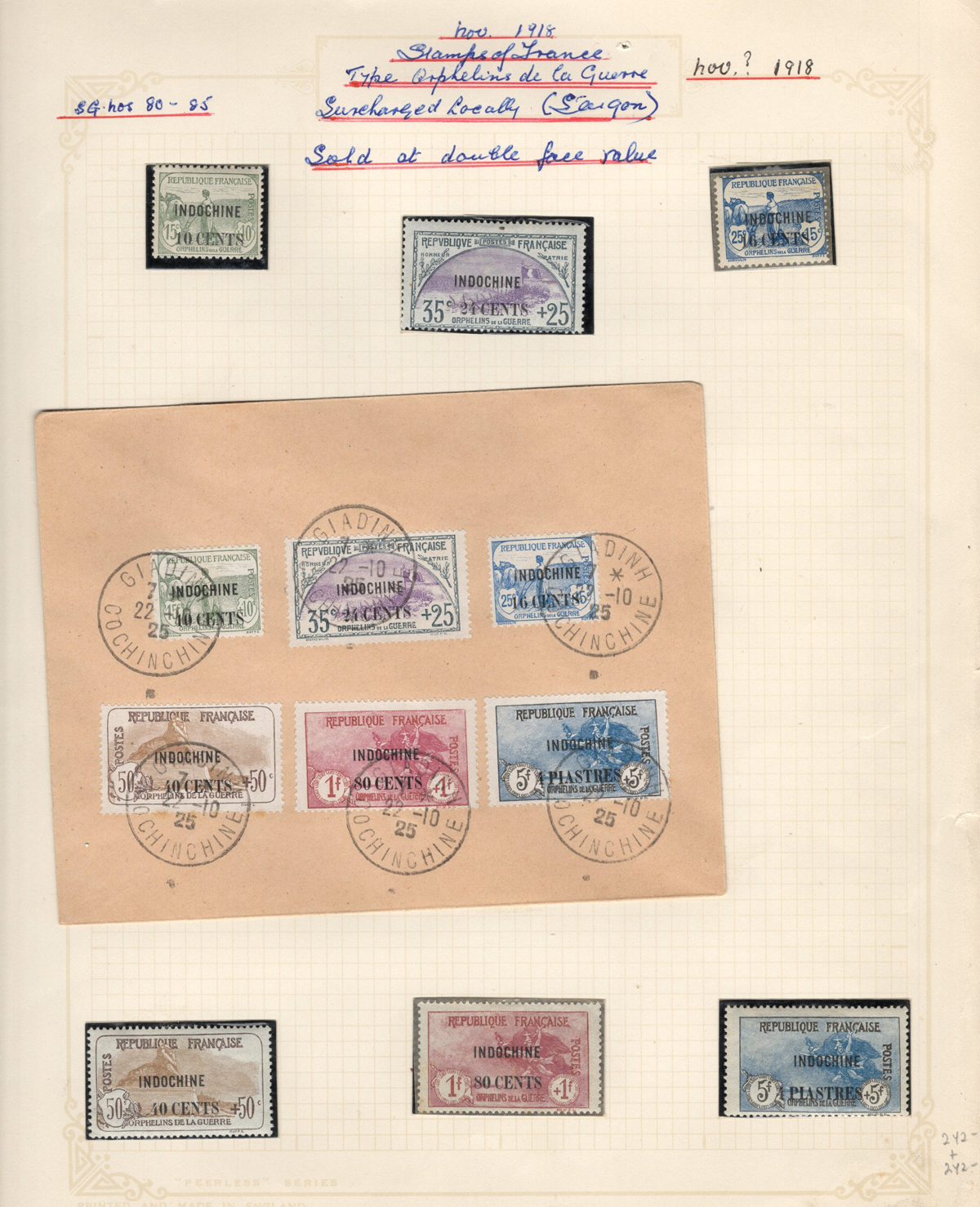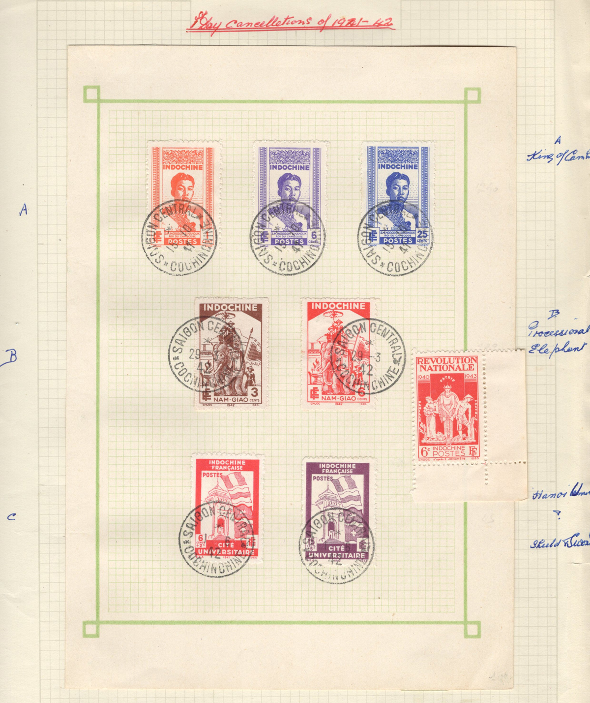 684 O/og/nh   imageOld Time Extensive Collection of French Indo-China, 1889 to 1946, all on about 80 quadrille pages. This collection has an excellent coverage of the material issued in the period, with regular issues, Postage Dues, Airmail, Semi-Postals and Officials. Starts off strong, with Scott #s 2 (a lovely sheet margin block of 15, with c.d.s. from Thuan-An / Annam, which if a genuine block would catalogue $1,500 - we can provide a high quality scan of this item - just ask), 3/21 (partial mint set, $421), 24/40 (mint, missing only the 10c, $567), same partial set but used ($367, not including two "millésime" pairs), mint and used surcharges 59/94 ($487), 41-58 (mint, $328), same set but used ($275), same set but surcharged 65/82 (mint, missing #74, $390 and used, $293), and so on to the end, often with both mint and used issues, plus mint blocks, first day souvenir sheets, noted #s B8-B13 (two mint sets, $242 each), used ($242), J18-J30 (mint, $172), O17-O32 (mint, $147), and much more, including a few covers of the era. The many mint stamps are encapsulated in mounts, and so we have only checked a half-dozen for gum, half of which were NH. A few faults here and there, still an overall fine to very fine, and quite valuable collection. Our scans only show a small portion. (Scan 1) (Scan 2) (Scan 3) (Scan 4) (Scan 5) (Scan 6) (Scan 7) (Scan 8) (Scan 9) (Scan 10) (Scan 11) (Scan 12) (Scan 13) (Scan 14) (Scan 15) (Scan 16) (Scan 17) (Scan 18) (All Scans) (All Images)