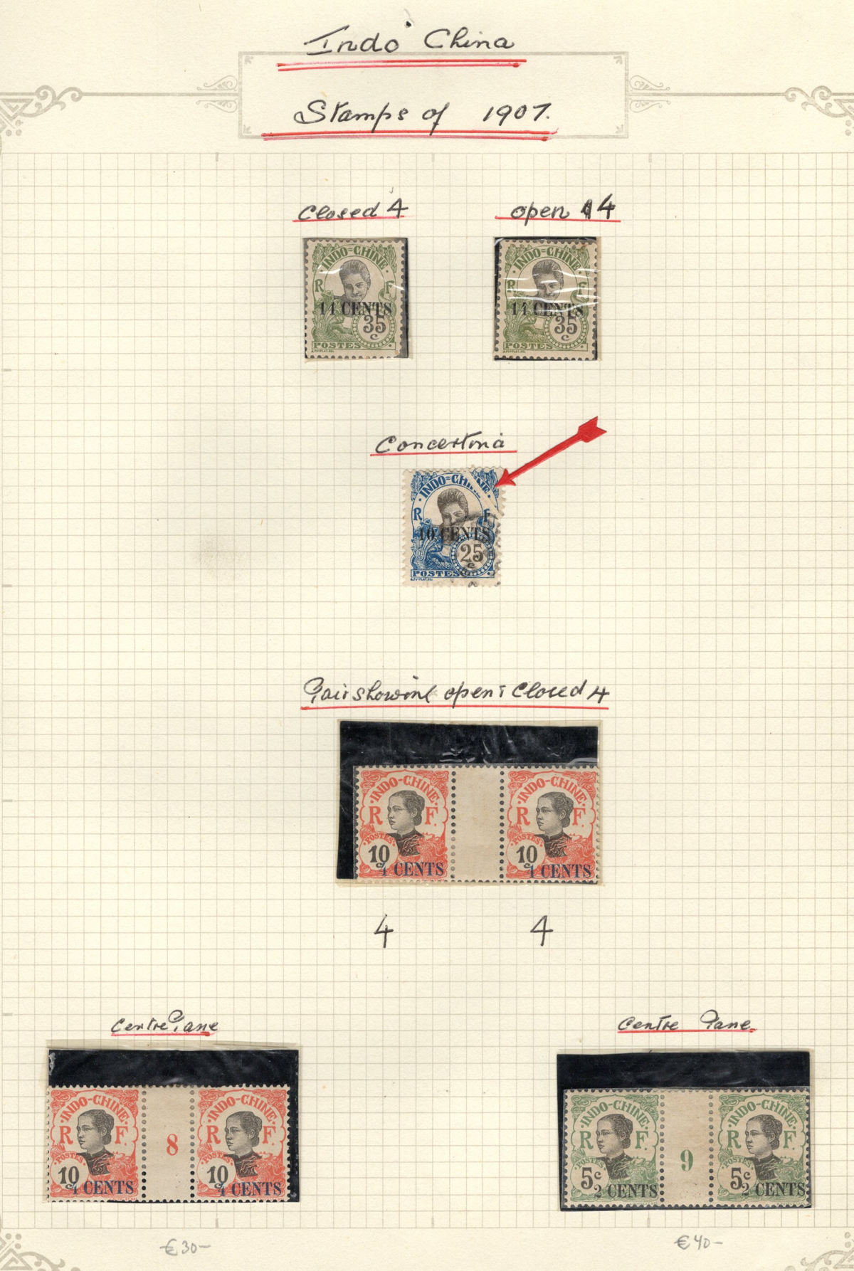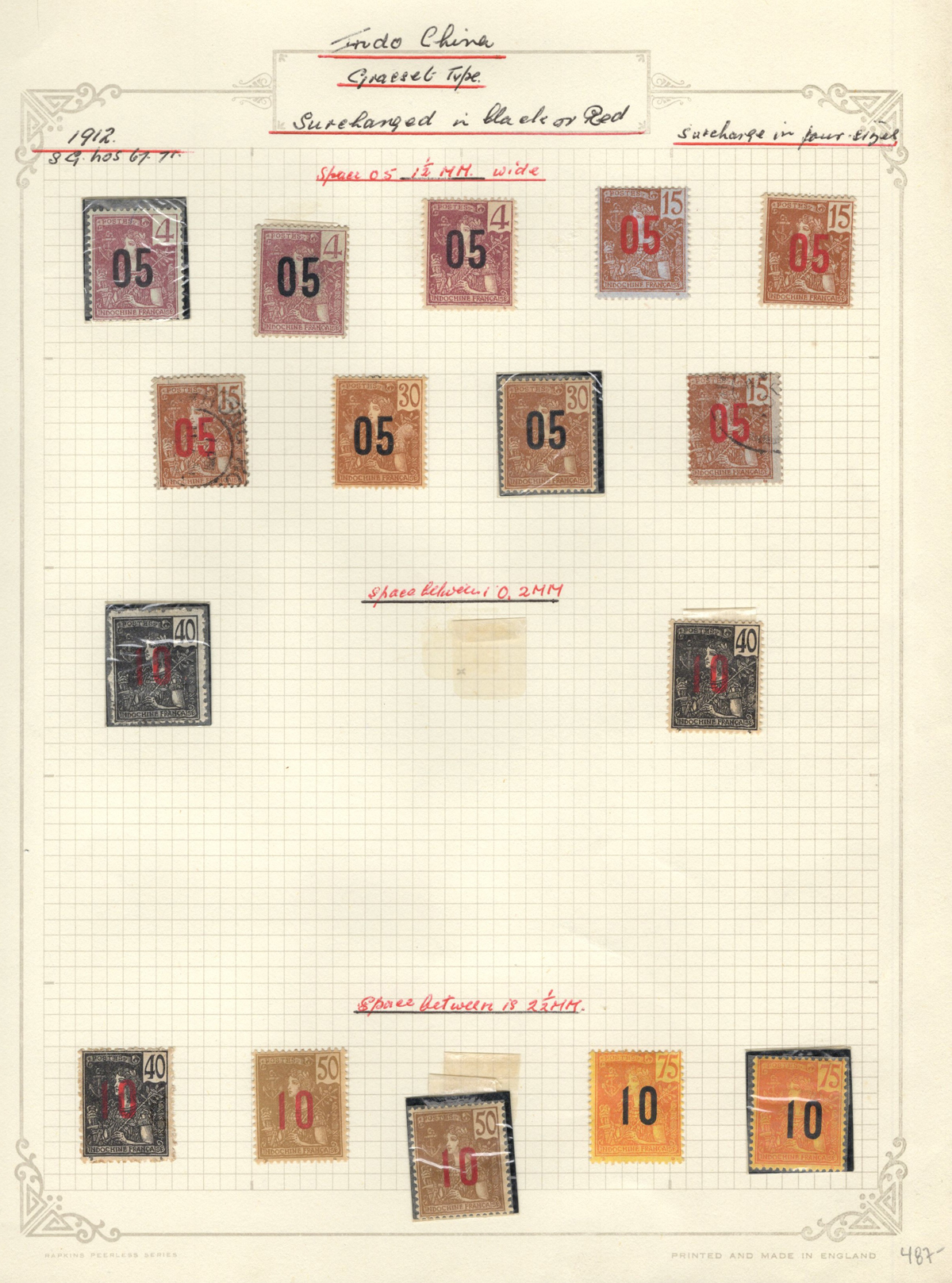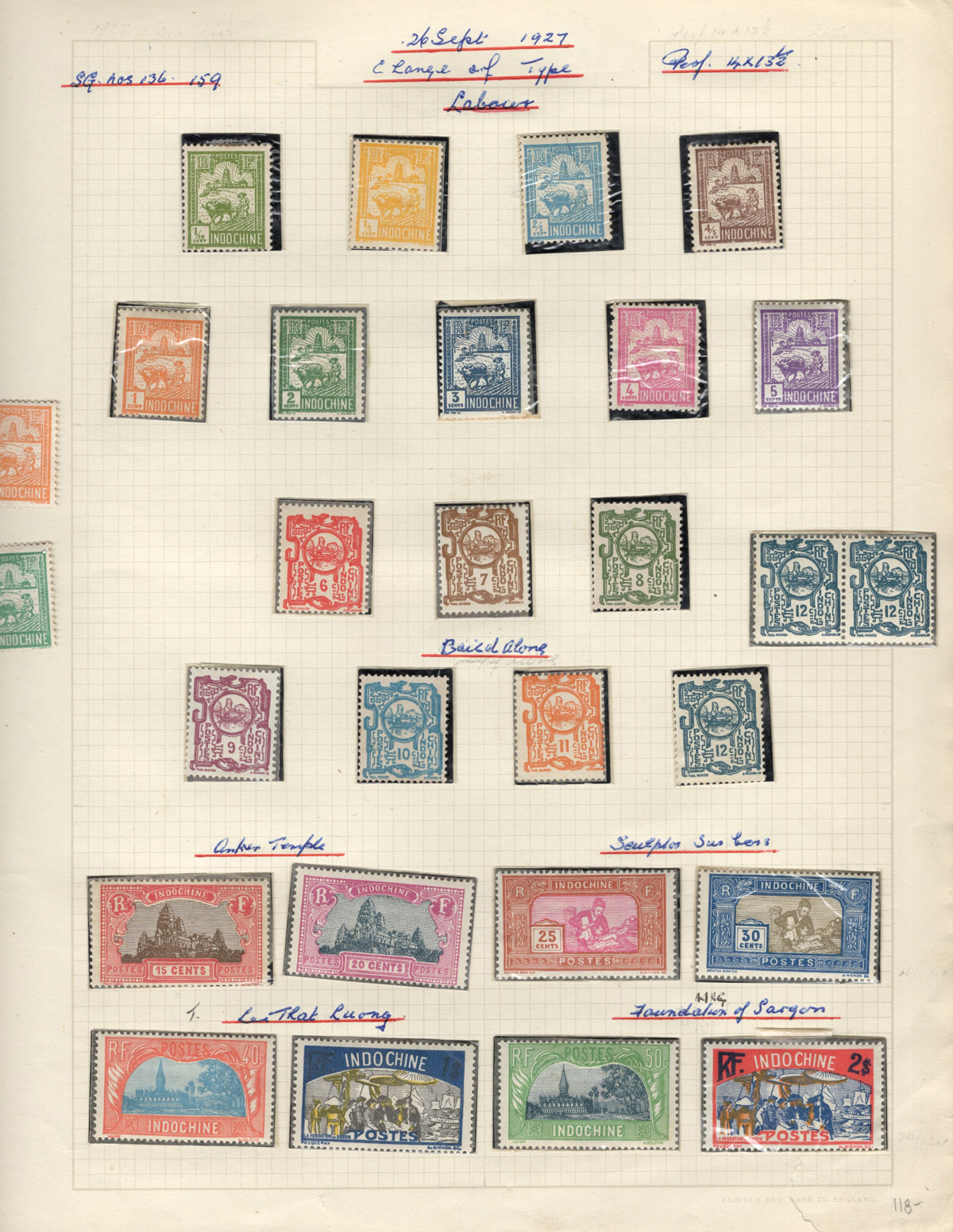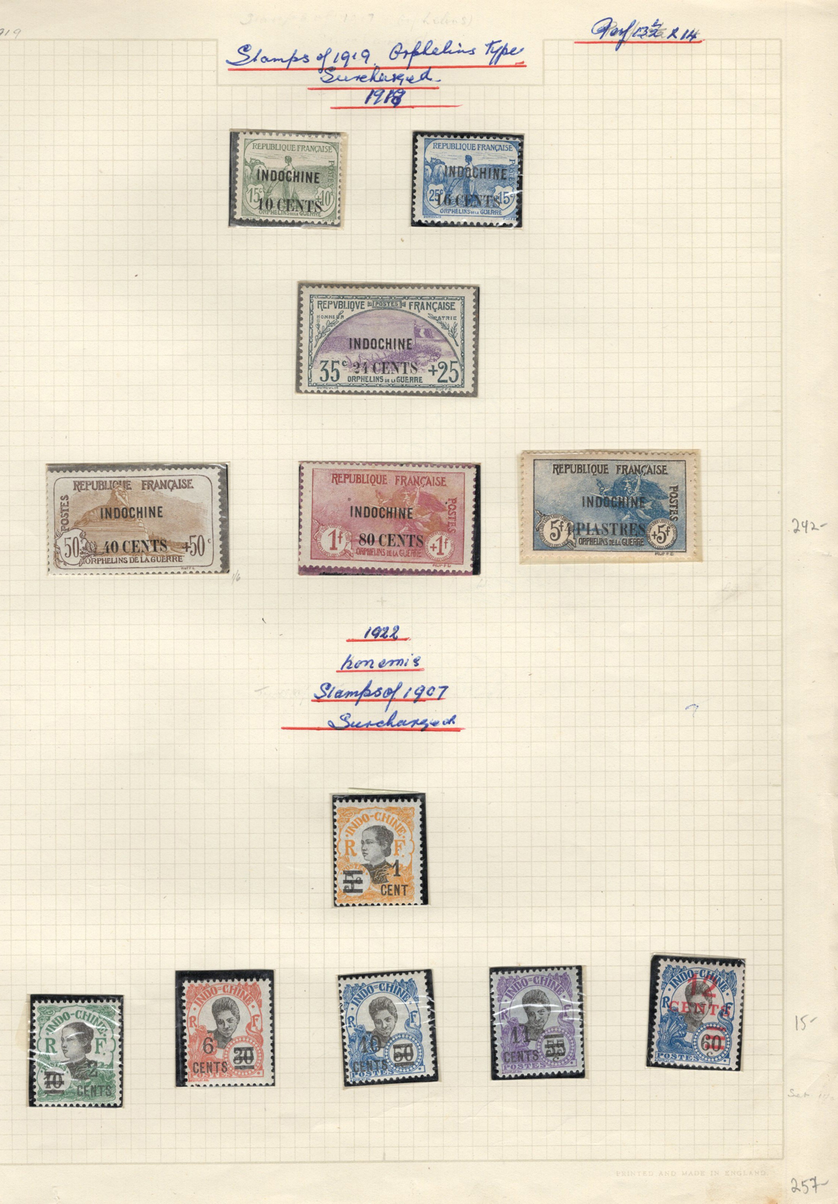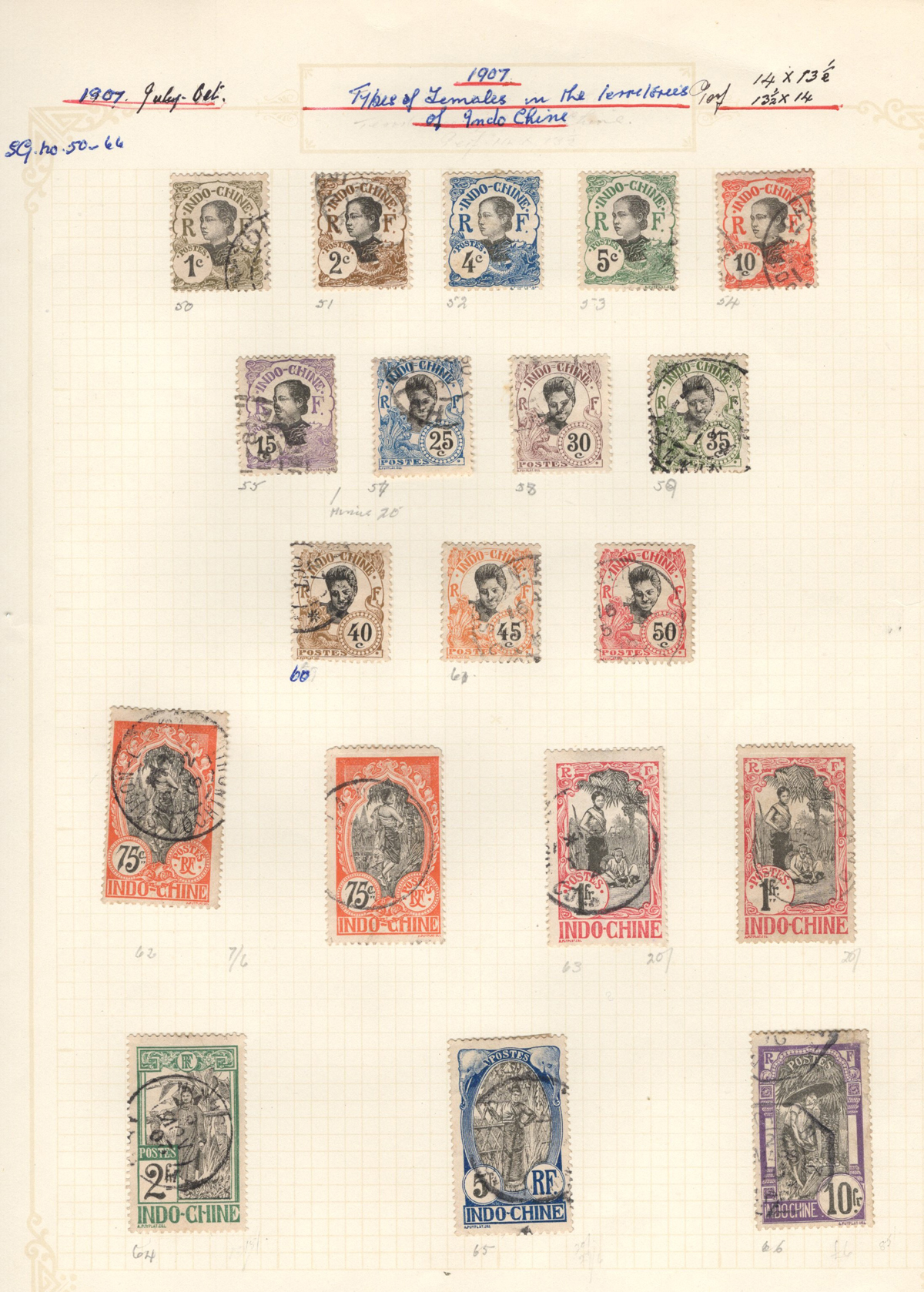 684 O/og/nh   imageOld Time Extensive Collection of French Indo-China, 1889 to 1946, all on about 80 quadrille pages. This collection has an excellent coverage of the material issued in the period, with regular issues, Postage Dues, Airmail, Semi-Postals and Officials. Starts off strong, with Scott #s 2 (a lovely sheet margin block of 15, with c.d.s. from Thuan-An / Annam, which if a genuine block would catalogue $1,500 - we can provide a high quality scan of this item - just ask), 3/21 (partial mint set, $421), 24/40 (mint, missing only the 10c, $567), same partial set but used ($367, not including two "millésime" pairs), mint and used surcharges 59/94 ($487), 41-58 (mint, $328), same set but used ($275), same set but surcharged 65/82 (mint, missing #74, $390 and used, $293), and so on to the end, often with both mint and used issues, plus mint blocks, first day souvenir sheets, noted #s B8-B13 (two mint sets, $242 each), used ($242), J18-J30 (mint, $172), O17-O32 (mint, $147), and much more, including a few covers of the era. The many mint stamps are encapsulated in mounts, and so we have only checked a half-dozen for gum, half of which were NH. A few faults here and there, still an overall fine to very fine, and quite valuable collection. Our scans only show a small portion. (Scan 1) (Scan 2) (Scan 3) (Scan 4) (Scan 5) (Scan 6) (Scan 7) (Scan 8) (Scan 9) (Scan 10) (Scan 11) (Scan 12) (Scan 13) (Scan 14) (Scan 15) (Scan 16) (Scan 17) (Scan 18) (All Scans) (All Images)