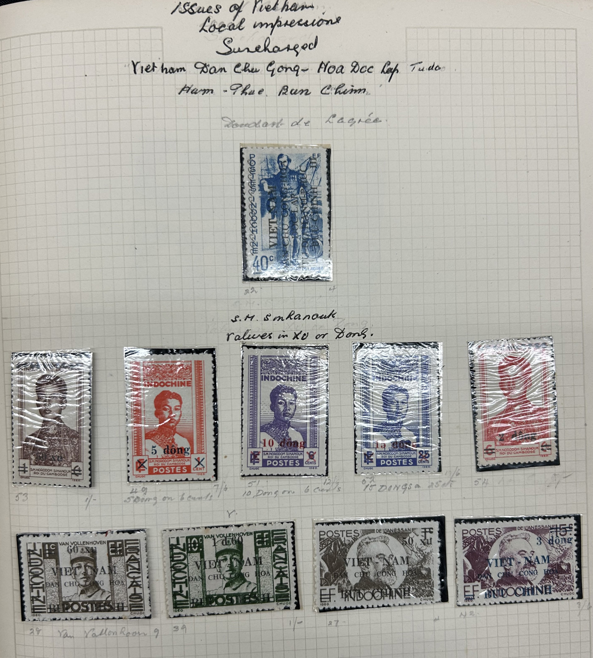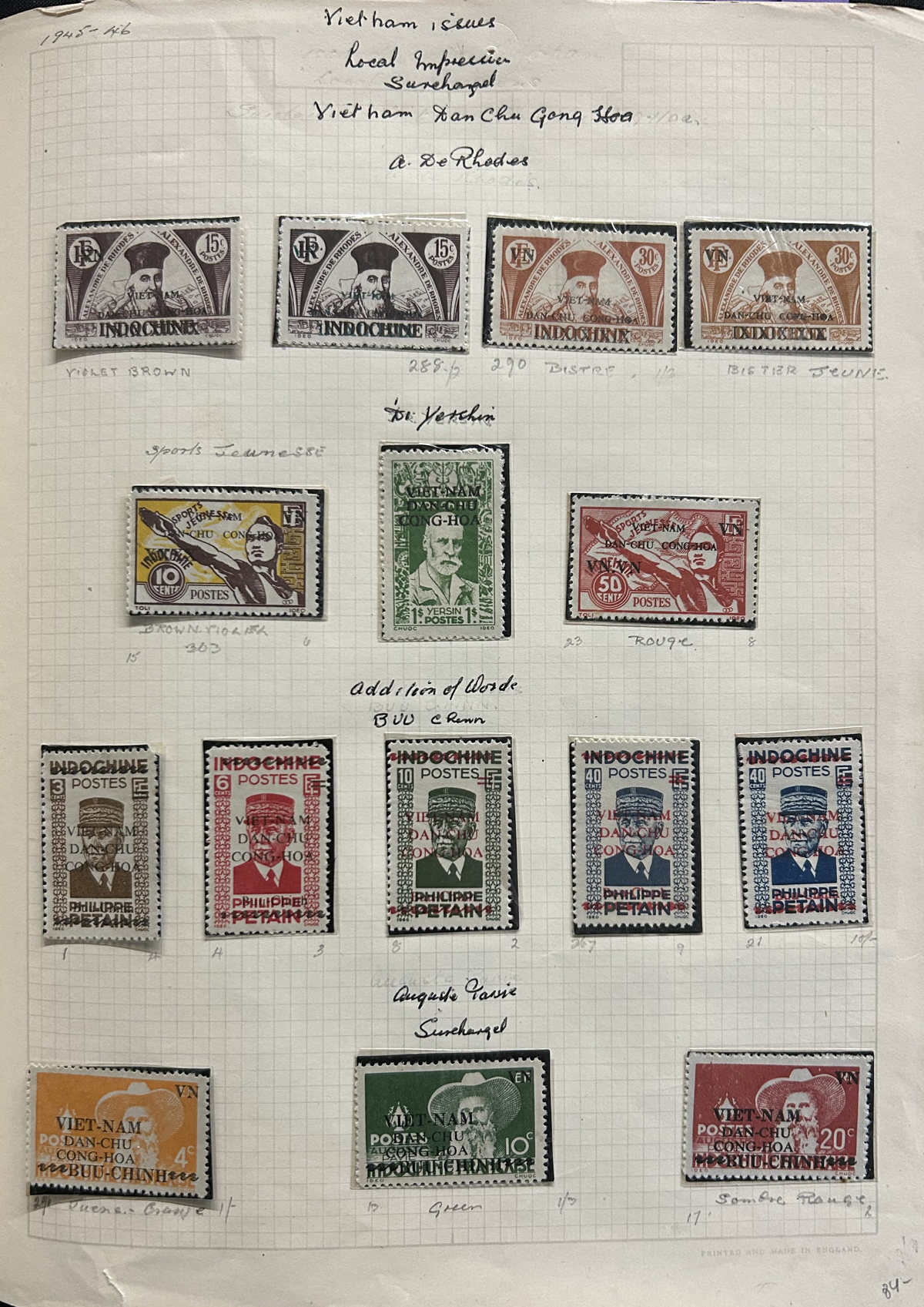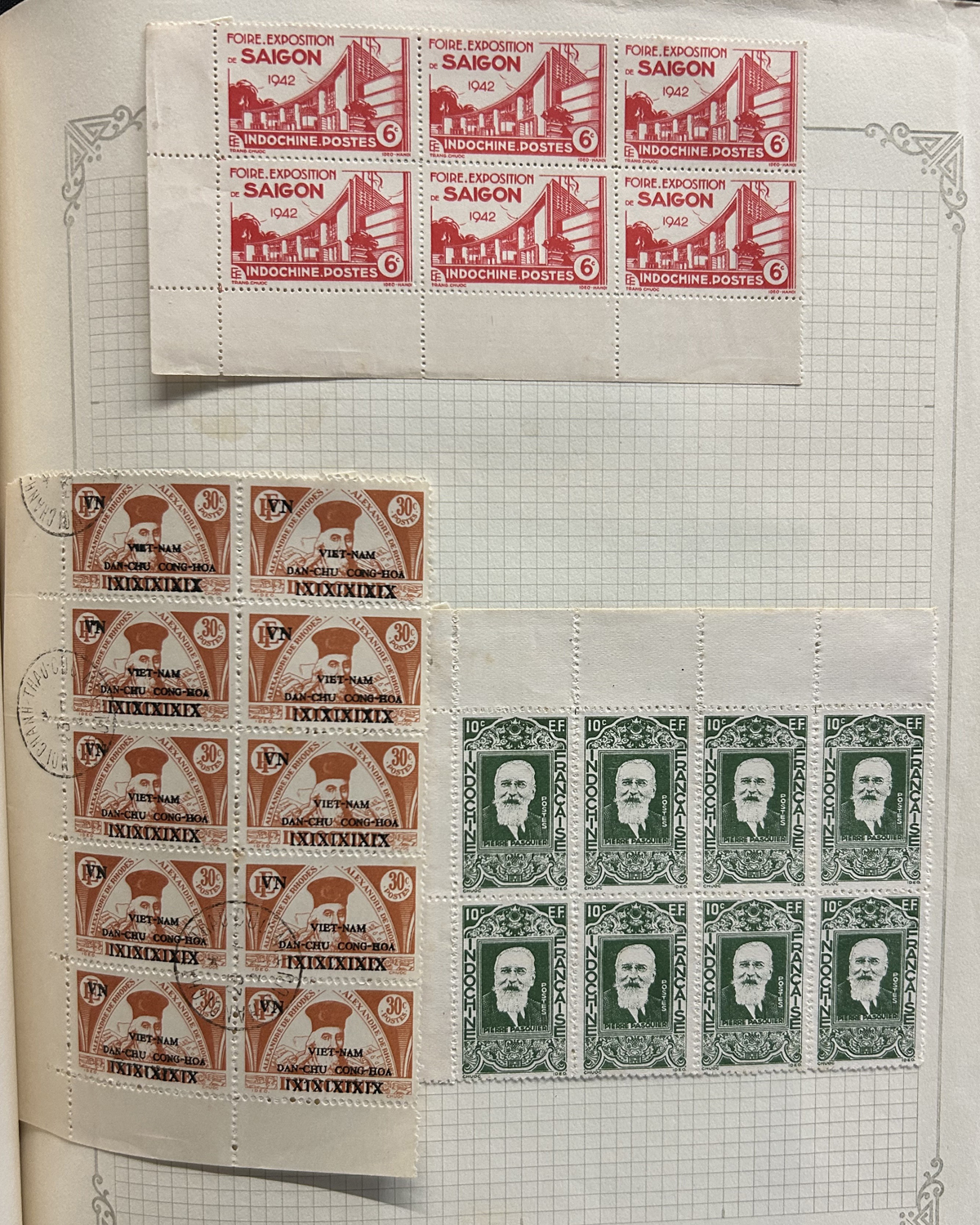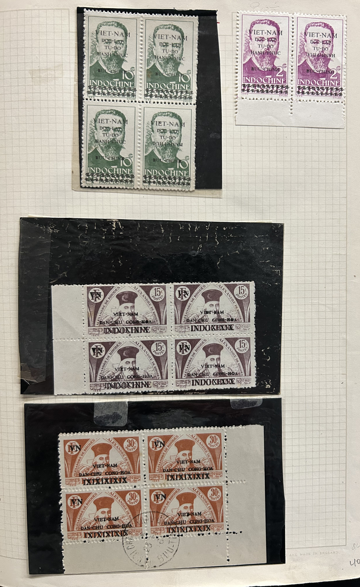 685 O/og   imageOld Time Collection of Indo-China and North Viet Nam, mounted on quadrille pages in a springback album, starting with Indo-China (1942 to 1946 on 26 pages) including regular issues, Airmail, imperforates (noting a set of Airmails cataloguing €100 in Yvert & Tellier Colonies), stamps overprinted Dan-Chu Cong-Hoa and Doc-Lap Tu-Do Hanh-Phuc, for use in North Viet Nam (these overprints catalogue U$802 alone), etc. Also another 26 pages of North Viet Nam to about 1965. We also noted some covers, including 9 from the 1947 Paris-Saigon Exhibition, with lavish cachets and two different exhibition labels on back. All in all a clean collection, with mint and used throughout, including multiples, many complete sets, etc. Fine to very fine, our photos should give an idea. (Scan 1) (Scan 2) (Scan 3) (Scan 4) (Scan 5) (Scan 6) (Scan 7) (Scan 8) (Scan 9) (Scan 10) (Scan 11) (Scan 12) (Scan 13) (Scan 14) (Scan 15) (Scan 16) (Scan 17) (Scan 18) (All Scans) (All Images)