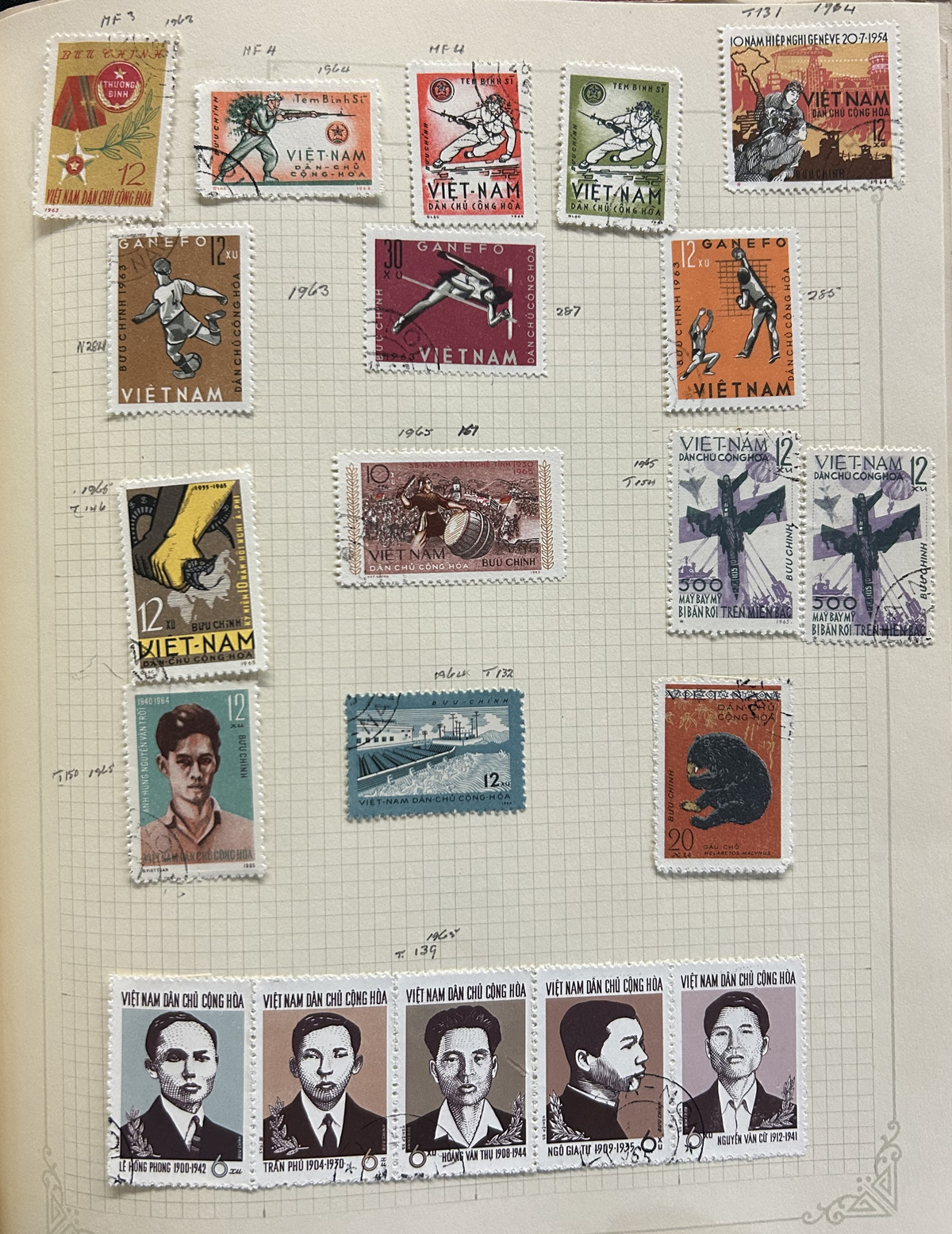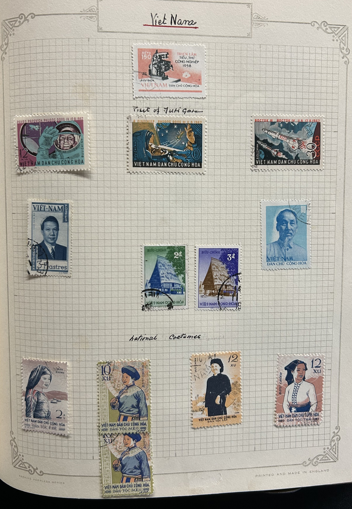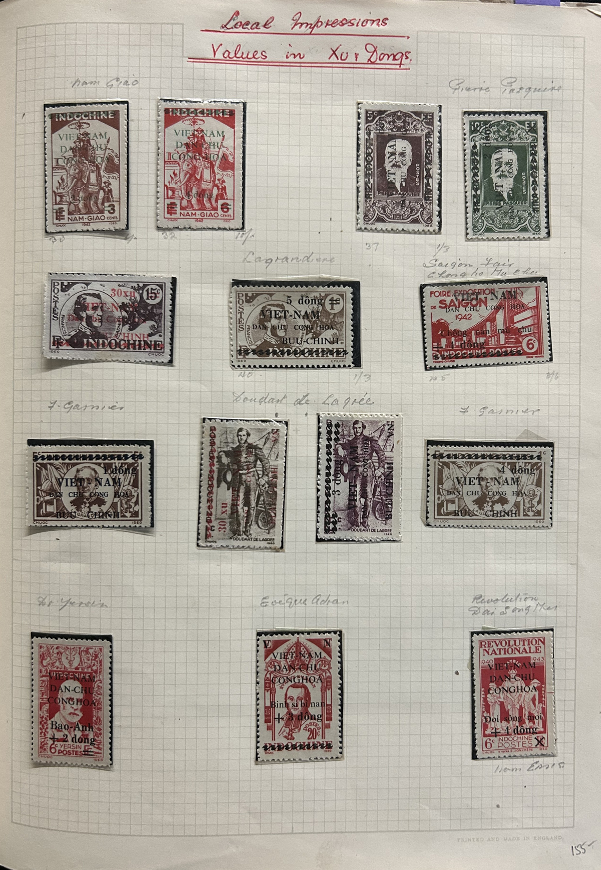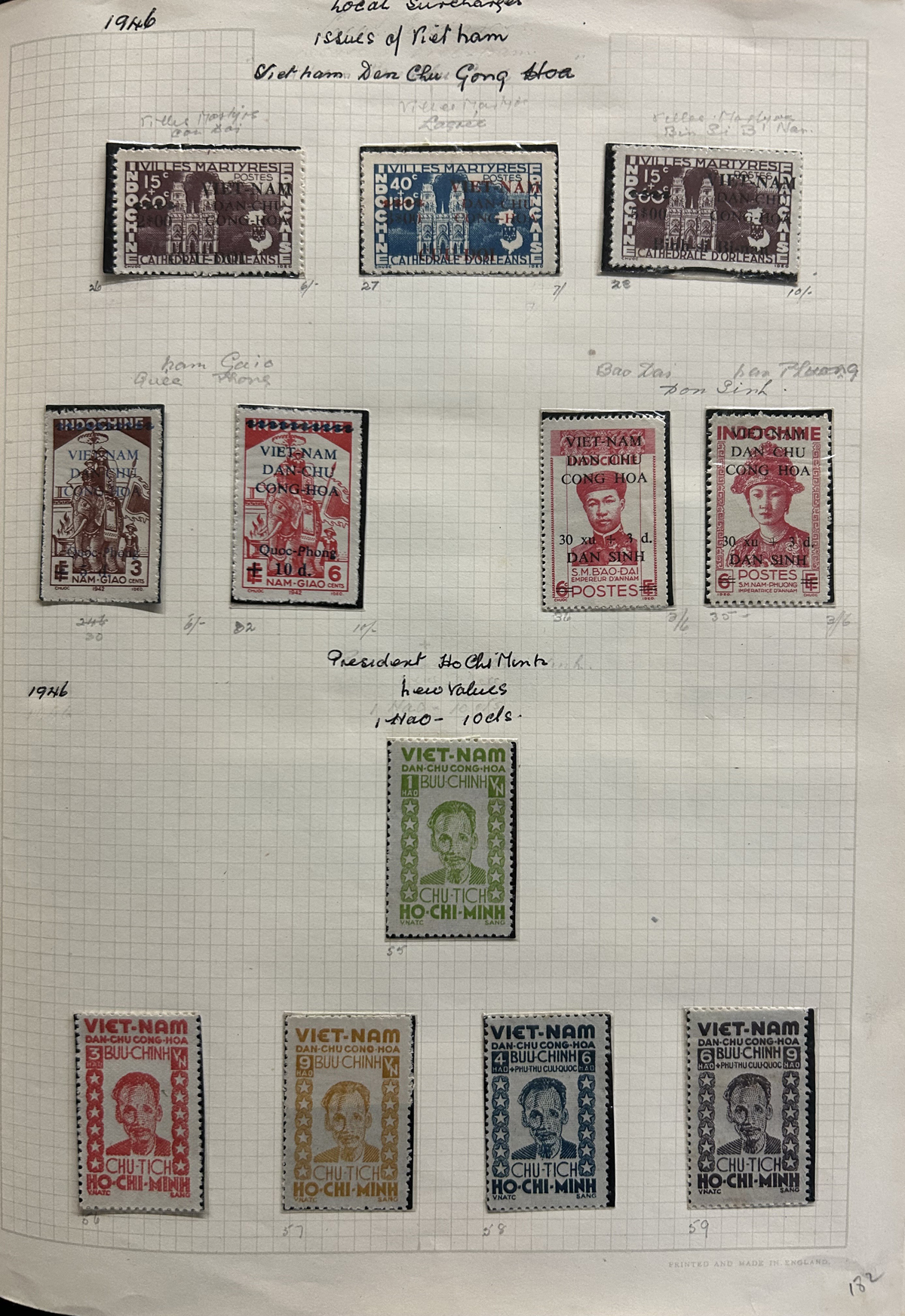 685 O/og   imageOld Time Collection of Indo-China and North Viet Nam, mounted on quadrille pages in a springback album, starting with Indo-China (1942 to 1946 on 26 pages) including regular issues, Airmail, imperforates (noting a set of Airmails cataloguing €100 in Yvert & Tellier Colonies), stamps overprinted Dan-Chu Cong-Hoa and Doc-Lap Tu-Do Hanh-Phuc, for use in North Viet Nam (these overprints catalogue U$802 alone), etc. Also another 26 pages of North Viet Nam to about 1965. We also noted some covers, including 9 from the 1947 Paris-Saigon Exhibition, with lavish cachets and two different exhibition labels on back. All in all a clean collection, with mint and used throughout, including multiples, many complete sets, etc. Fine to very fine, our photos should give an idea. (Scan 1) (Scan 2) (Scan 3) (Scan 4) (Scan 5) (Scan 6) (Scan 7) (Scan 8) (Scan 9) (Scan 10) (Scan 11) (Scan 12) (Scan 13) (Scan 14) (Scan 15) (Scan 16) (Scan 17) (Scan 18) (All Scans) (All Images)