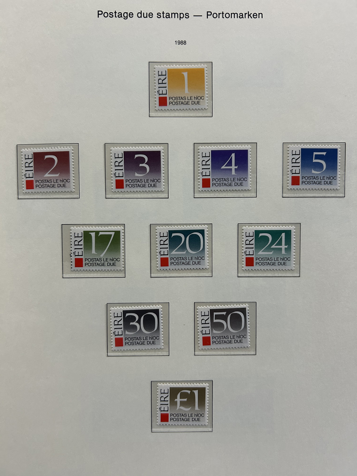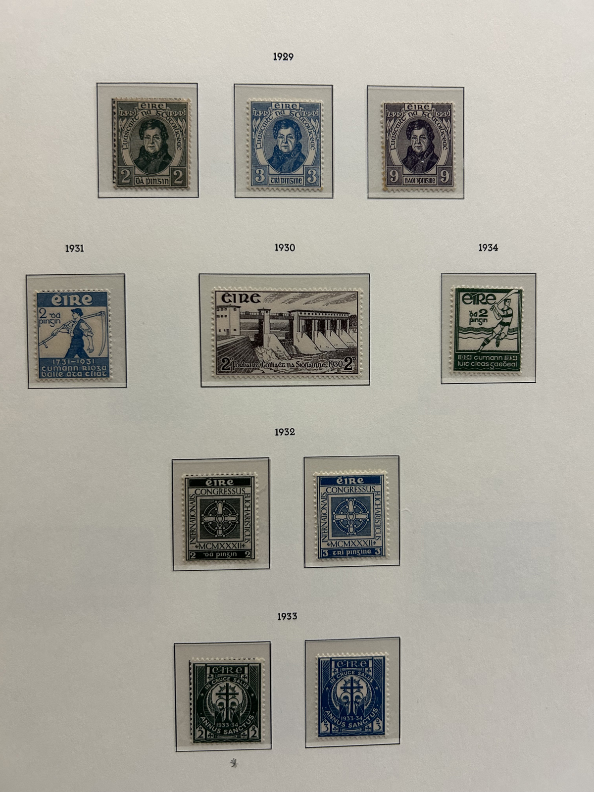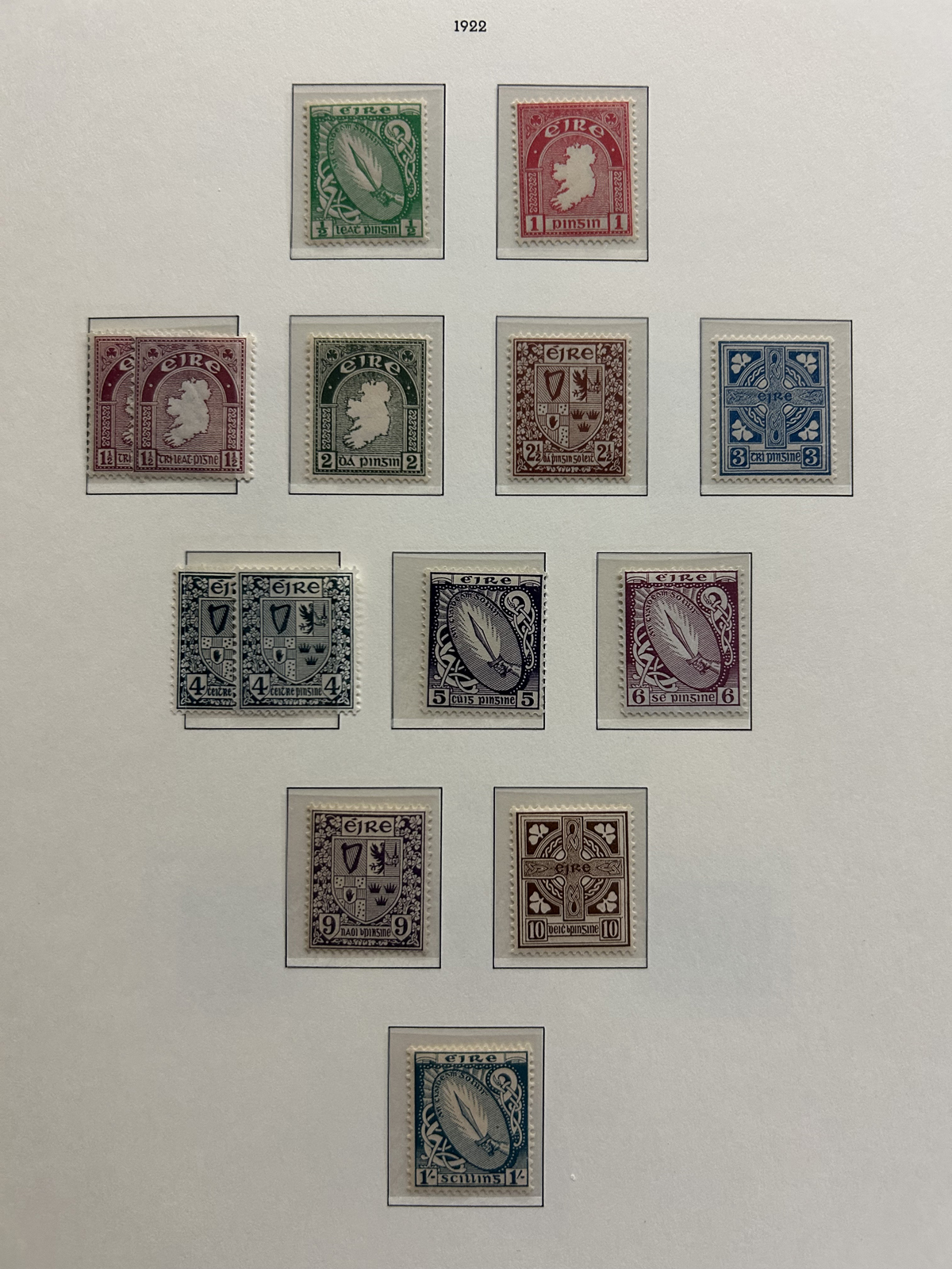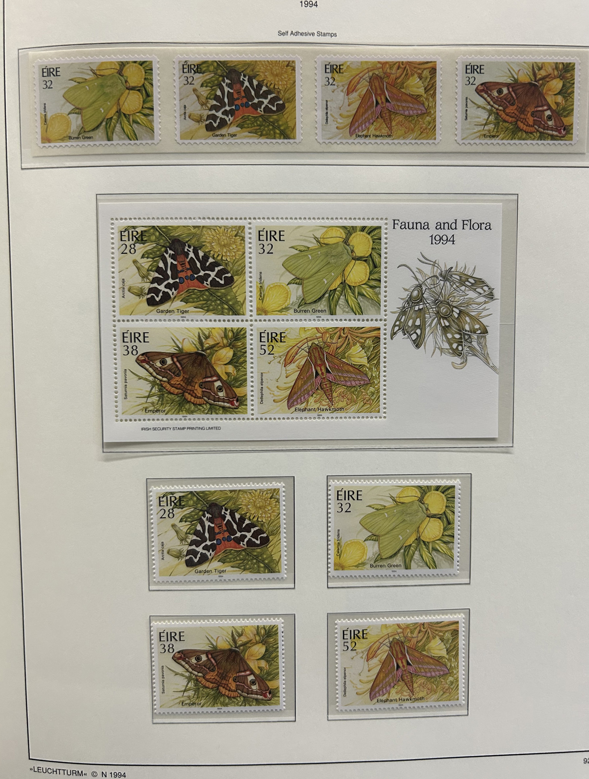 686 nh   imageCollection of Mint Never Hinged Ireland in Two Lighthouse Hingeless Albums, with slipcases, running from 1922 to 1994. The collection is never hinged except for the first Postage Due set and first coil set, which are lightly hinged. It starts right after the first overprints, and is complete, except for the missing first St Patrick set (offered in our singles and sets section), three souvenir sheets and about a half dozen stamps here and there. Quite a fresh and clean collection, with mostly very fine stamps throughout, we counted a catalogue value of U$1,963 to 1974 only, not including the last 20 years. See our representative photos online. (Scan 1) (Scan 2) (Scan 3) (Scan 4) (Scan 5) (Scan 6) (Scan 7) (Scan 8) (Scan 9) (All Scans) (All Images)