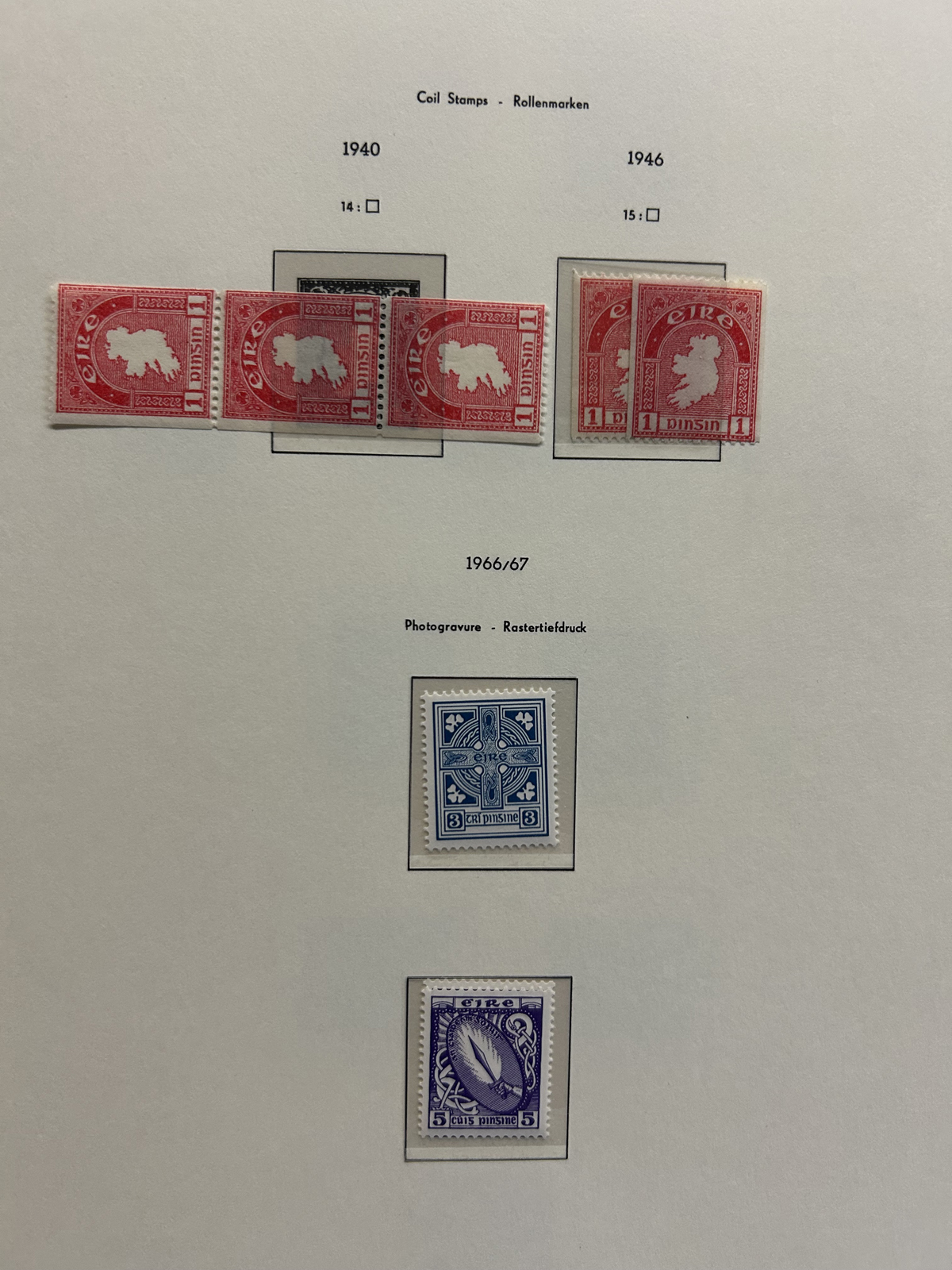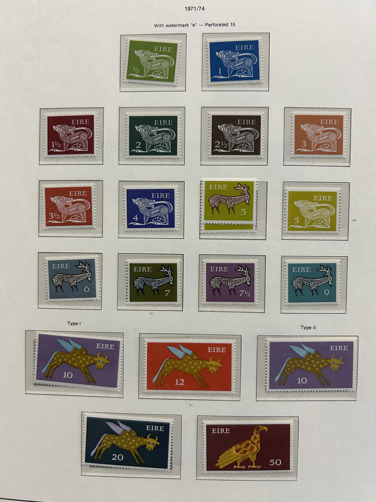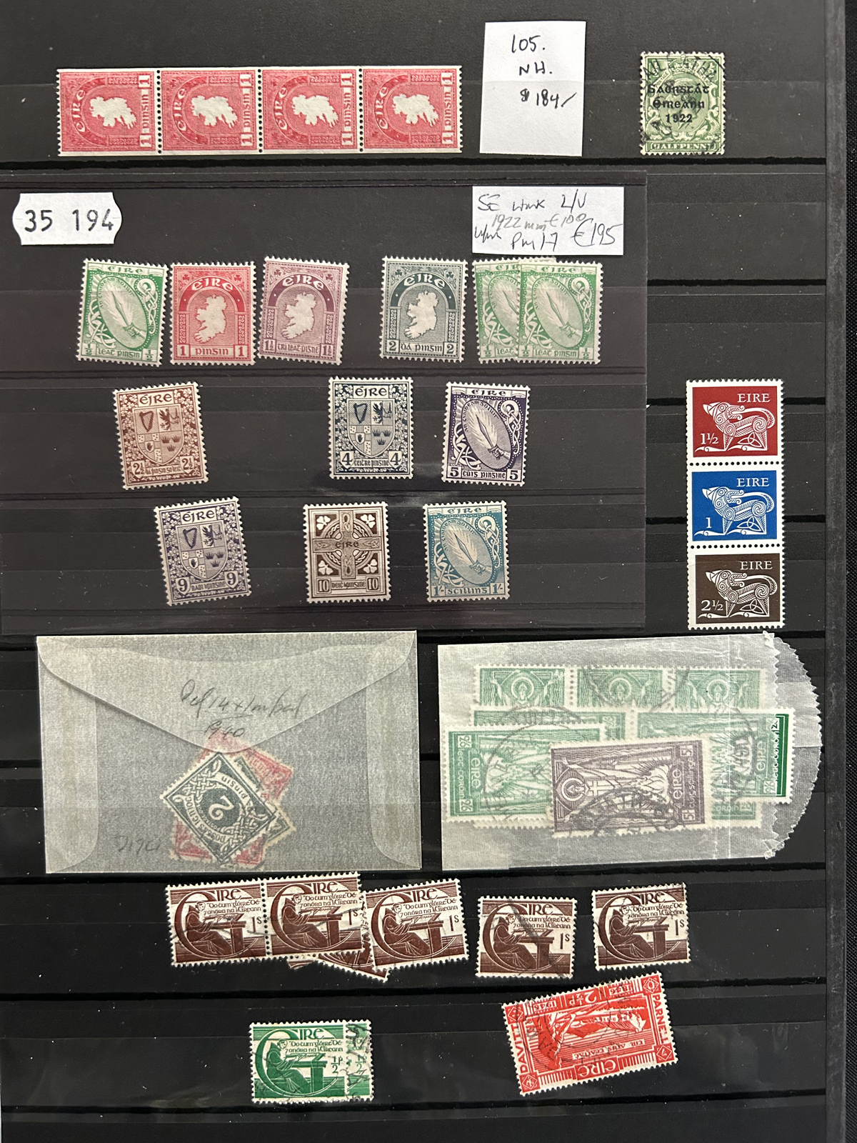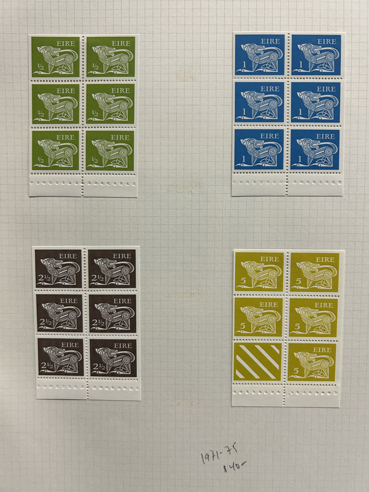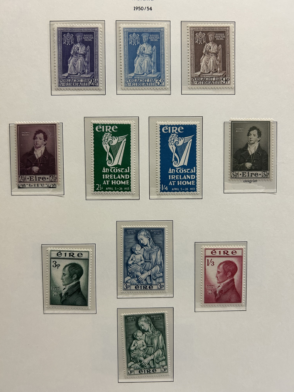 686 nh   imageCollection of Mint Never Hinged Ireland in Two Lighthouse Hingeless Albums, with slipcases, running from 1922 to 1994. The collection is never hinged except for the first Postage Due set and first coil set, which are lightly hinged. It starts right after the first overprints, and is complete, except for the missing first St Patrick set (offered in our singles and sets section), three souvenir sheets and about a half dozen stamps here and there. Quite a fresh and clean collection, with mostly very fine stamps throughout, we counted a catalogue value of U$1,963 to 1974 only, not including the last 20 years. See our representative photos online. (Scan 1) (Scan 2) (Scan 3) (Scan 4) (Scan 5) (Scan 6) (Scan 7) (Scan 8) (Scan 9) (All Scans) (All Images)