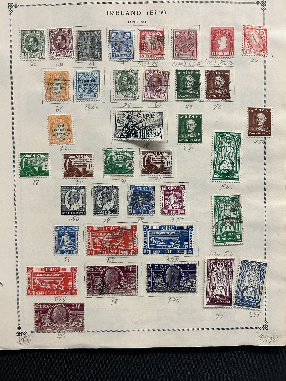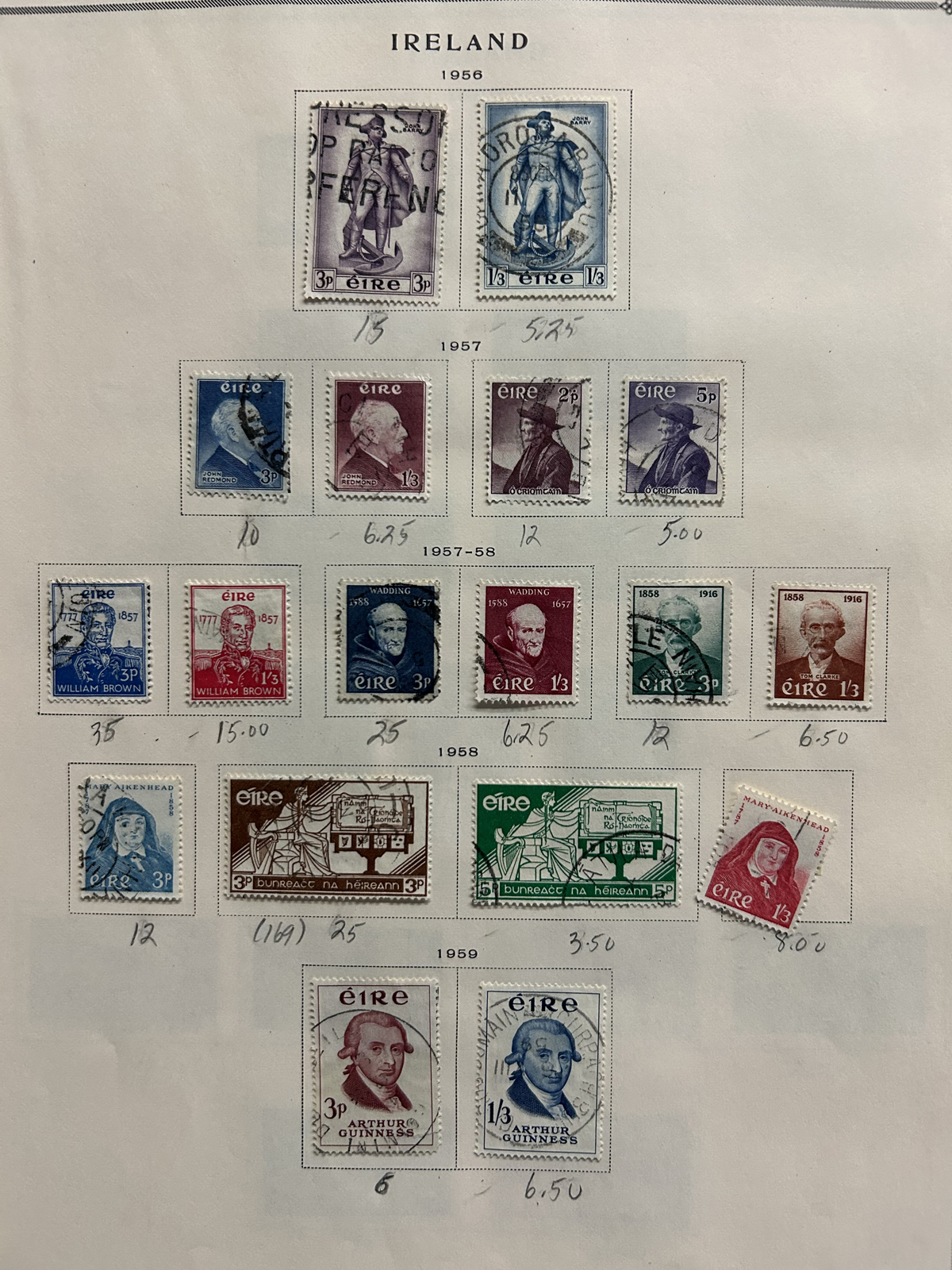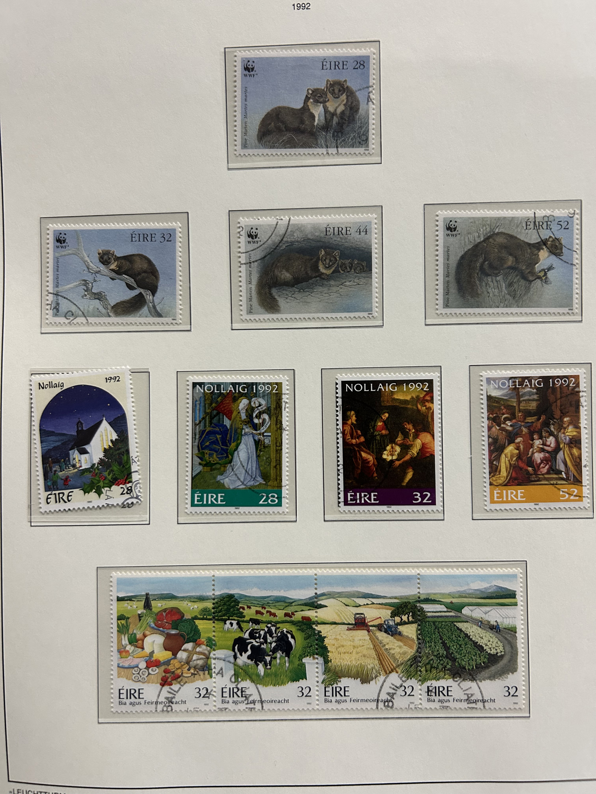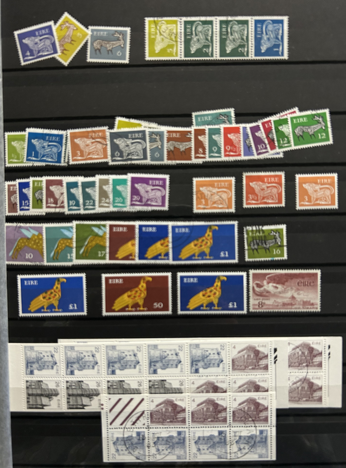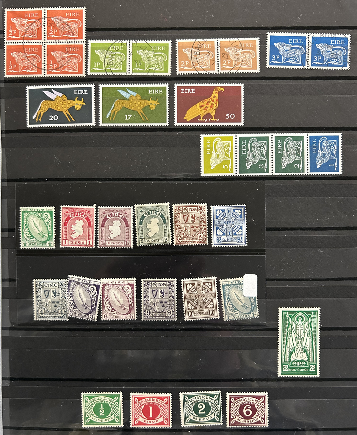 687 O/og/nh   imageCollection of Used Ireland, Plus a Good Selection of extra Mint and Used Various Issues, the mail collection is in a Lighthouse hingeless album and runs from just after the first overprints, to 1992. This collection is complete, save for a dozen or so missing sets / souvenir sheets near the end, plus some of the Dog / Ox sets (which are present in the accompanying stockbook). The catalogue value for up to 1970 comes to U$1,221. Also comes with a 16-page stockbook filled with mint and used singles and sets, including several Dog / Ox definitives, a page of early Great Britain stamps used in Ireland, booklet panes, many early issues (no overprints), early coils, etc. Last but not least is a folder containing about 25 album pages with mainly mint and used early issues, plus more modern such as a page of mint Dog booklet panes, and more. Very nice quality throughout, with mostly light c.d.s. cancels on the used, and many NH in the mint, see our online photos for a sampling. (Scan 1) (Scan 2) (Scan 3) (Scan 4) (Scan 5) (Scan 6) (Scan 7) (Scan 8) (Scan 9) (Scan 10) (Scan 11) (Scan 12) (Scan 13) (Scan 14) (Scan 15) (Scan 16) (Scan 17) (Scan 18) (All Scans) (All Images)
