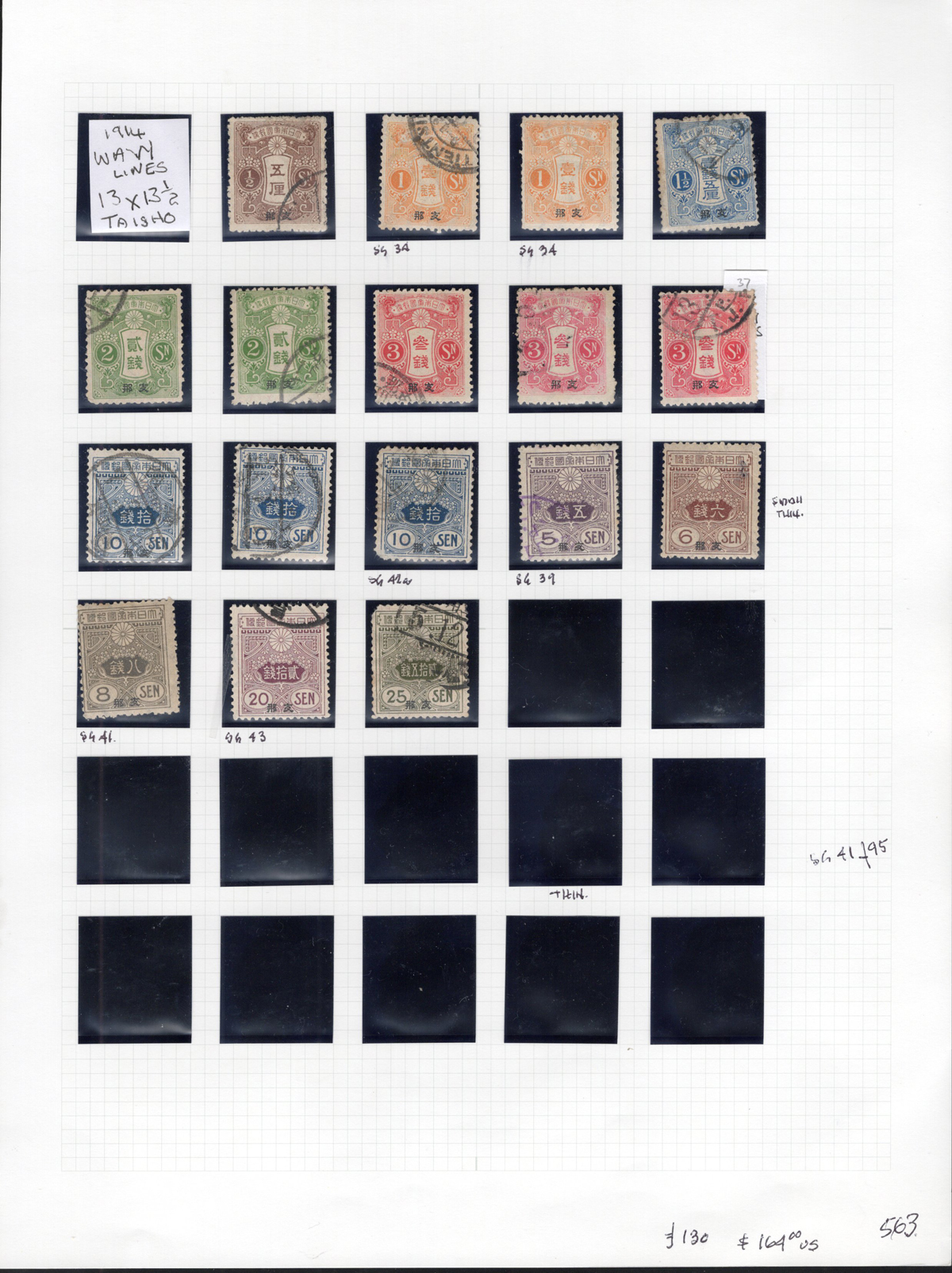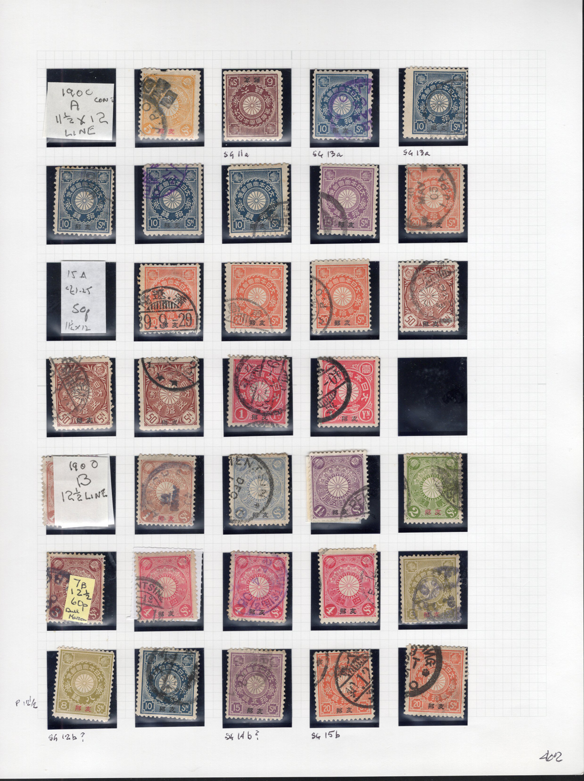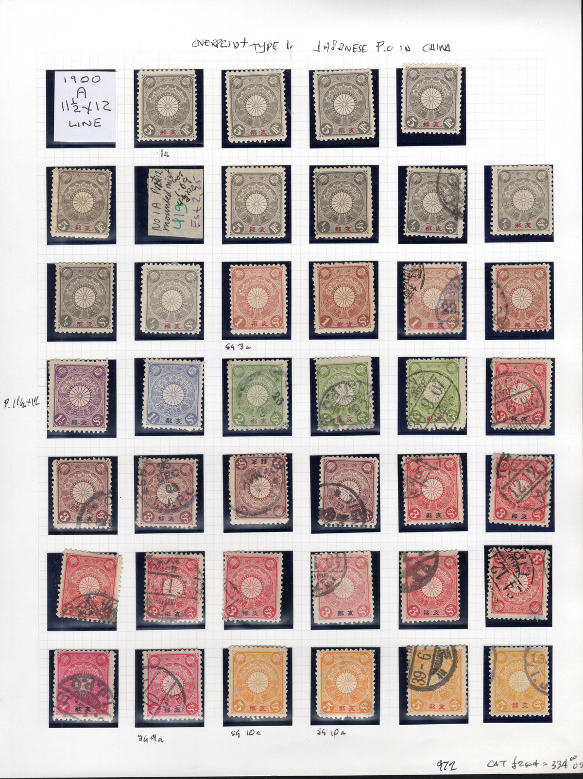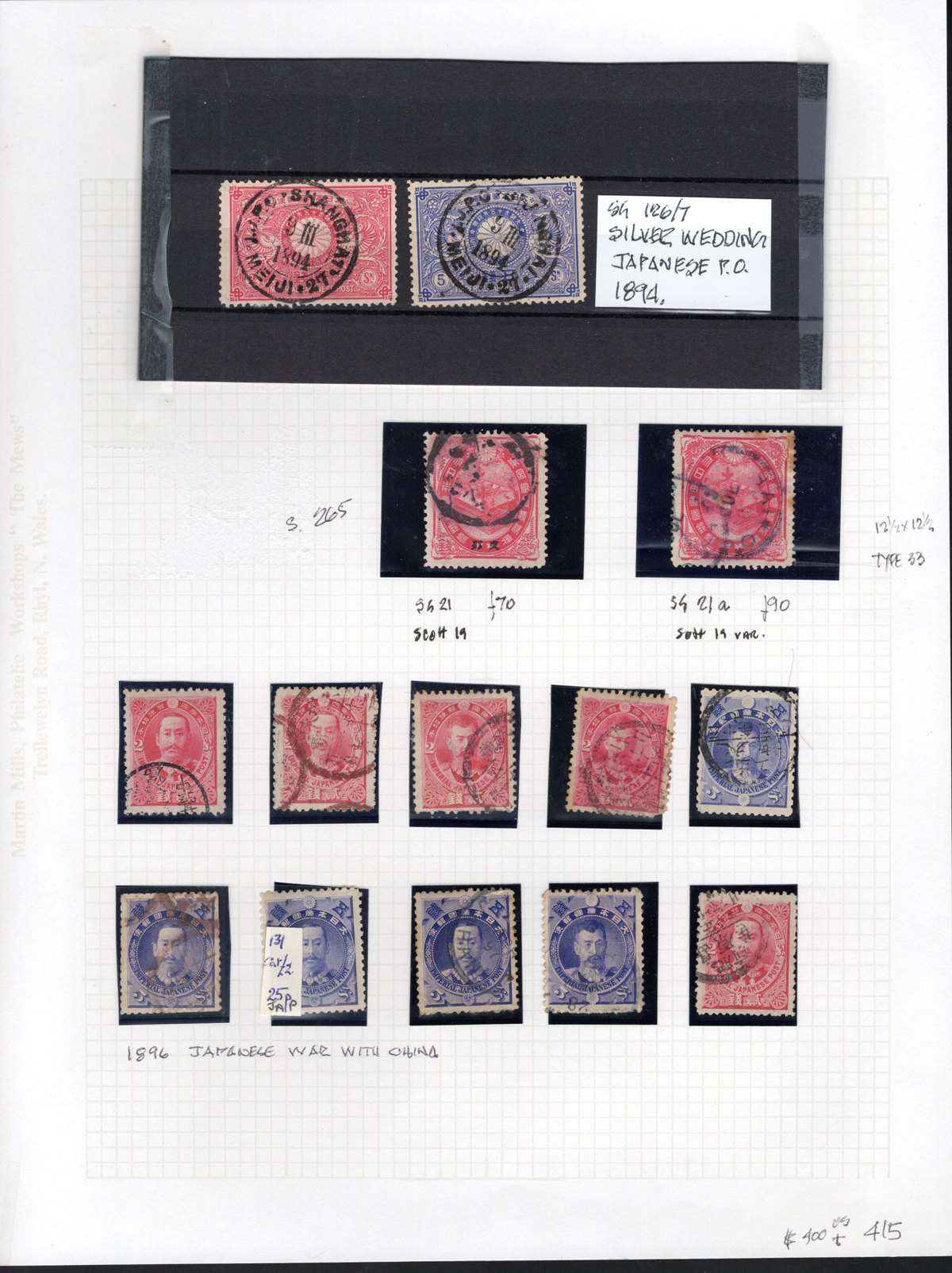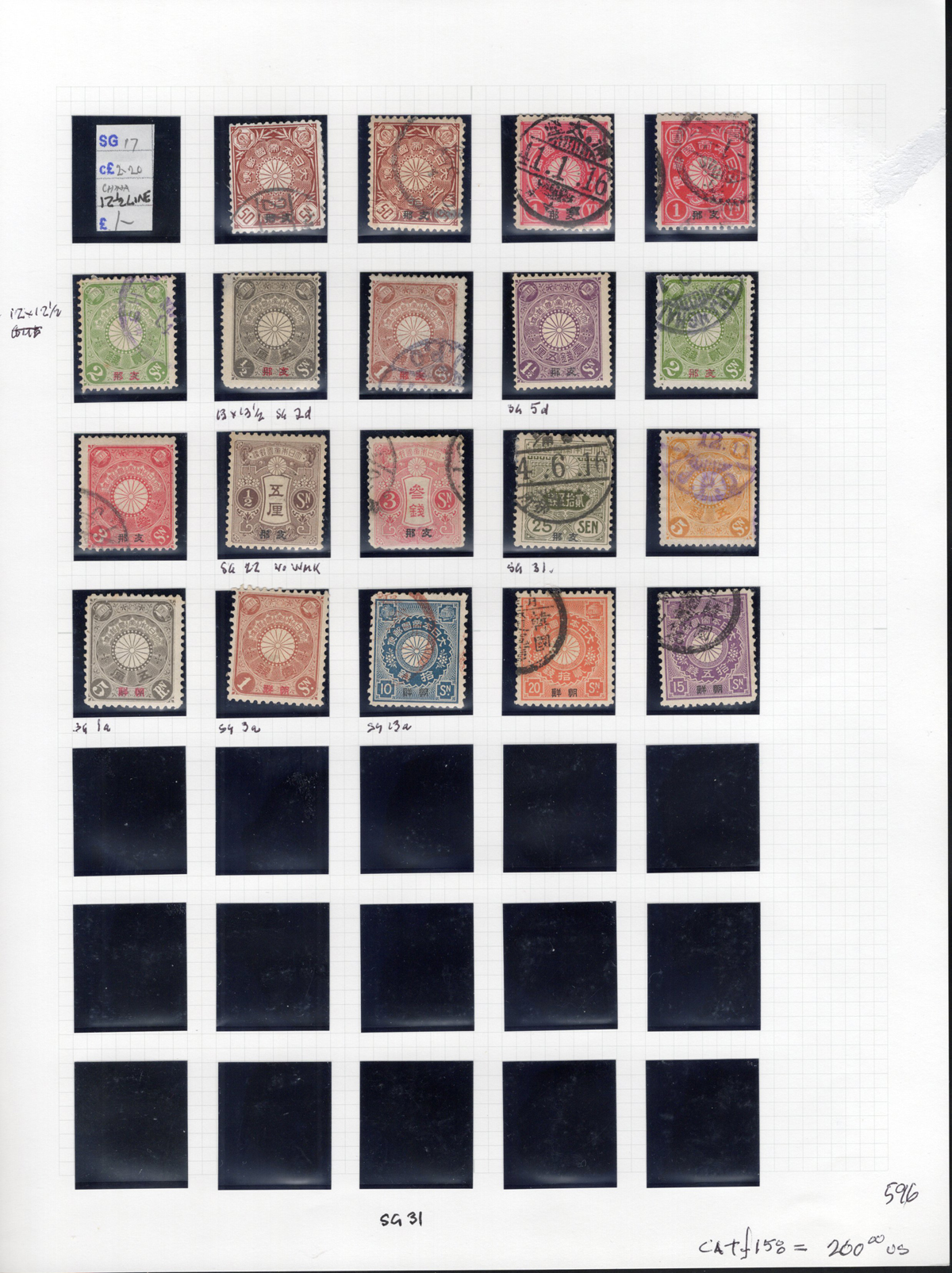 689 og/O   imageGroup of Japanese Post Offices in China Issues, all neatly mounted on 5 quadrille pages, most identified by owner as per Stanley Gibbons numbers, noting a mix of mint and used (often both), shades, perforations, and some dated postmarks. We also noted both 1894 Silver Wedding issues with Shanghai c.d.s. postmarks as well as a group of 1896 Japanese war with China issues. A rarely offered group which is overall fine or better and has an owner’s SG catalogue value of £990. (Scan 1) (Scan 2) (Scan 3) (Scan 4) (Scan 5) (All Scans) (All Images)