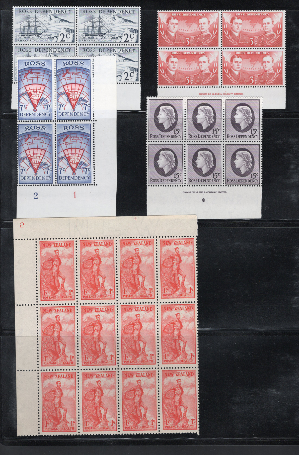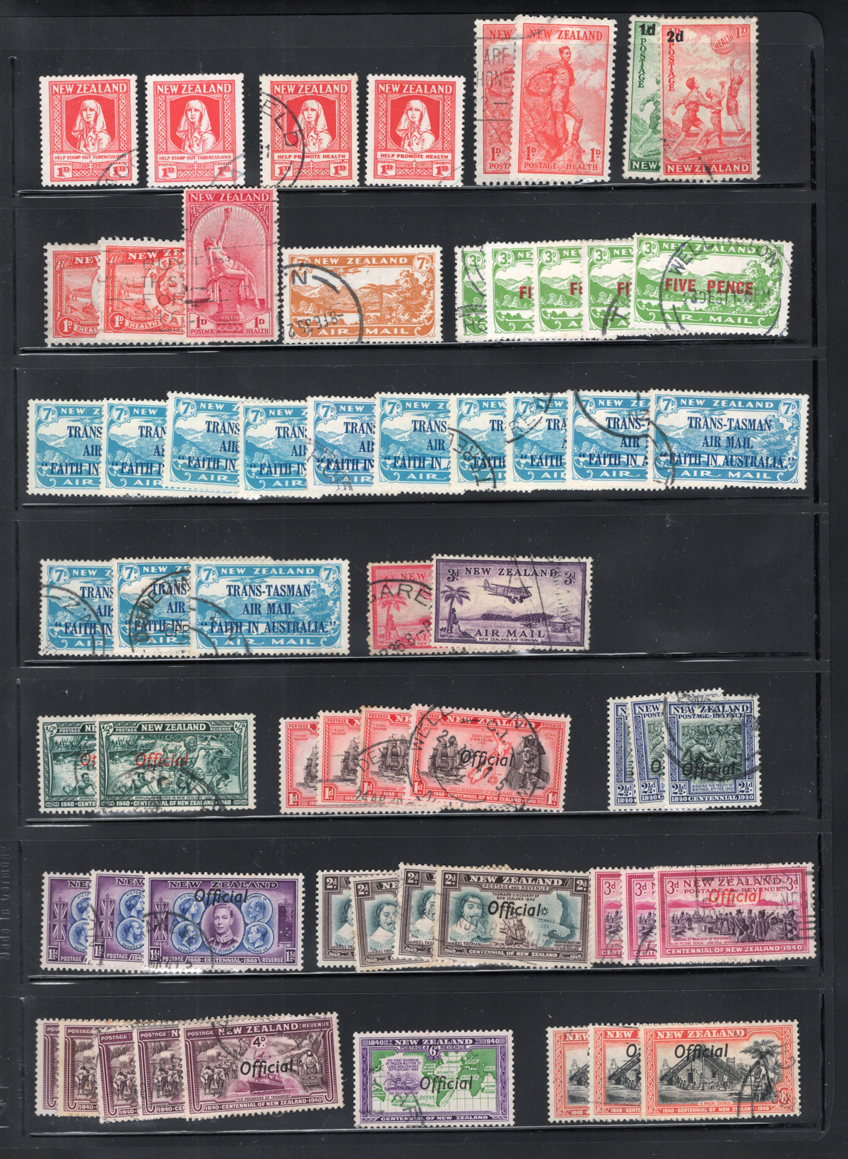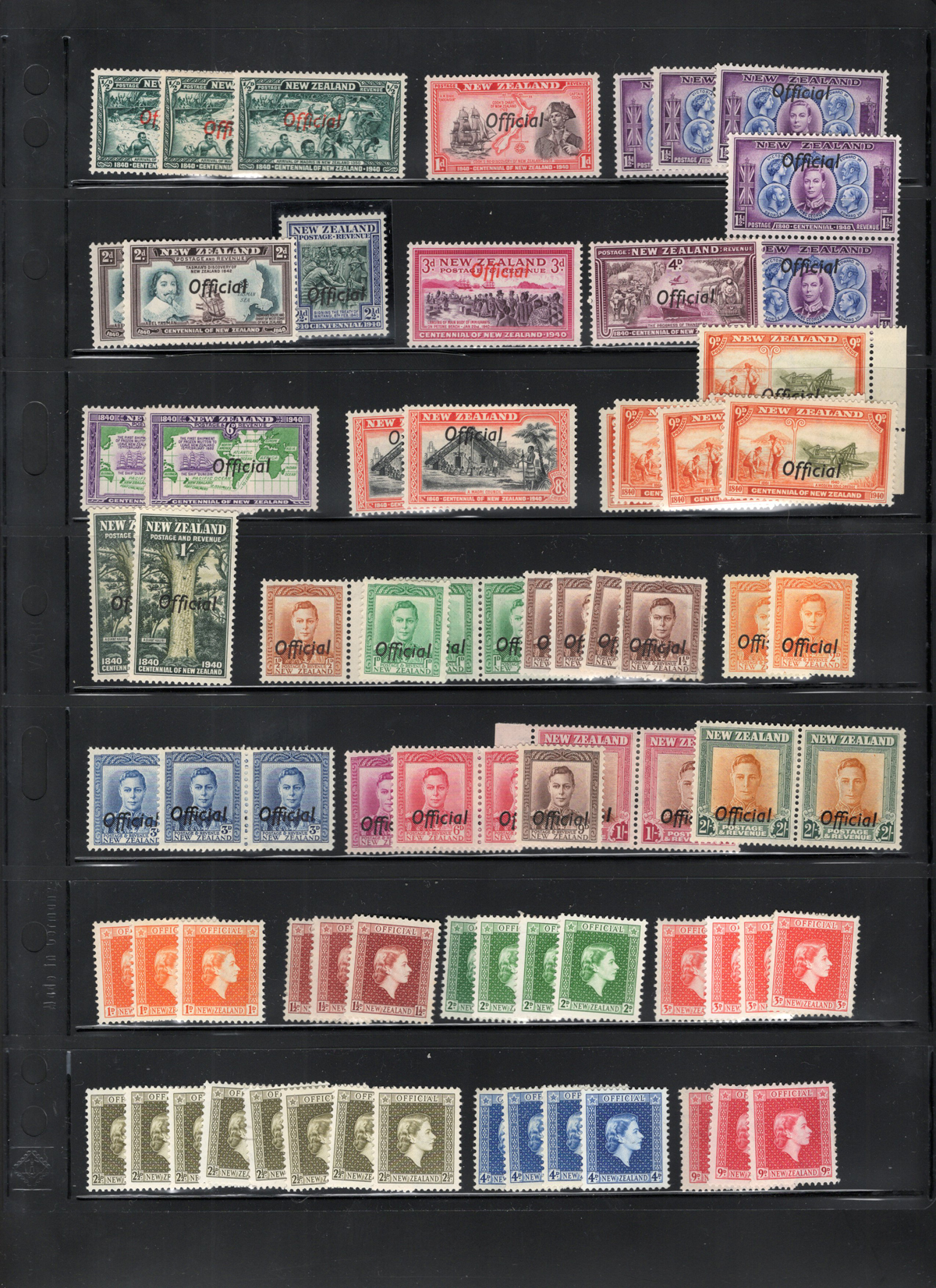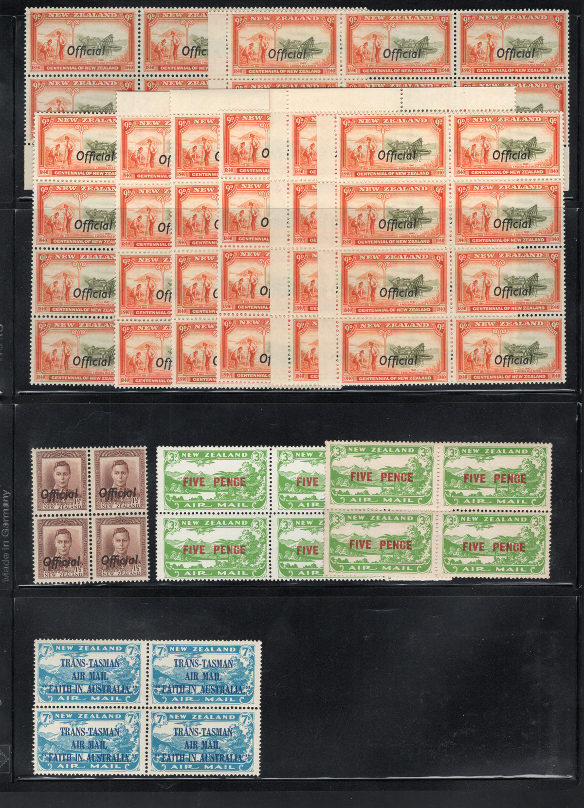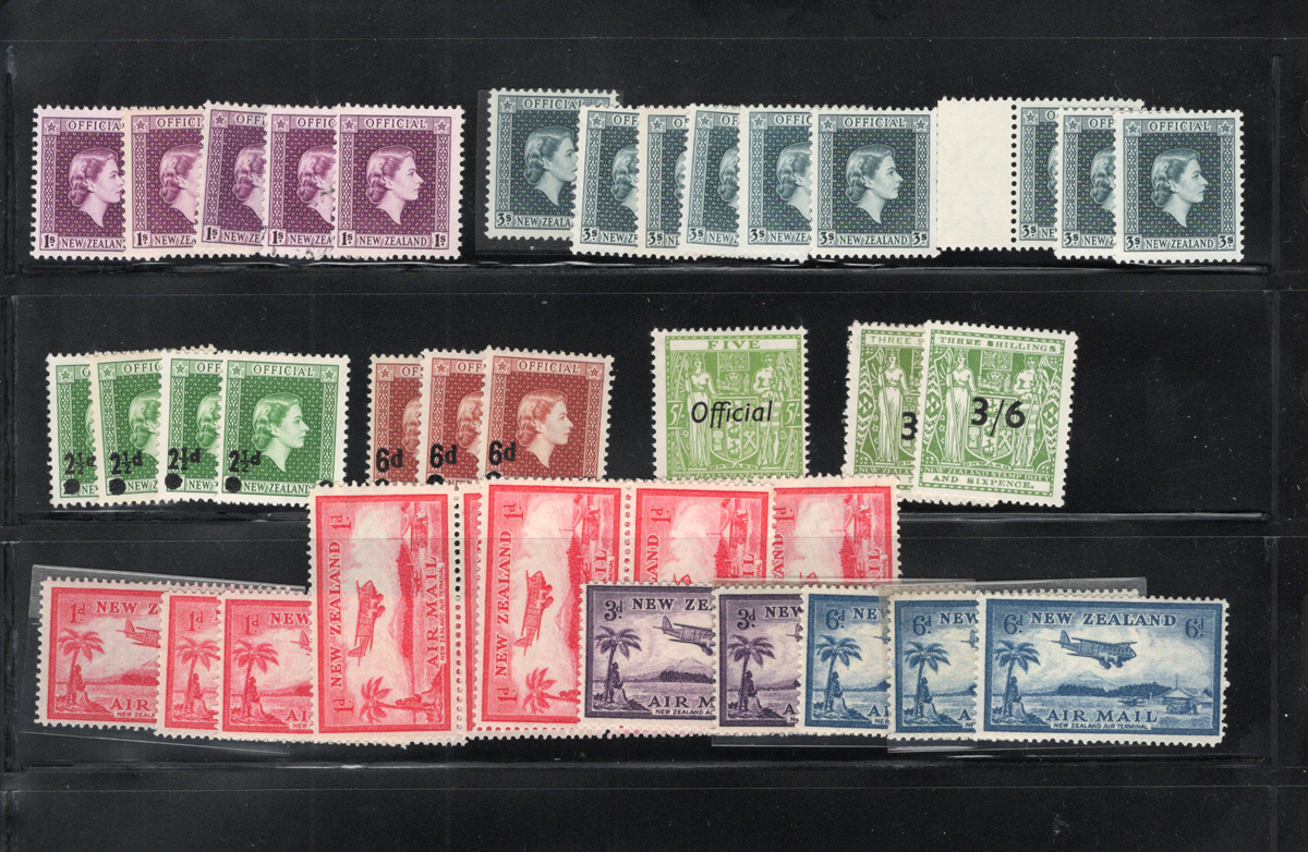697 og   imageGroup of Mint New Zealand Officials, Airmails and Early Ross Dependency, the Officials start at the 1940 Centennial issue, through the King George VI period and ends with 9 copies of the QEII 3sh. There are a couple of blocks of air mails and decimal Ross Dependencies and a large block of the “Health” hiker. Fresh appearance, with a wide range of hinging. Scott #s O76/O111, C4/C8, L5-L8, B12. (Scan 1) (Scan 2) (Scan 3) (Scan 4) (All Scans) (All Images)