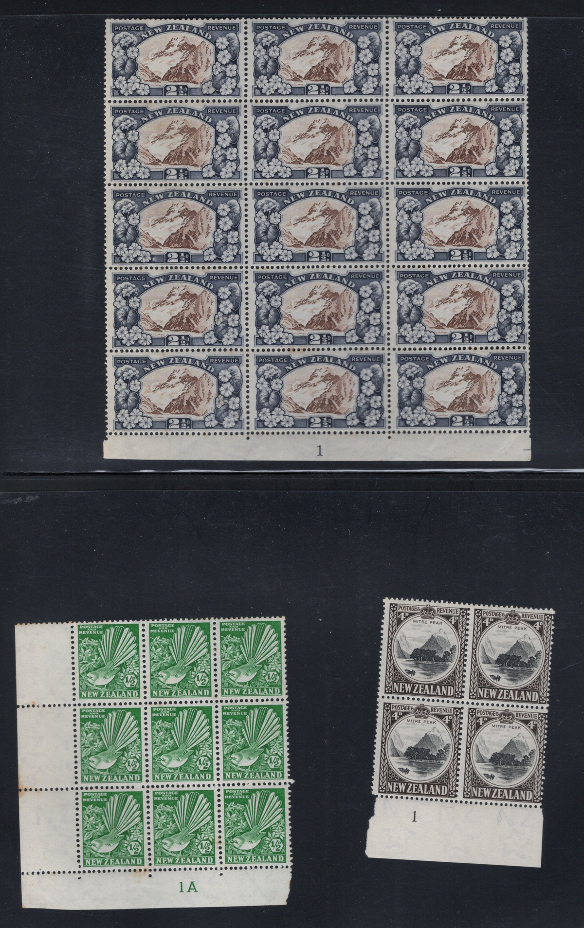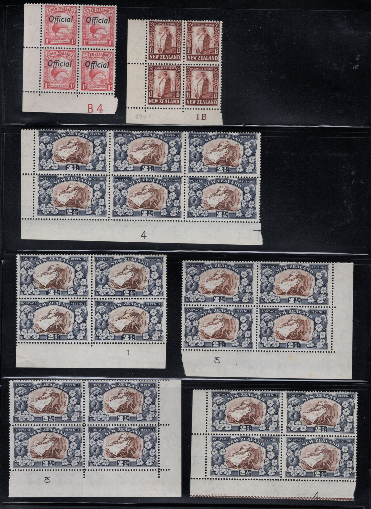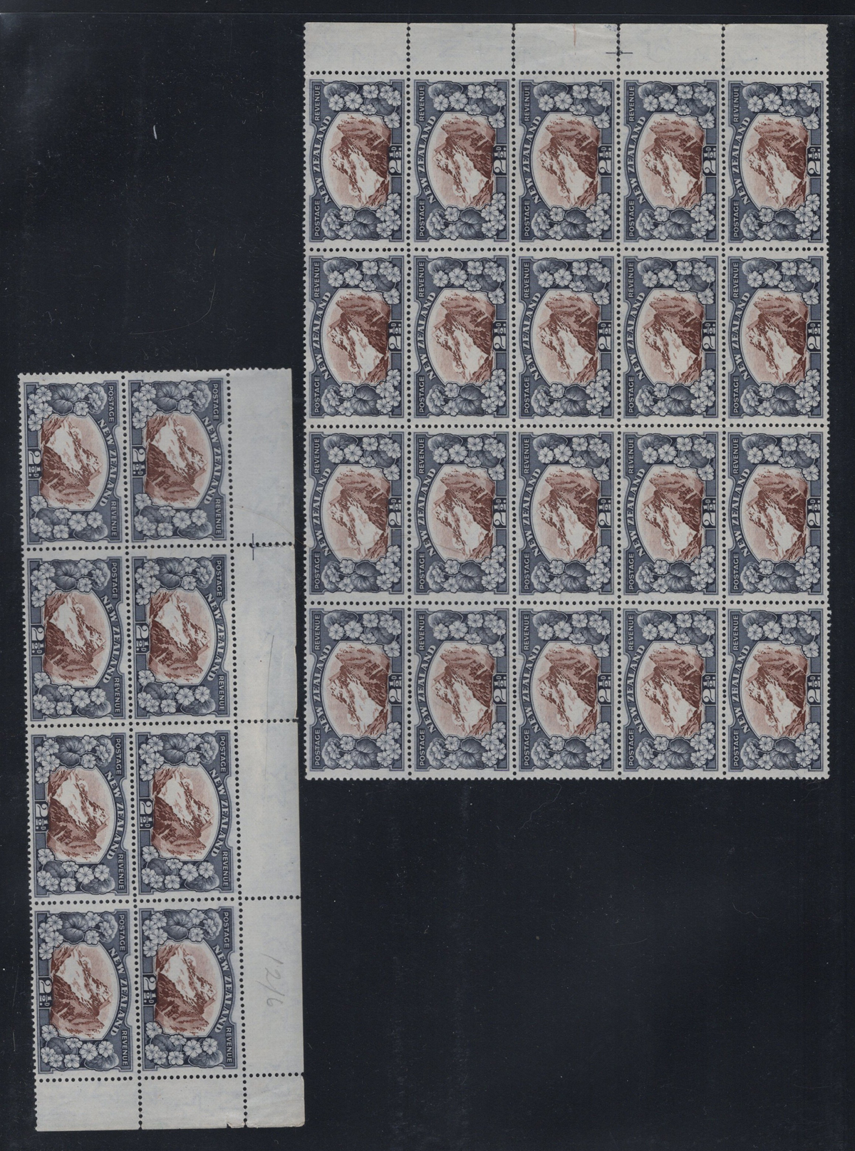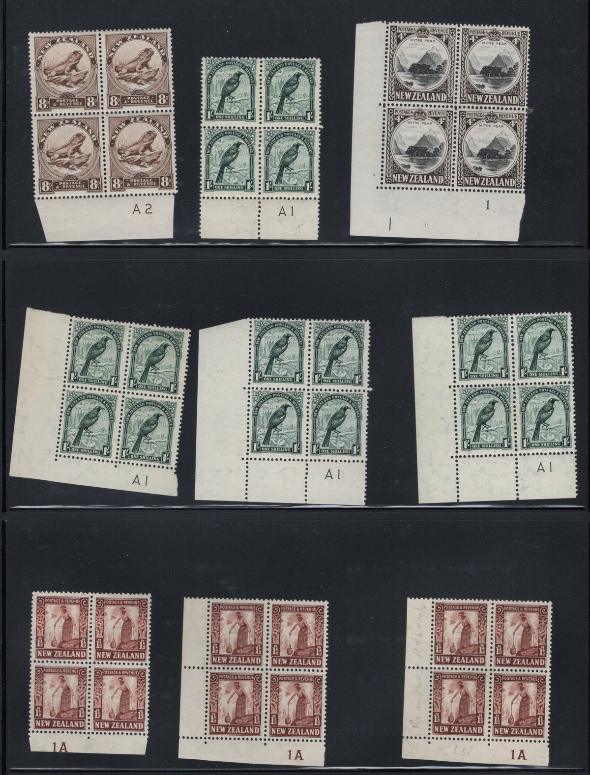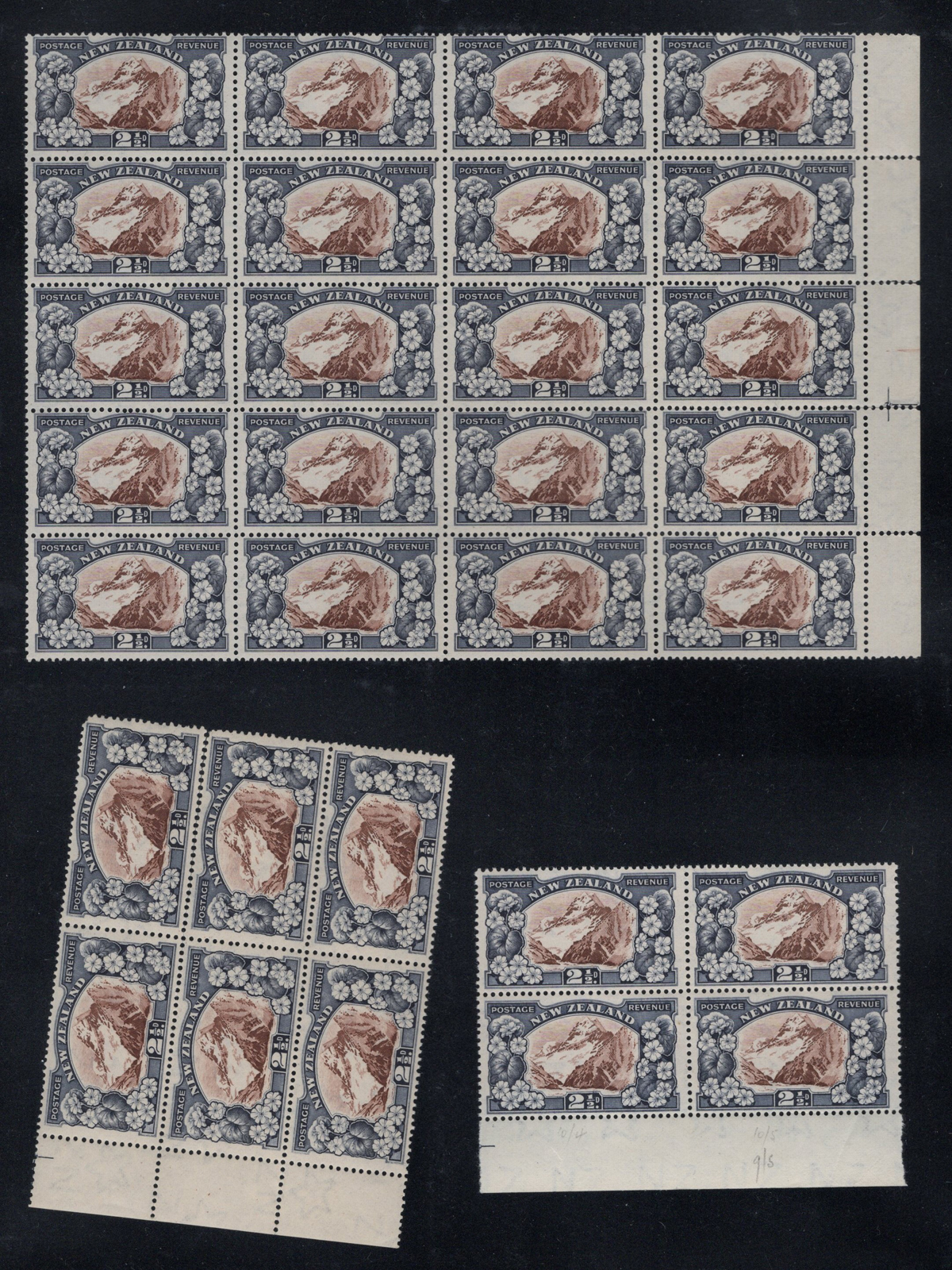 700 og/nh   imageAccumulation of the New Zealand 1935 Series, 2nd Watermark, in Large Blocks, from the 2½d Mount Cook to the 9d “Maori Panel”, 8 pages of multiples from 4 to 64. All mint and fresh, most are never hinged. Includes some black bars in selvedge. Lots of catalogue value and unchecked for plate flaws. (Scan 1) (Scan 2) (Scan 3) (Scan 4) (Scan 5) (Scan 6) (Scan 7) (Scan 8) (All Scans) (All Images)