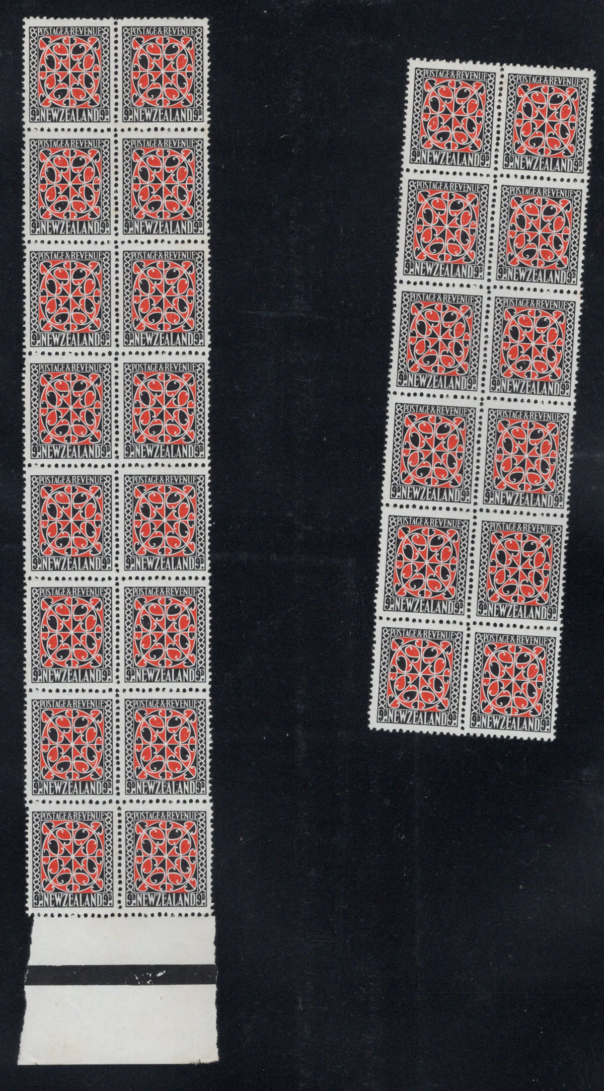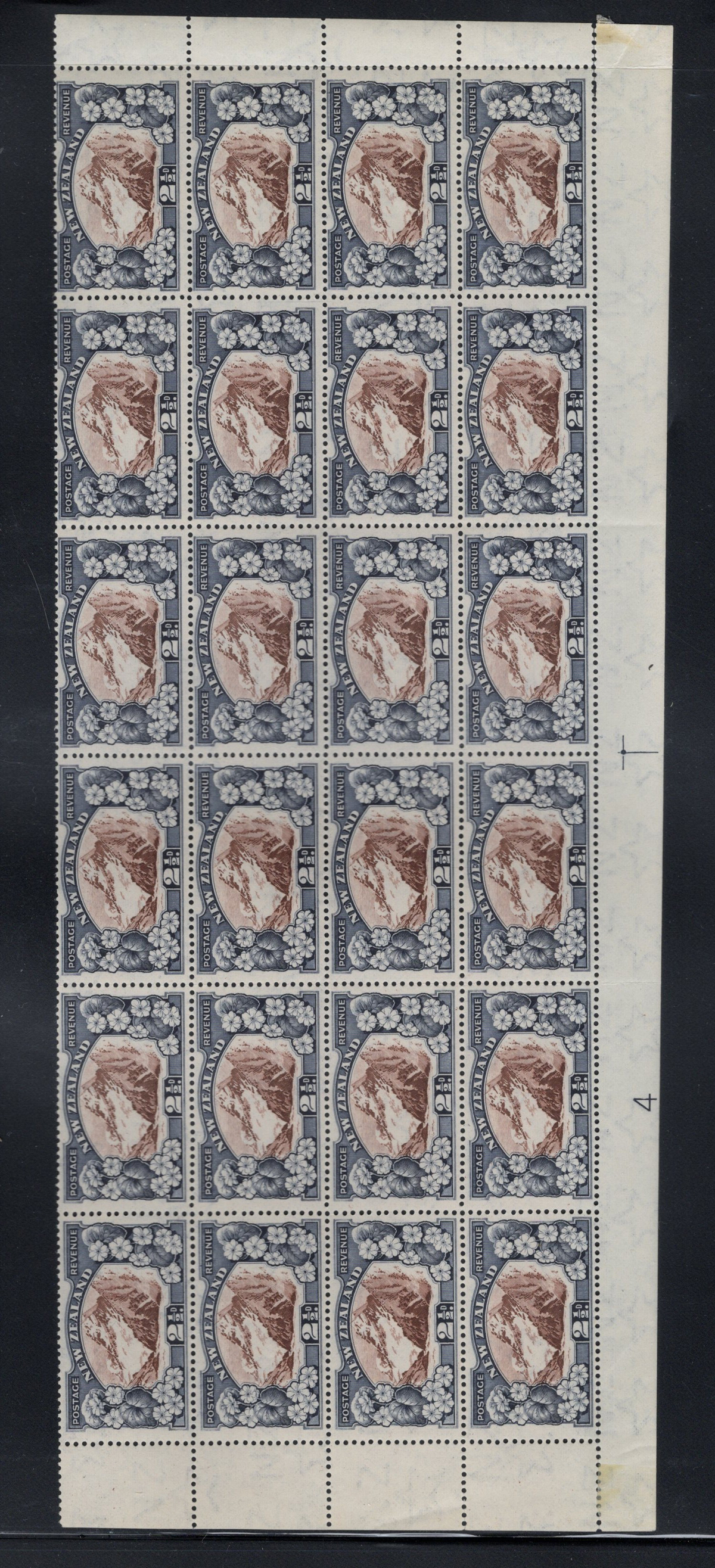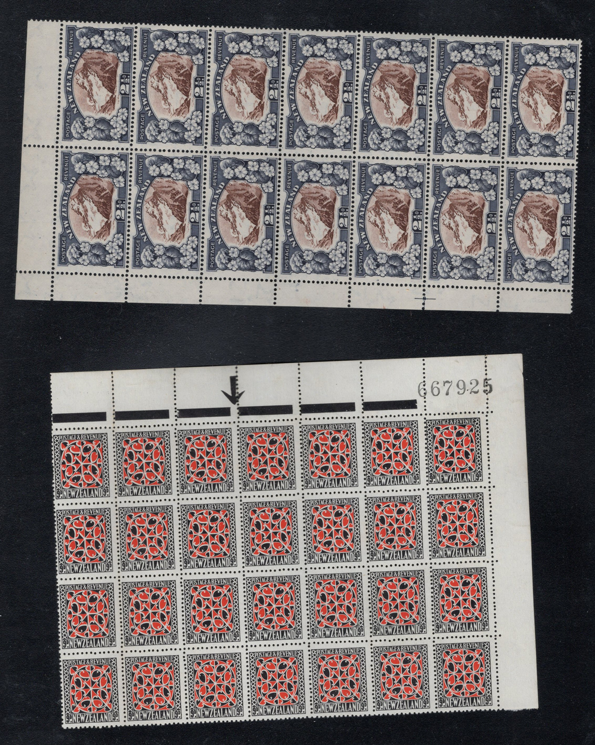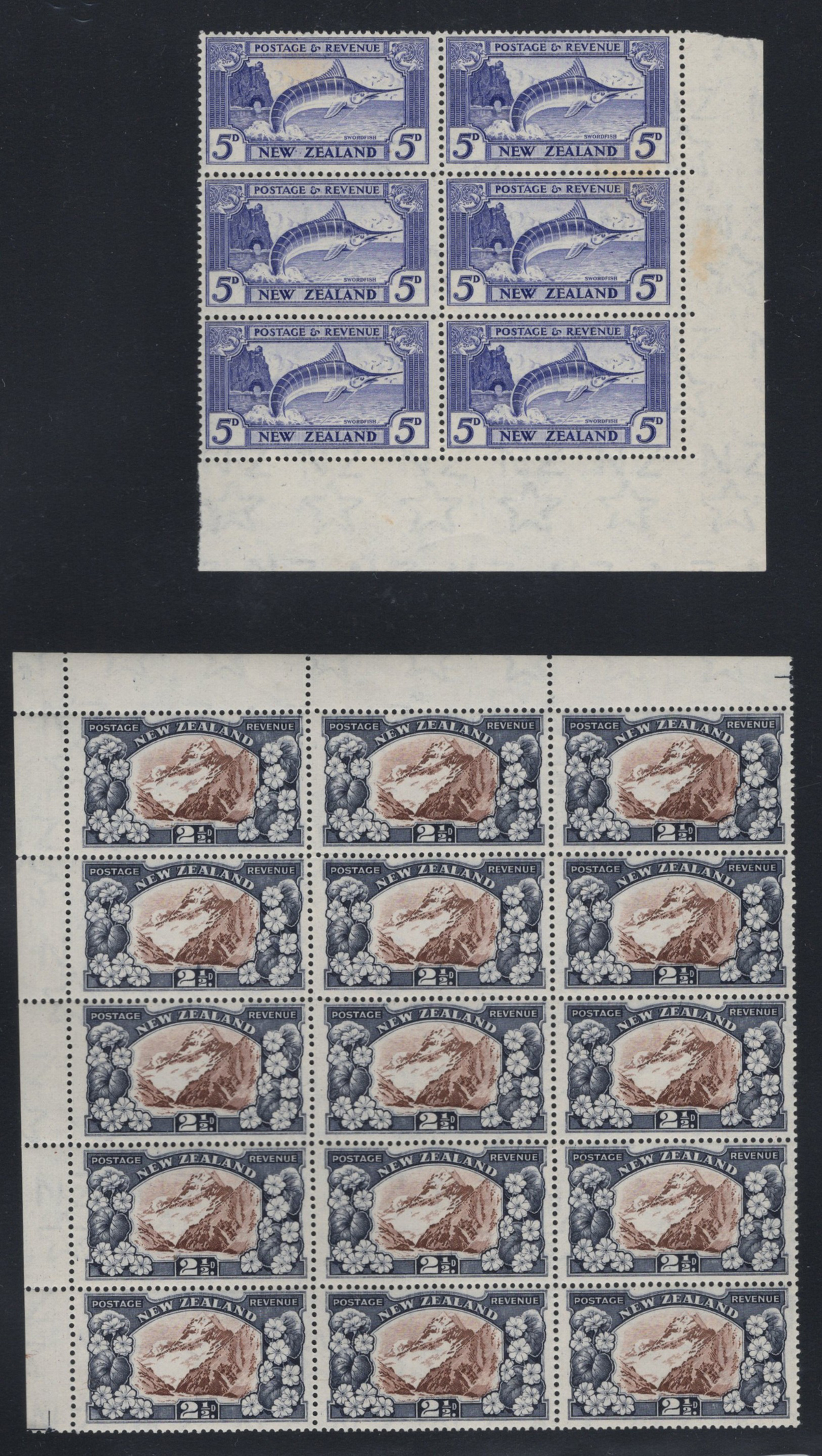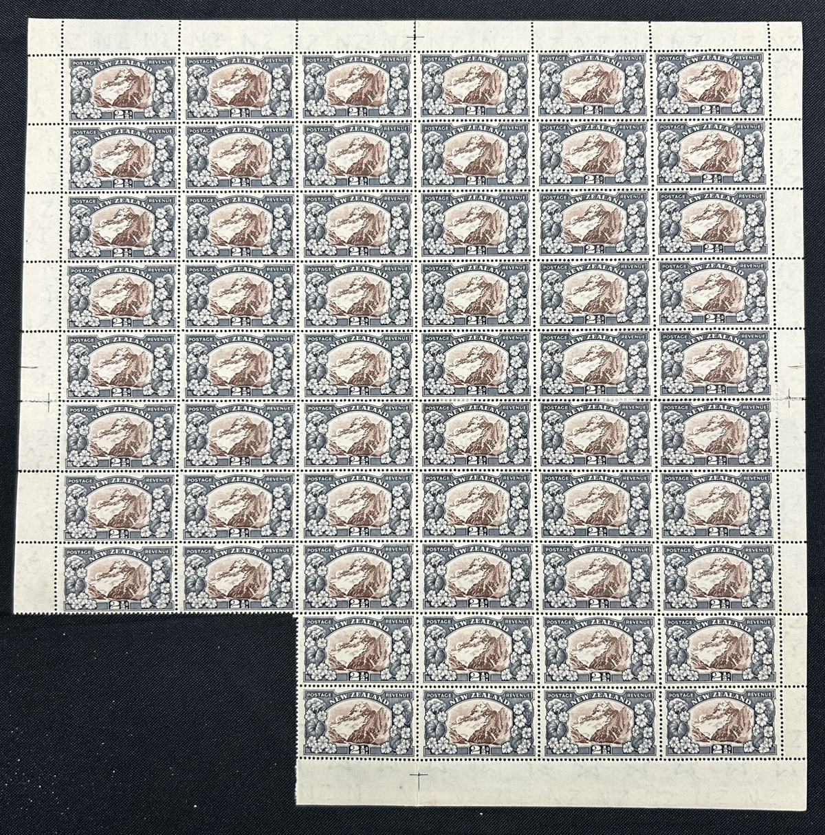 700 og/nh   imageAccumulation of the New Zealand 1935 Series, 2nd Watermark, in Large Blocks, from the 2½d Mount Cook to the 9d “Maori Panel”, 8 pages of multiples from 4 to 64. All mint and fresh, most are never hinged. Includes some black bars in selvedge. Lots of catalogue value and unchecked for plate flaws. (Scan 1) (Scan 2) (Scan 3) (Scan 4) (Scan 5) (Scan 6) (Scan 7) (Scan 8) (All Scans) (All Images)
