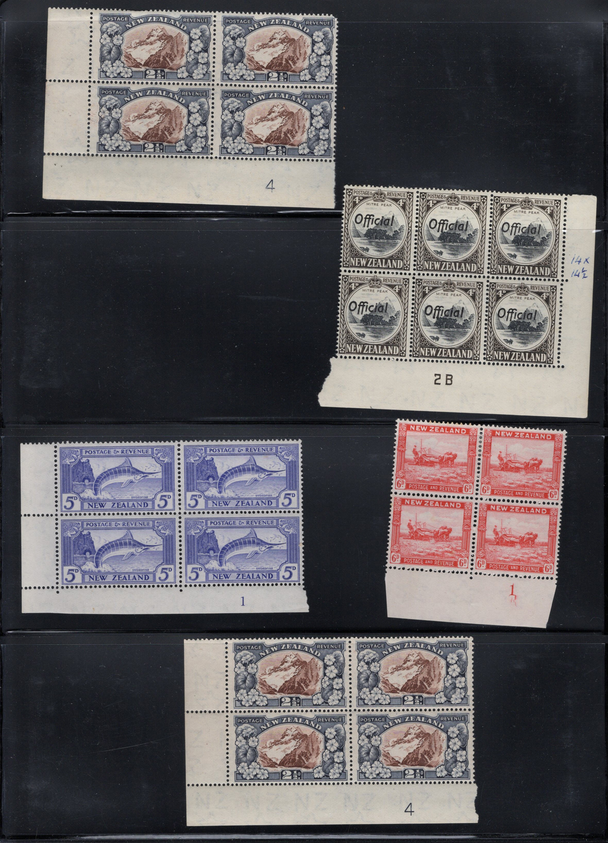 699 og/nh   imageGrouping of the New Zealand 1935 Series in Mint Plate Blocks, (presumably) from the Second Watermark, unchecked by us for re-entries and different plate numbers. Fresh, most are lightly or never hinged, all items scanned online. (Scan 1) (Scan 2) (Scan 3) (Scan 4) (Scan 5) (All Scans) (All Images)