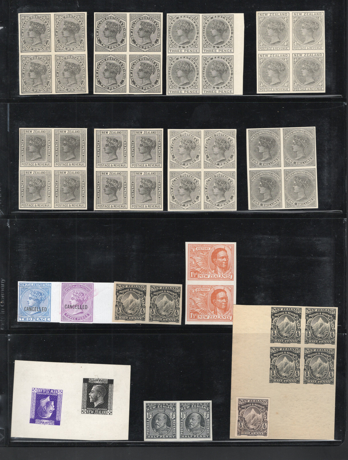 696 E/P   imageGroup of New Zealand Die and Plate Proofs Filling a Stock Page, with two colour singles overprinted “Cancelled” from the first QV “Sideface” issue and blocks of four in black on unwatermarked stamp paper from the “2nd Sideface” issue (with both dies of the 6d). There is a block, pair and single of the ½d Mt. Cook from the 1898 Pictorials, a pair of the ½d KEVII and a colour proof of the 1½d Victory issue. The dual King George V die proof in black, with one impression in black and the other in purple (brighter than the colour used for the 2d and 4d), is unknown to us (a pencil notation on the back that it was obtained from “Rooke” in 1945).