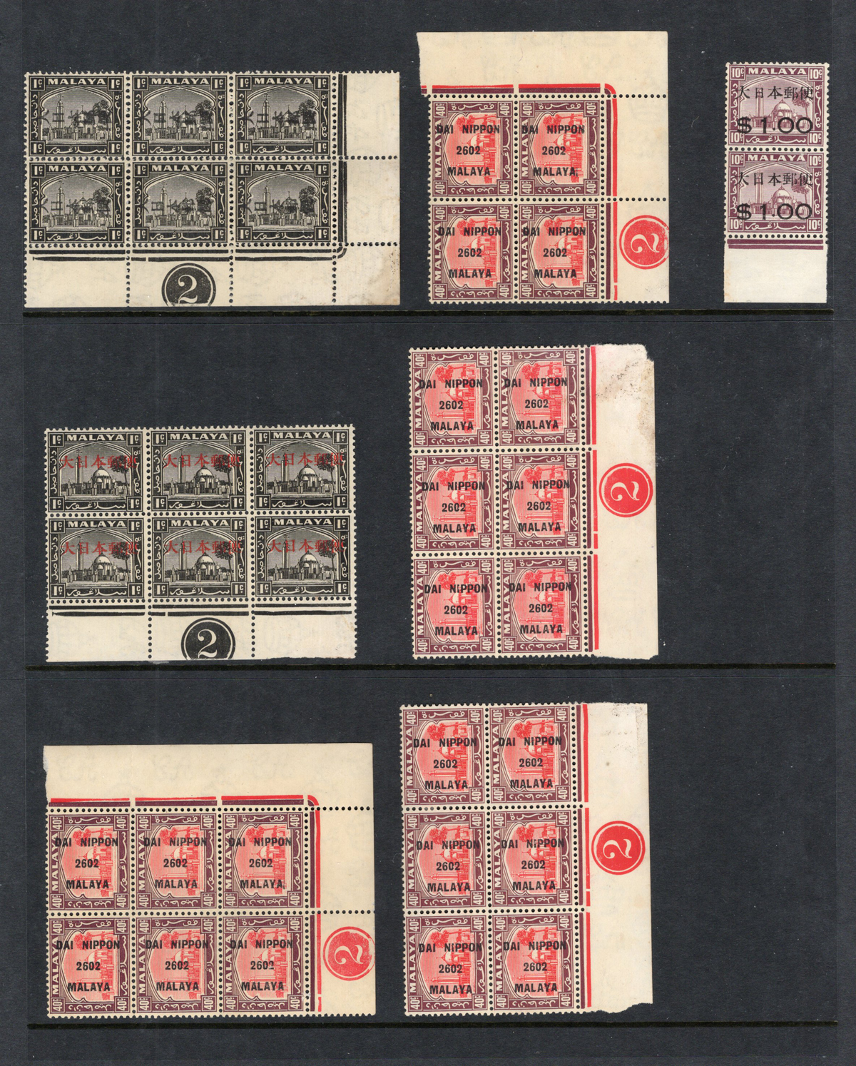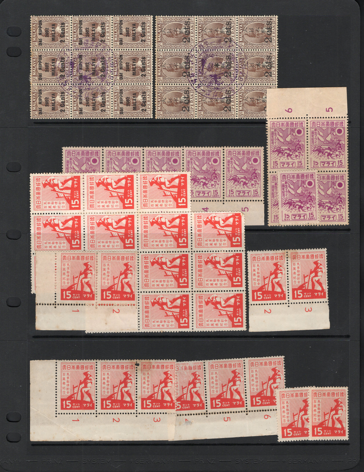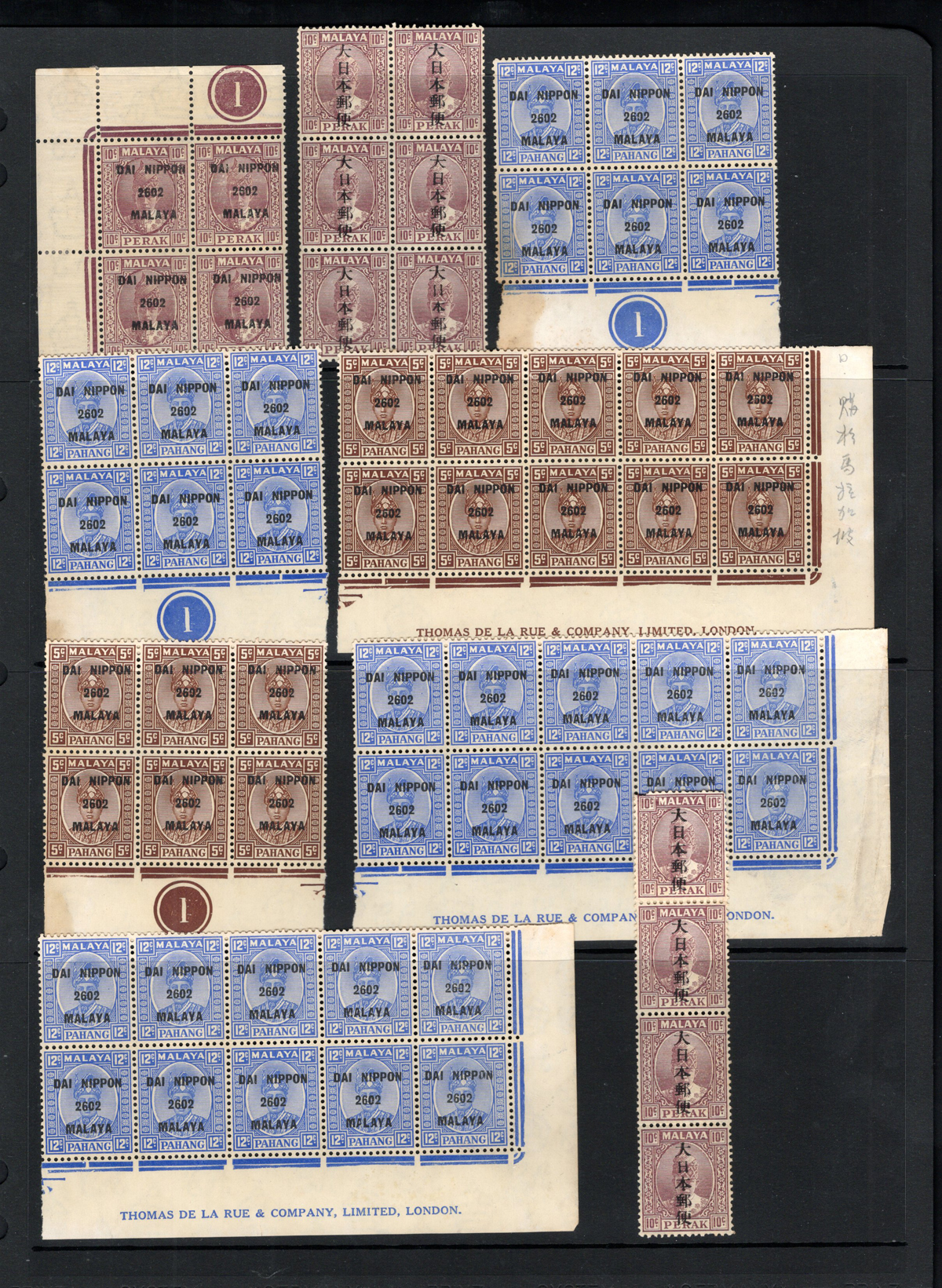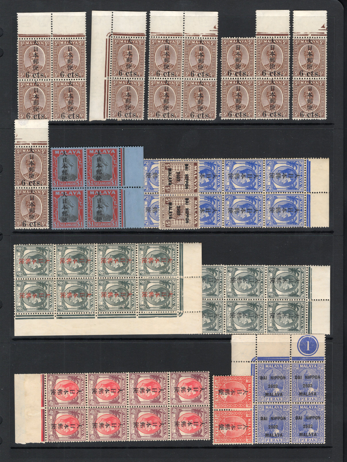 691 nh   imageGroup of Malaysian States Japanese Occupation Stamps, all mint never hinged, with Perak, Straits Settlements, Negri Sembilan, Selangor and Pahang issues overprinted by the Japanese occupation. All in multiples, including many with sheet margins and some plate inscription blocks. Overall fine, with light stains on two stamps. (Scan 1) (Scan 2) (All Scans) (All Images)