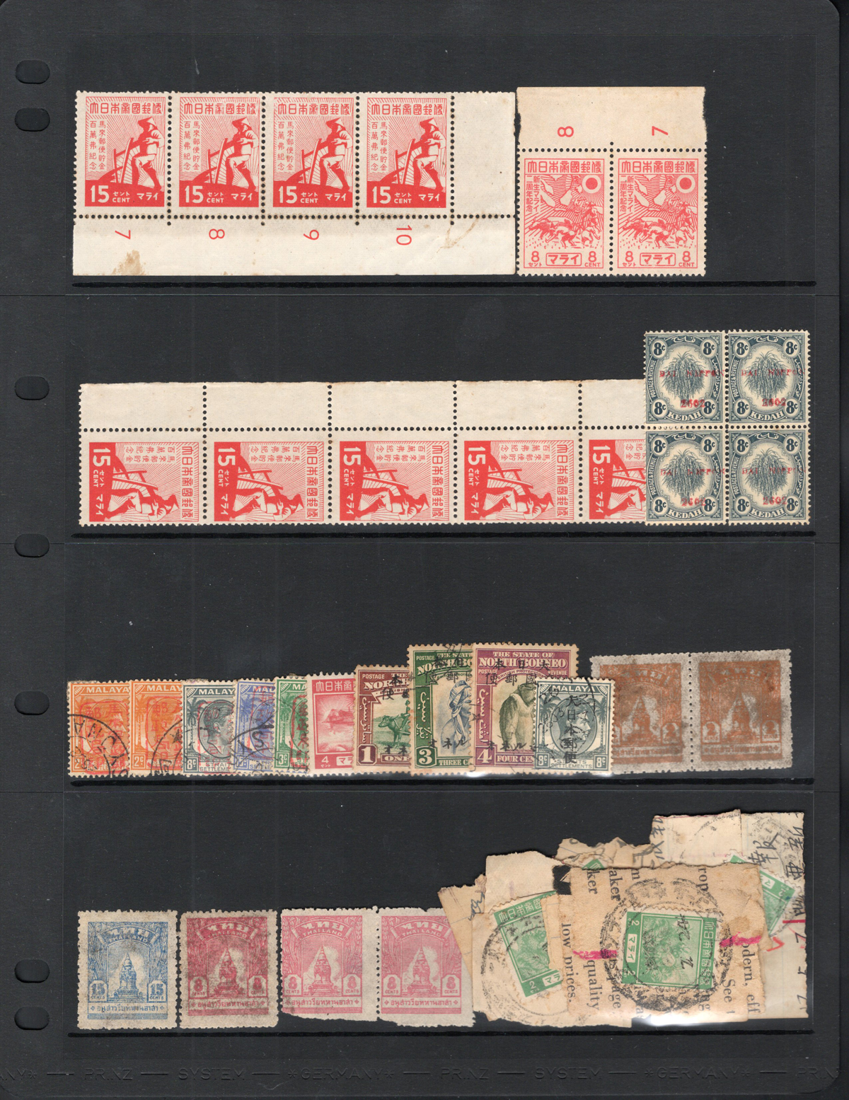 692 O/og/nh   imageGroup of Mint and Used Japanese Occupation Stamps, with overprinted and regular issues from Straits Settlements, Kedah, Perak, Malaya, North Borneo and more, including some issued under Thai occupation. Mix of mint and used plus some used on piece, noted Malaya #N34 in multiples totaling U$264, N43 (U$45), N42 (U$57), etc. Some items have stains or other small faults, else overall fine. Our photos show an overview of the lot. (Scan 1) (Scan 2) (All Scans) (All Images)