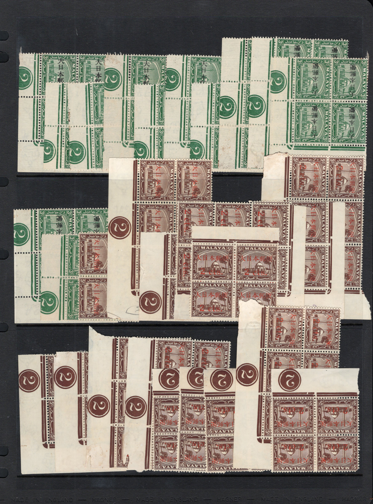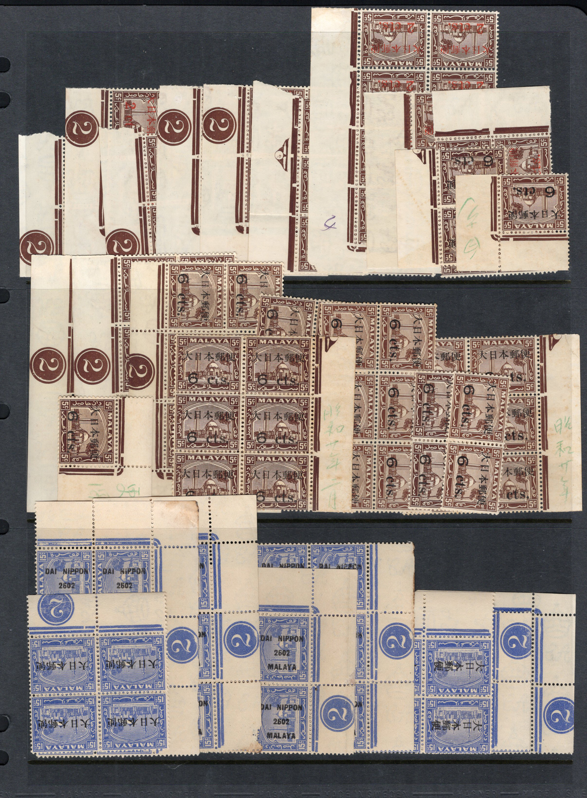 690 nh   imageGroup of Malaysia Selangor Japanese Occupation Stamps, all mint never hinged, includes Scott #s N19, 22, 24, 27-29, N30 (with overprints reading both ways), 31-34, 36, and 38, all in various quantities of multiples (majority are blocks of 4 or 6) most with sheet margins, many with plate inscriptions. Some stamps have the usual brownish gum, or light stains, still overall fine or better. (Scan 1) (Scan 2) (Scan 3) (Scan 4) (All Scans) (All Images)