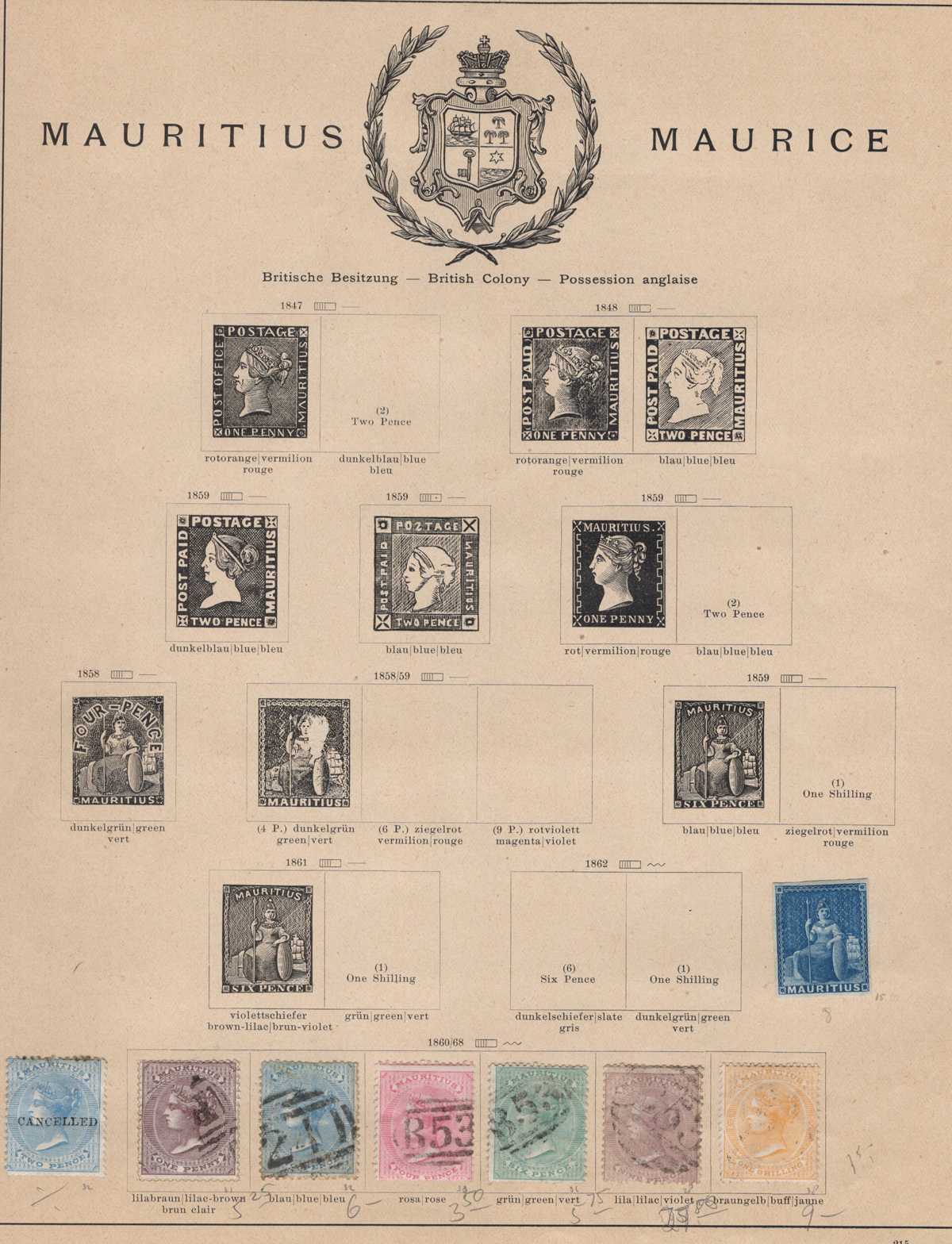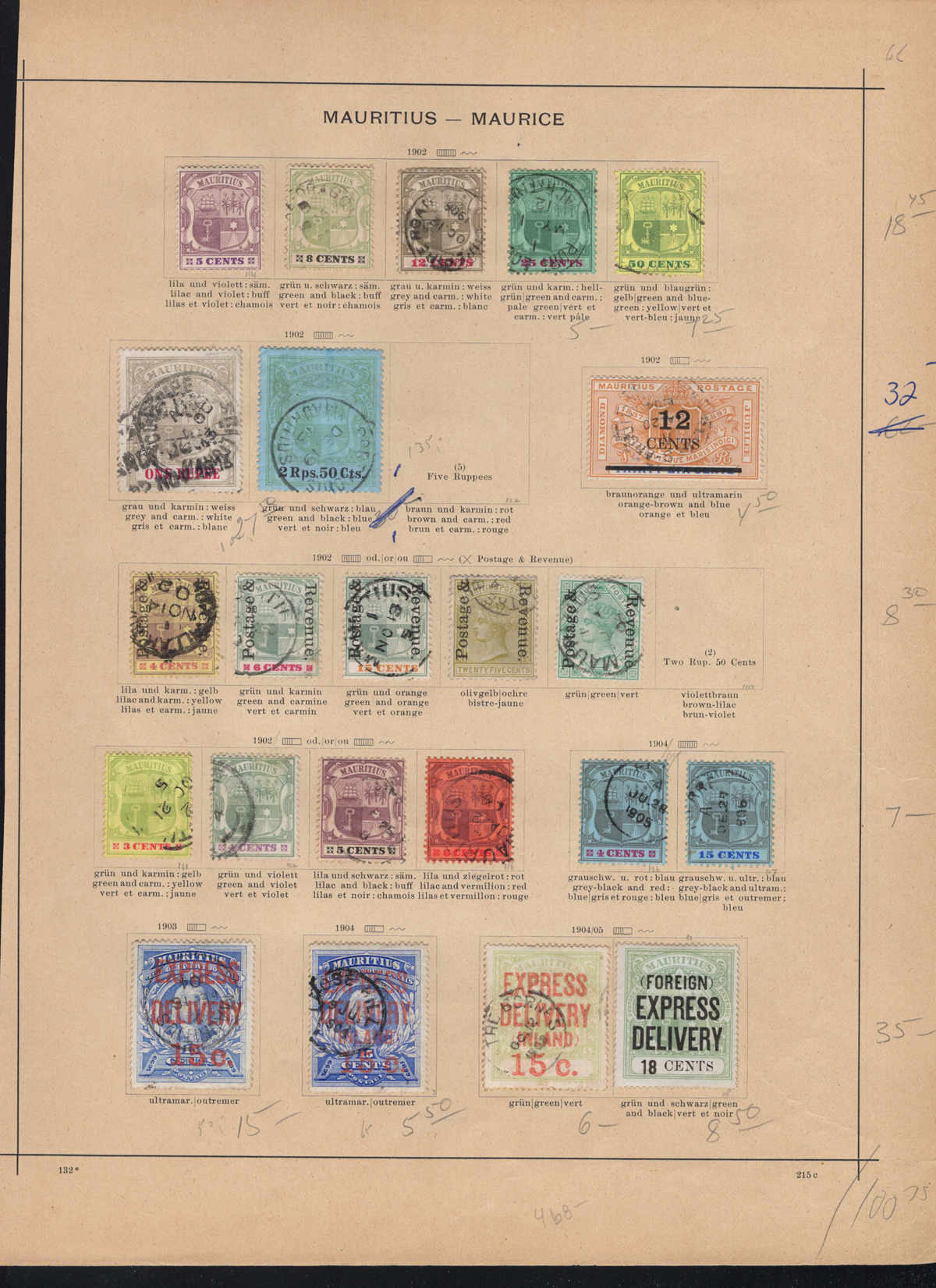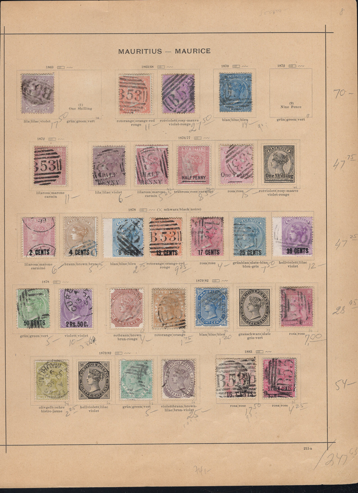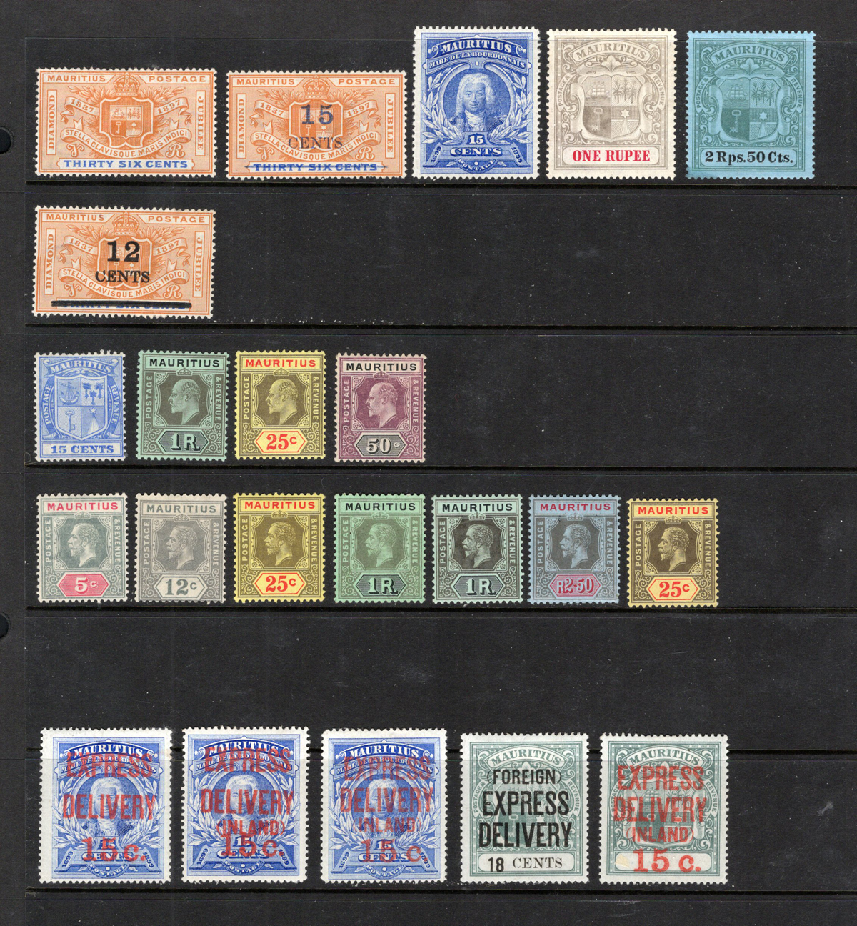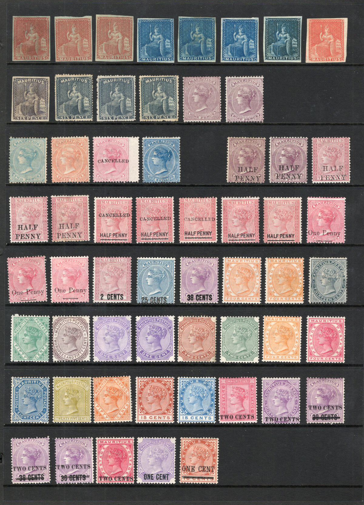 693 og 7/160 imageValuable Collection / Holding of Mint Mauritius, 1849-1916, on two black stock pages, with 81 stamps (59 different), with duplication of some, includes 5 different Special Delivery issues. A great offering of good quality mint hinged stamps, noting several that have high catalogue values. 4 stamps with the “CANCELLED” overprint were not counted in the catalogue value. A generally fine or better group. (Scan 1) (Scan 2) (All Scans) (All Images)