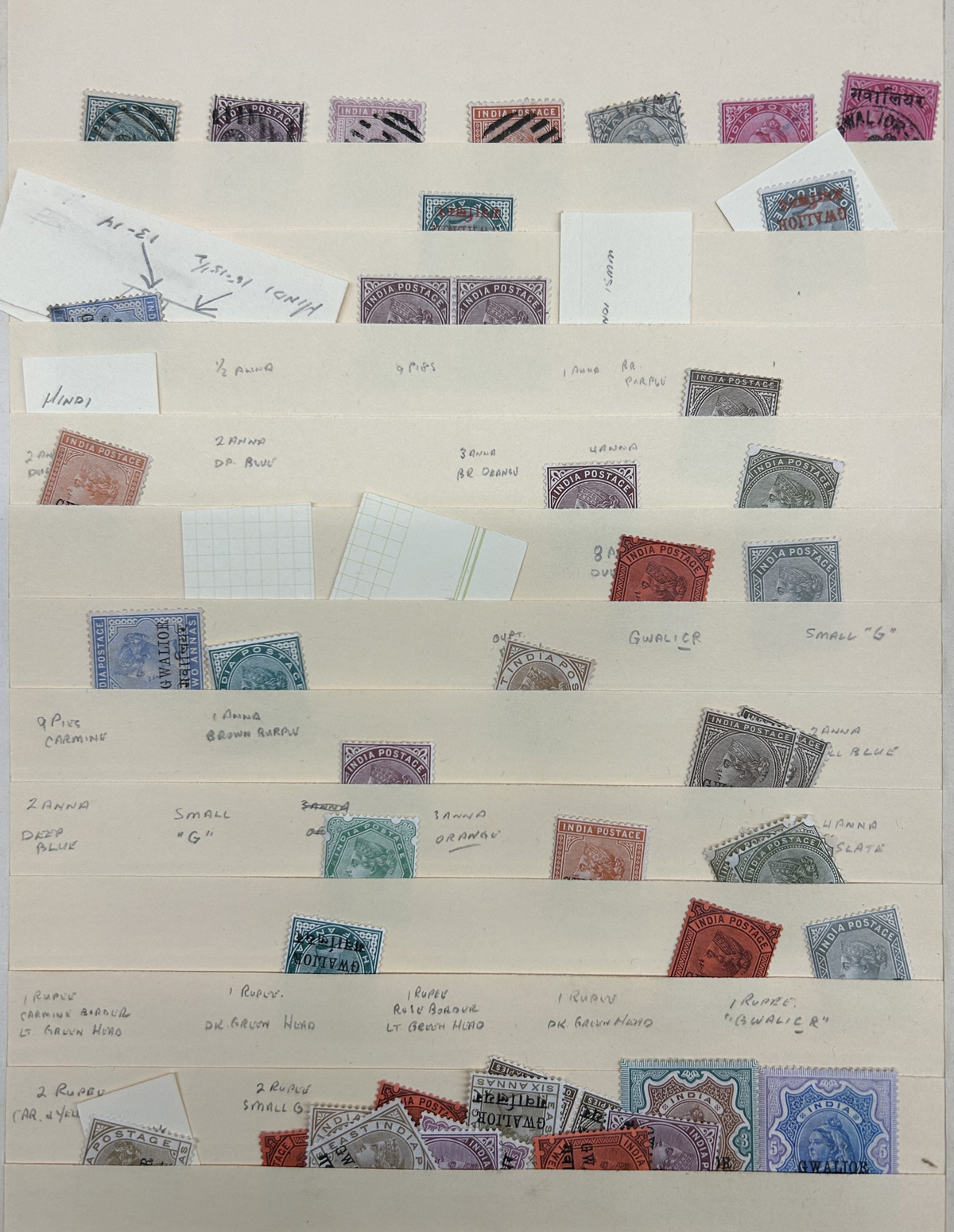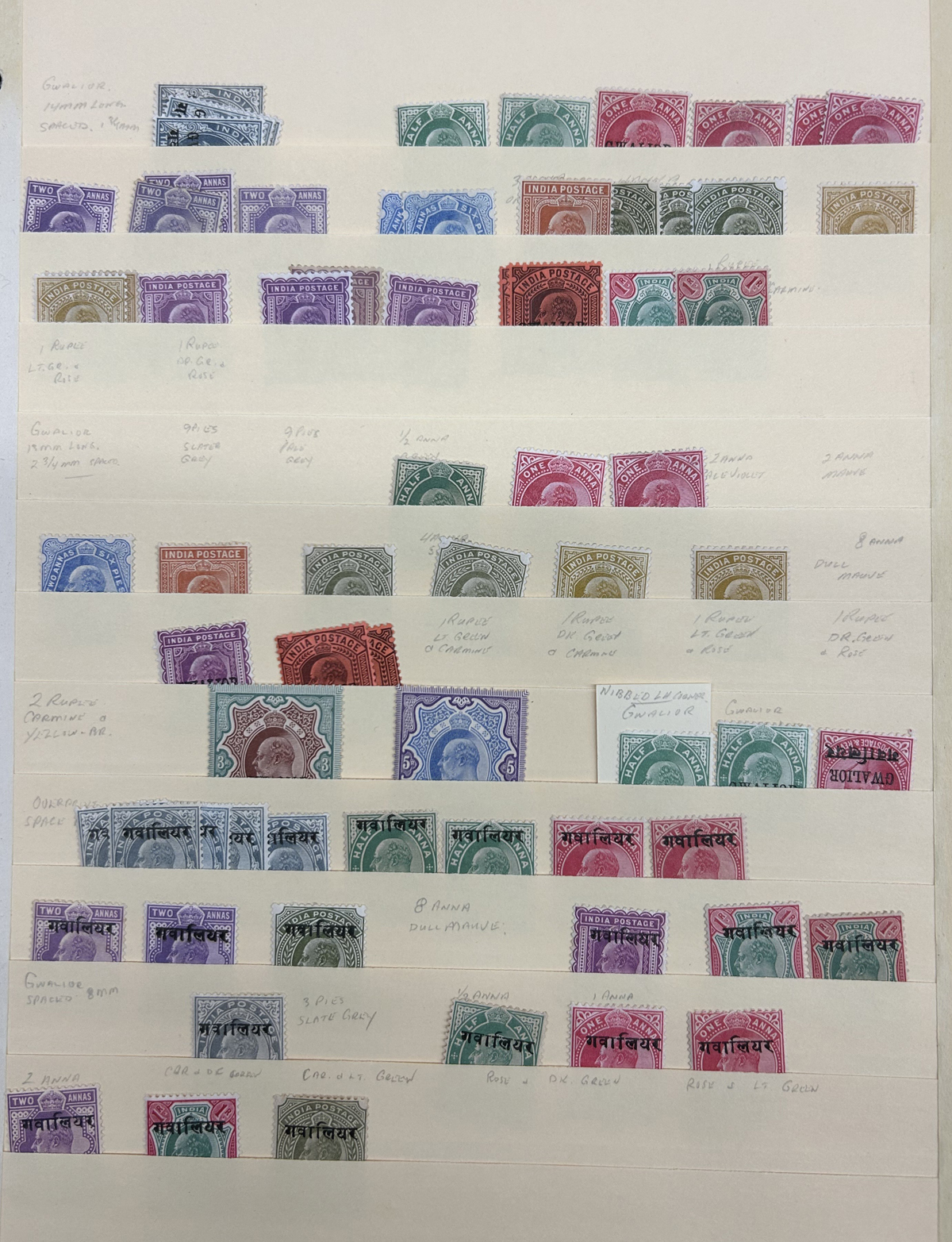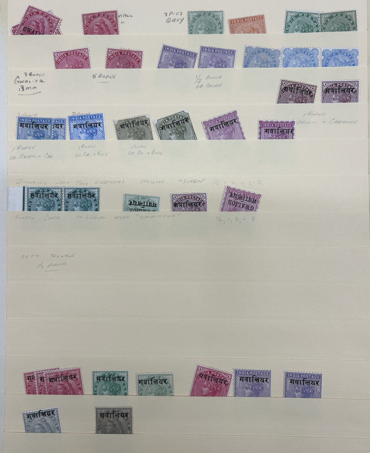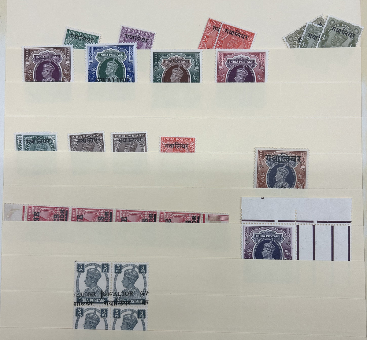 681 og/nh   imageCollection of Mint India Stamps Overprinted "GWALIOR" held in 5 Manila pages, appears to cover the whole range of issues from QV to KGVI, including Officials. Completely unchecked by us except to note that the owner has written-up several overprint varieties, saw many high values, and we counted a total of about 240 stamps (including light duplication of some and not counting the 7 used stamps in the first row). Should yield surprises to the patient collector willing to take the time to sort them out, etc. Condition appears to be very nice throughout, all pages photographed online. (Scan 1) (Scan 2) (Scan 3) (Scan 4) (Scan 5) (All Scans) (All Images)