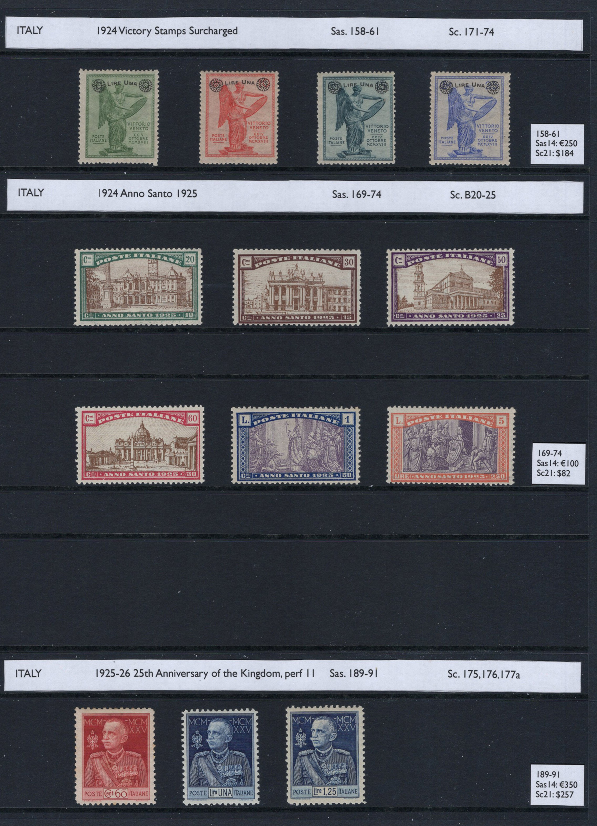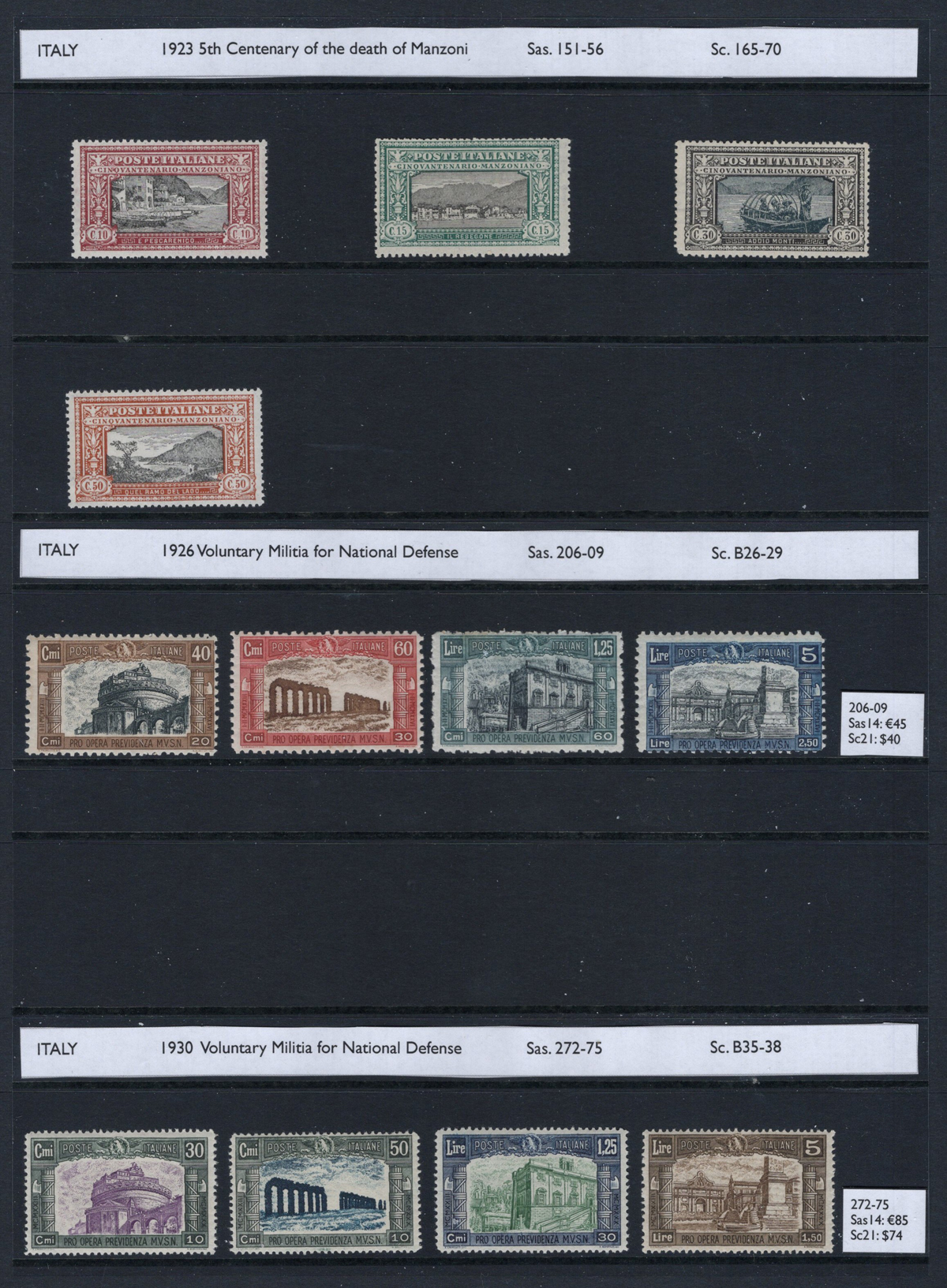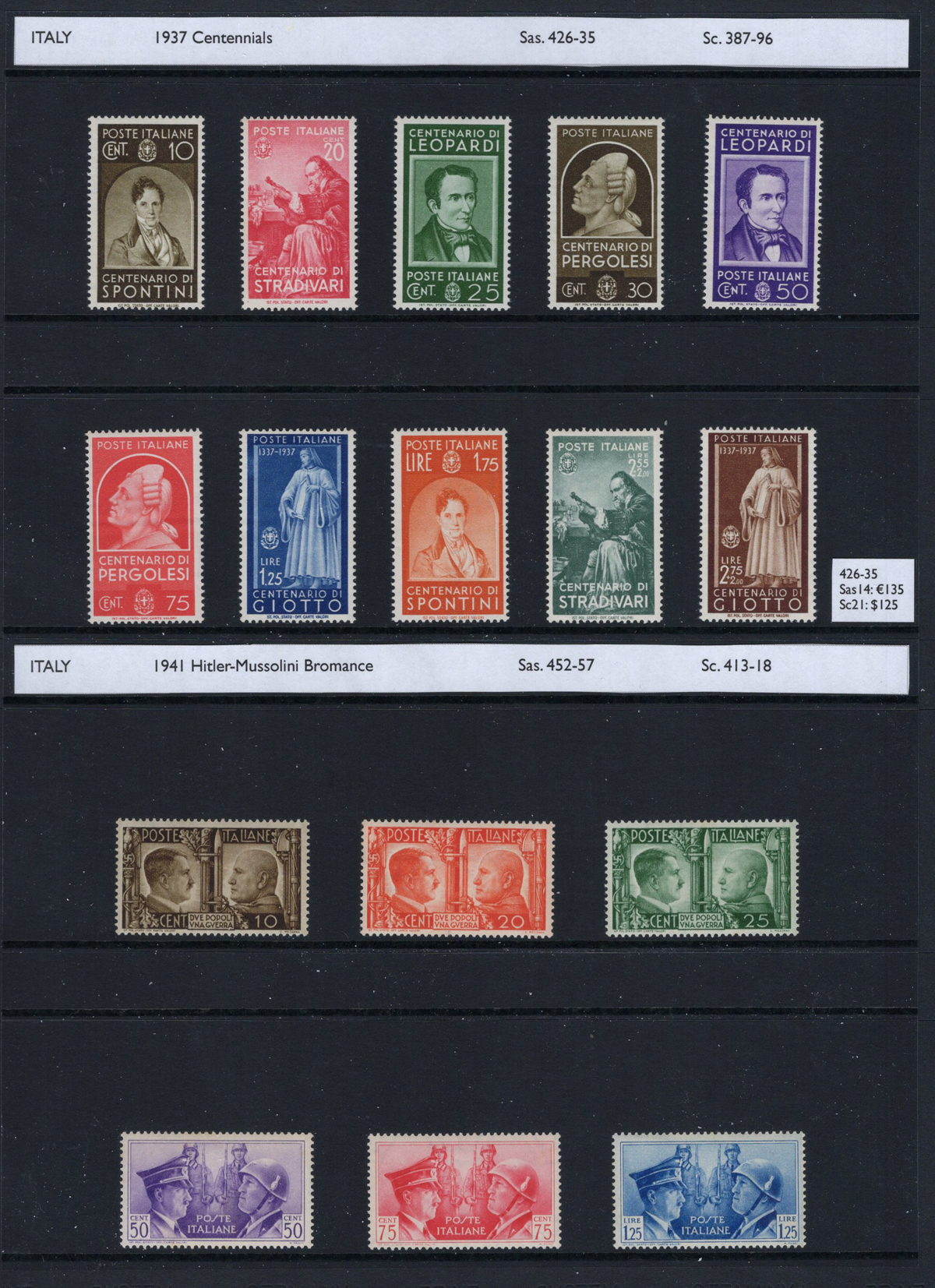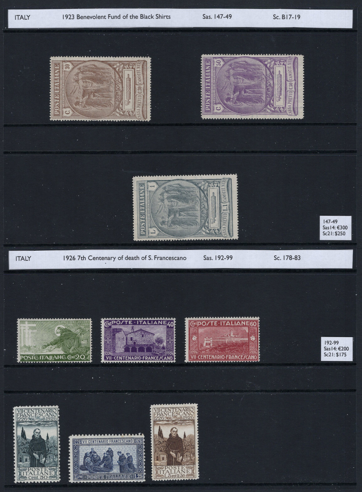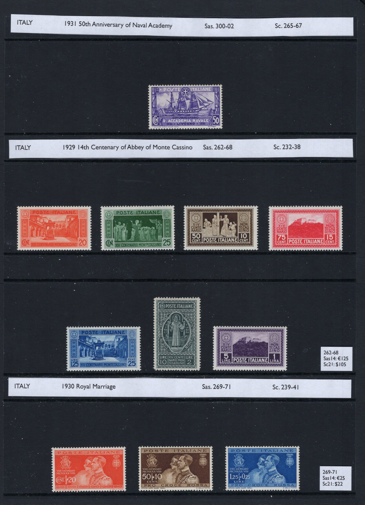 688 og/nh 49/426, etc. imageCollection of Mint (Mostly Never Hinged) Italy, 1879-1945, all mint never hinged, except for 3 early stamps which are displayed upside-down. A very nice collection which includes many complete sets, part sets, and back of the book material. Some of the better items we encountered include #s 49 (hinged, $150), 89 and 90 ($146), 96/110 ($189), 58/65 ($151), B1-4 ($175), C1-2 ($120), C3/7 ($195), C10-11 ($200), 140-42 ($145), B17-19 ($250), 171-74 ($180), 177a ($250), 165-68 ($216), 210 ($175), 349/52 ($200), C42 and C45 ($110) and many more. The last three pages contain definitives in blocks of four, and the collection also includes (but not counted) is #135 with “B.L.P.” overprint. See our photos online for a small sampling. Overall fine to very fine and fresh. (Scan 1) (Scan 2) (Scan 3) (Scan 4) (Scan 5) (Scan 6) (Scan 7) (Scan 8) (Scan 9) (Scan 10) (All Scans) (All Images)