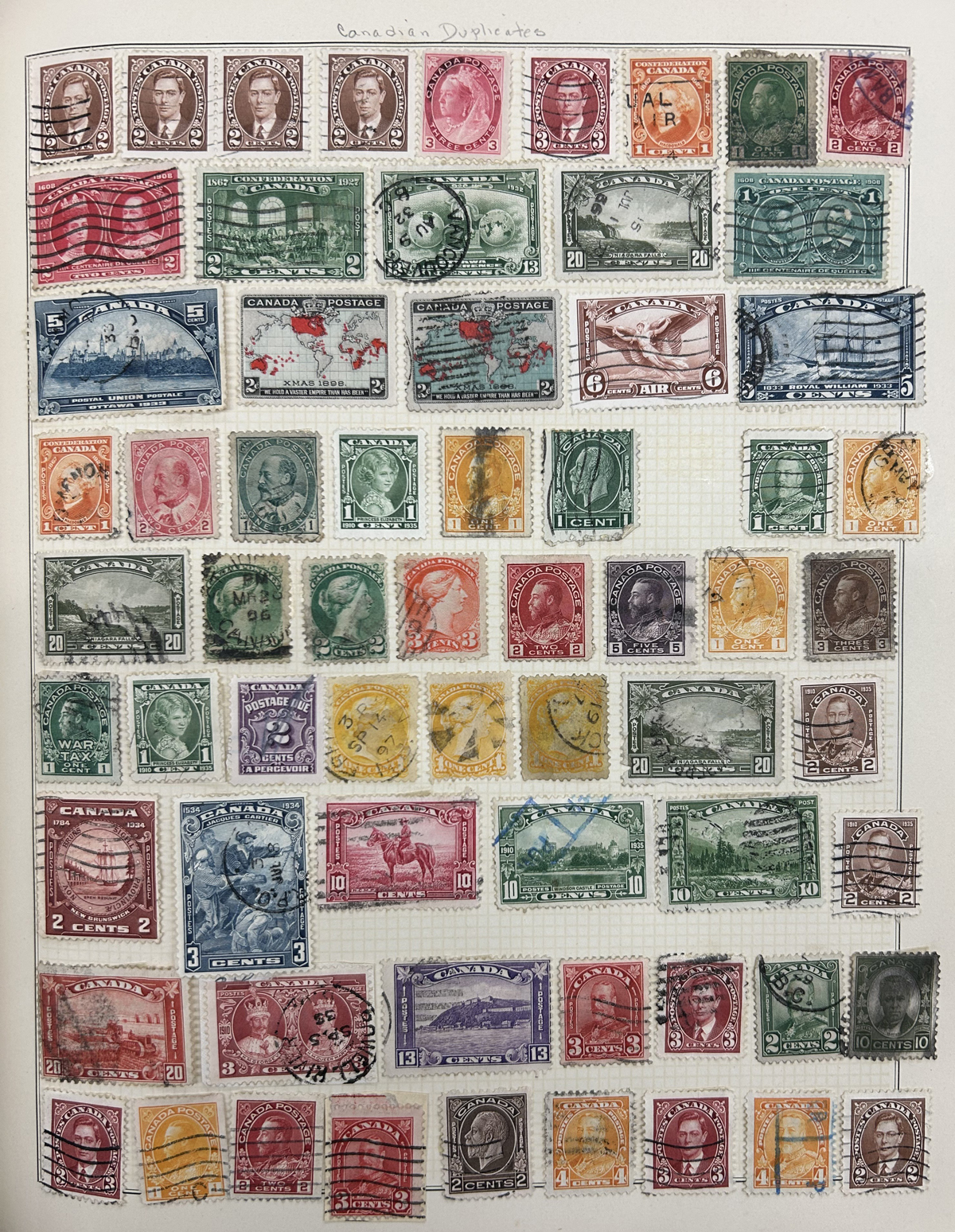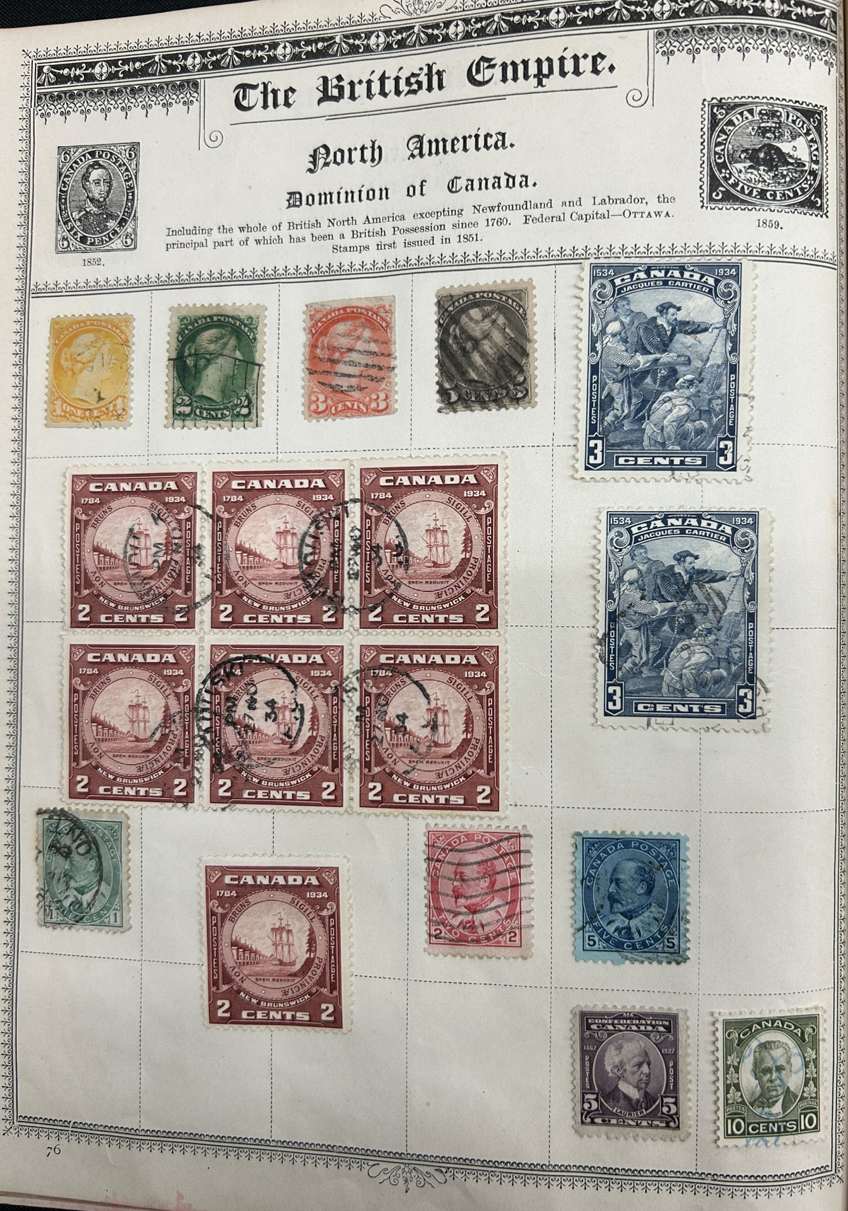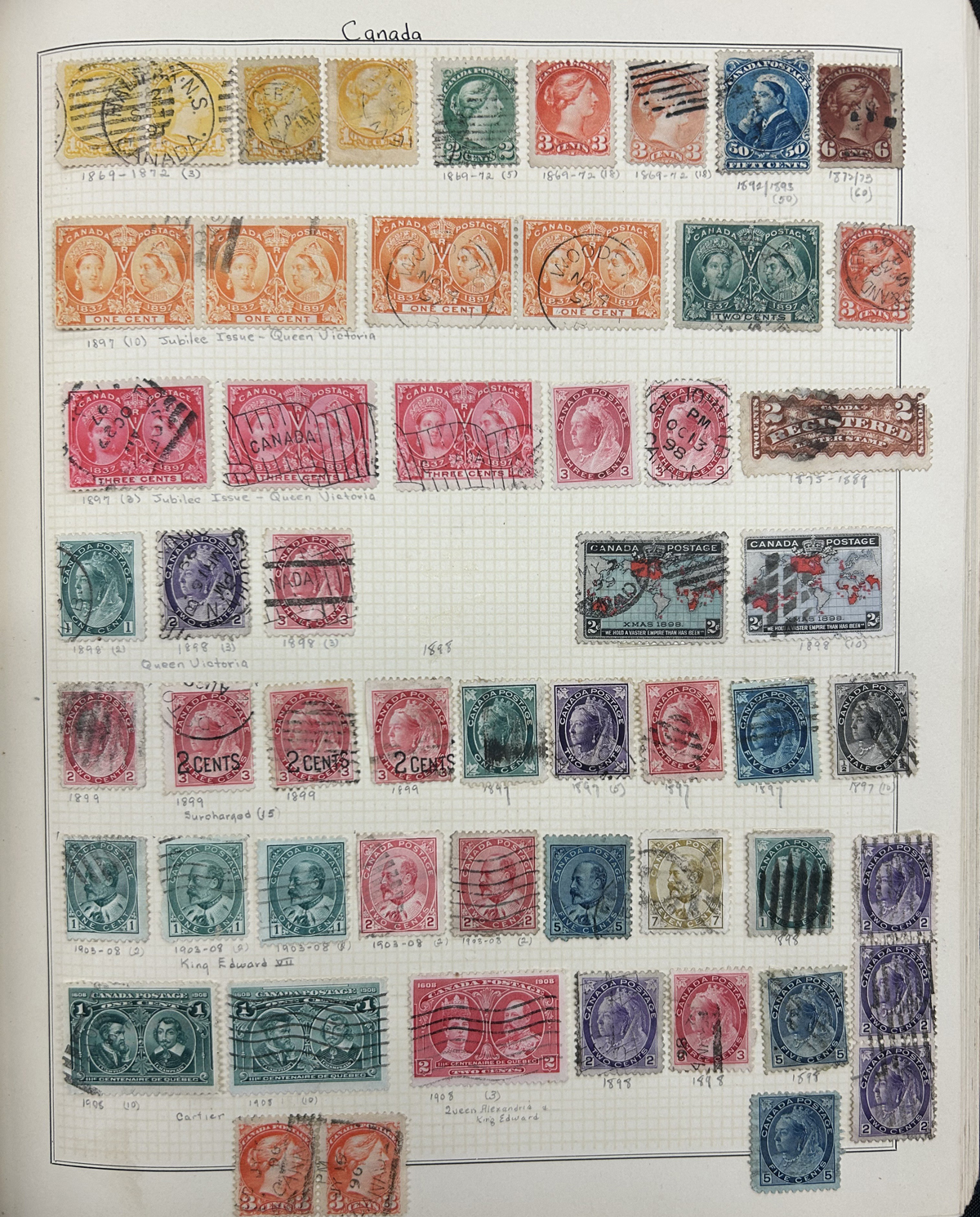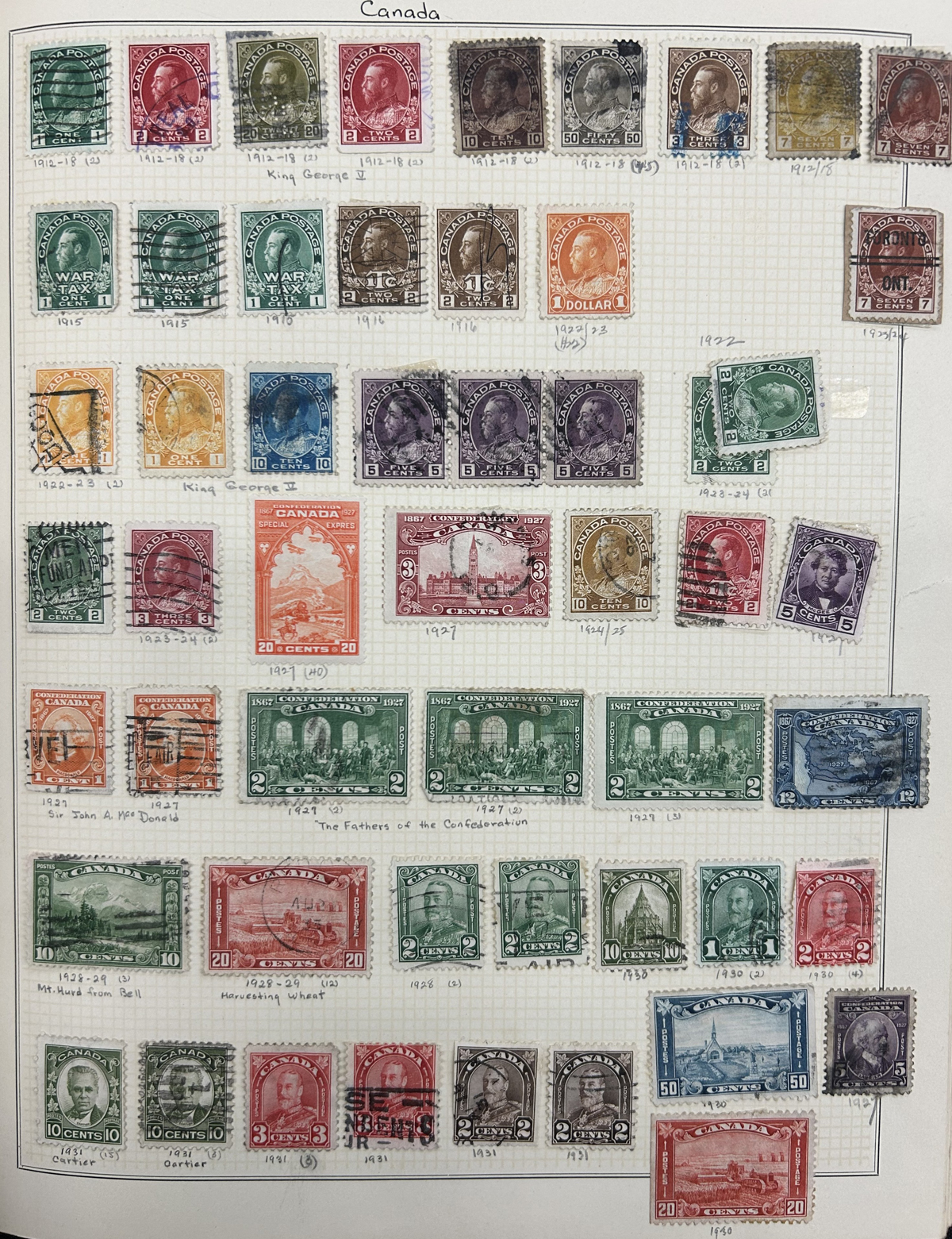 723 O/og   imageGroup of Old Time Worldwide Collections, best is a Progressive Stamp Album (with slipcase) holding a worldwide collection with hundreds of stamps, the value being on Commonwealth countries including many pages of Canada, including several Small Queens (to the 50c, with duplication, postmarks, etc.), Jubilees, and so on up to the late 1930s. Next is a "Queen Postage Stamp Album" (ca. 1930s) also containing hundreds of stamps, with strength in the British Empire, including Canada. Two smaller old albums contain dozens of low value stamps and finally there are a few dozen album pages with Commonwealth countries, with strength in India. One page that stood out contains two bisected 1911 Macau stamps (one catalogued at $50, the other not listed). See pictures to get a flair of this group. (Scan 1) (Scan 2) (Scan 3) (Scan 4) (Scan 5) (Scan 6) (Scan 7) (Scan 8) (Scan 9) (Scan 10) (Scan 11) (Scan 12) (Scan 13) (Scan 14) (Scan 15) (Scan 16) (Scan 17) (Scan 18) (Scan 19) (Scan 20) (Scan 21) (Scan 22) (Scan 23) (Scan 24) (All Scans) (All Images)