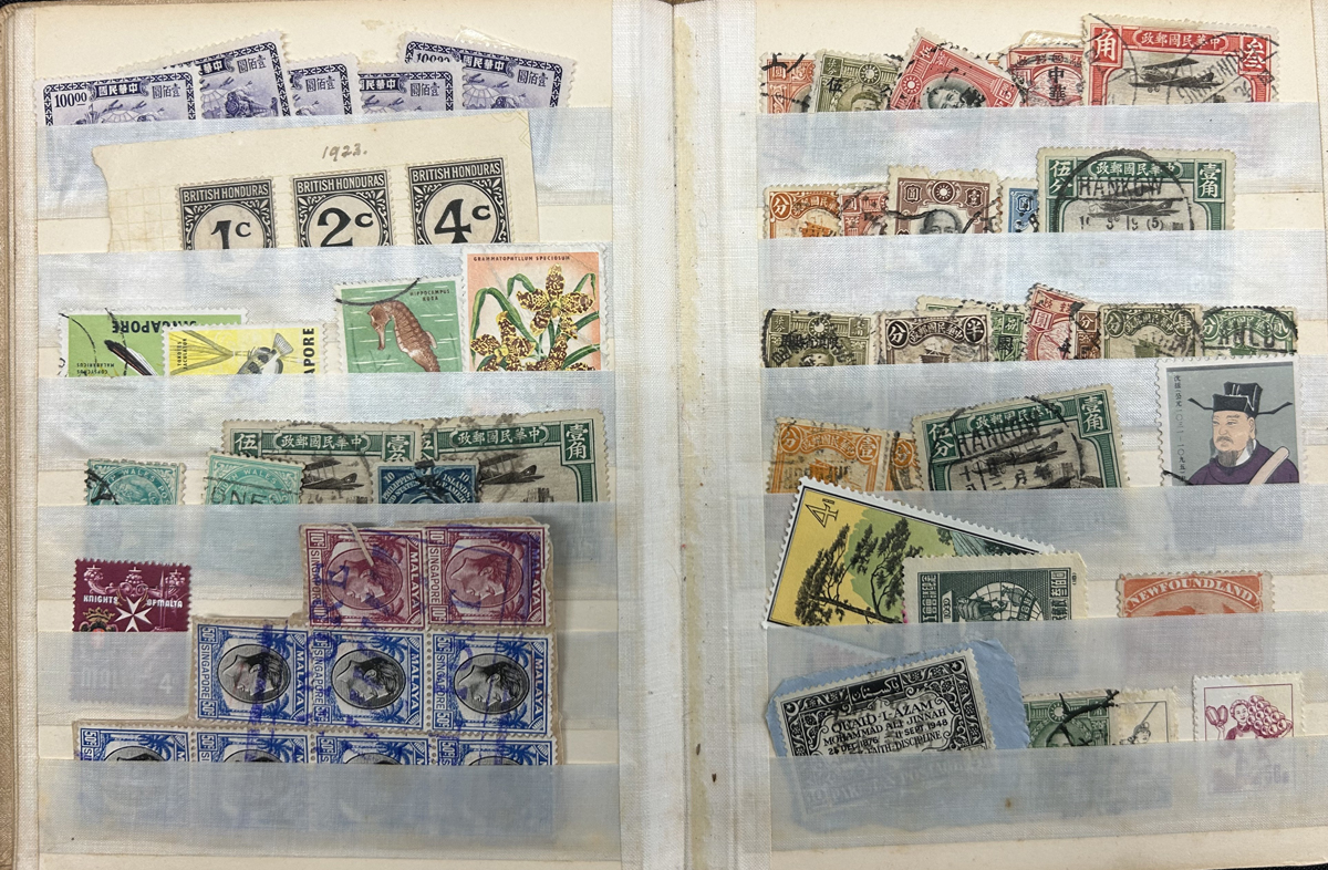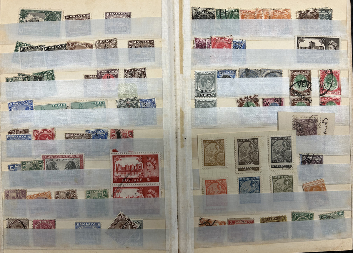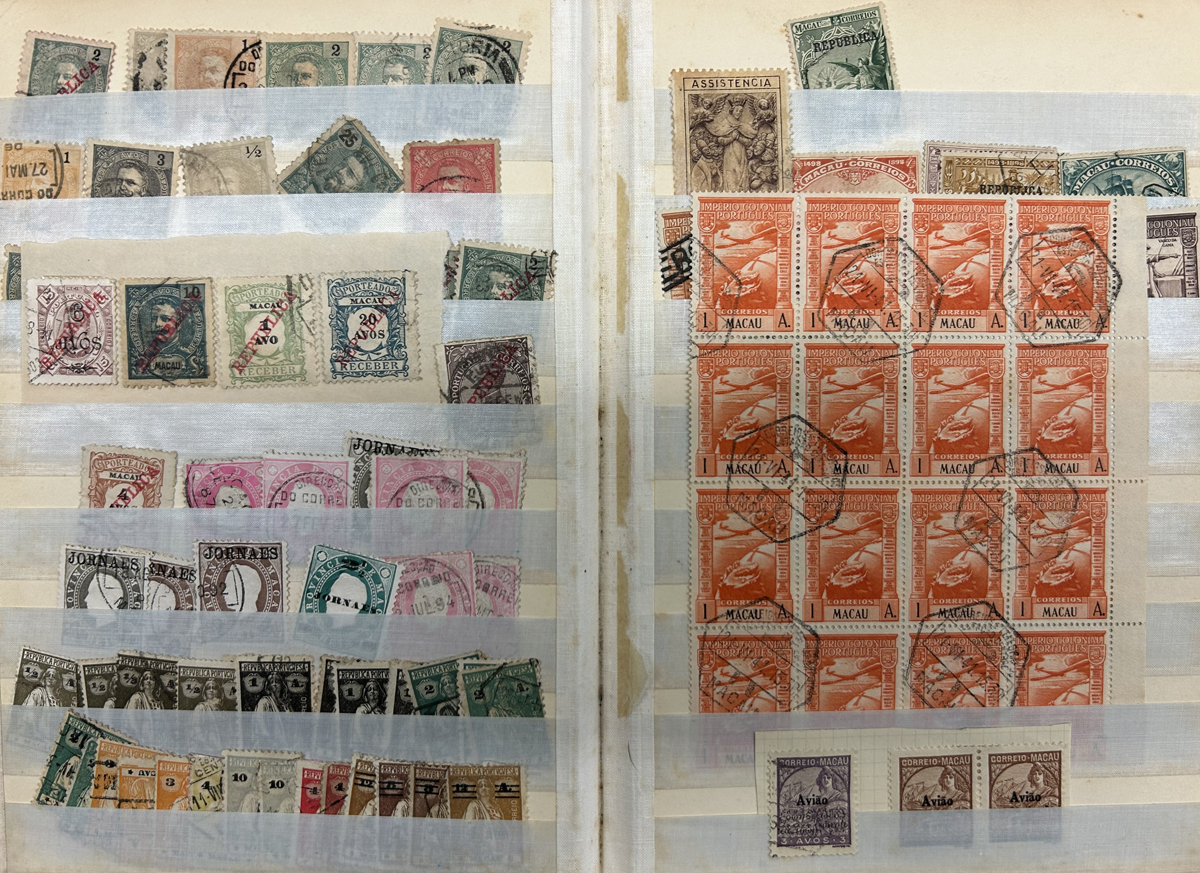 724 O/og/nh   imageGroup of Collector's Unsorted Treasures, to the 1960s, all contained in 10 stockbooks of various sizes. This is a very interesting holding, in which one will find all sorts of better material, including many hidden treasures, mostly pre-1950s. A quick glance revealed many $50 or higher stamps and many high denominations, and we only just skimmed the surface. Most of the material is Commonwealth, but we also noted a few other countries. Countries of note include Australia, Mauritius, USA, Canada, China (incl. PRC), French colonies, Portugal, Macau, India, GB, Transvaal, Philippines and many more. A difficult group to describe, mostly because of its jumbled nature, although some of the material is semi-sorted by country. One of the stockbooks contains mainly NH blocks of four of Germany and GB from the 1960s. Last but not least is a box containing all sorts of loose material, including a few dozen glassines of early China issues (in quantity). A wonderful opportunity for the patient collector, or online reseller, as our low estimate should prove a good buy. Our pictures only show a small portion of the lot. (Scan 1) (Scan 2) (Scan 3) (Scan 4) (Scan 5) (Scan 6) (Scan 7) (Scan 8) (Scan 9) (Scan 10) (Scan 11) (Scan 12) (Scan 13) (Scan 14) (Scan 15) (Scan 16) (Scan 17) (Scan 18) (Scan 19) (Scan 20) (Scan 21) (Scan 22) (Scan 23) (Scan 24) (Scan 25) (All Scans) (All Images)