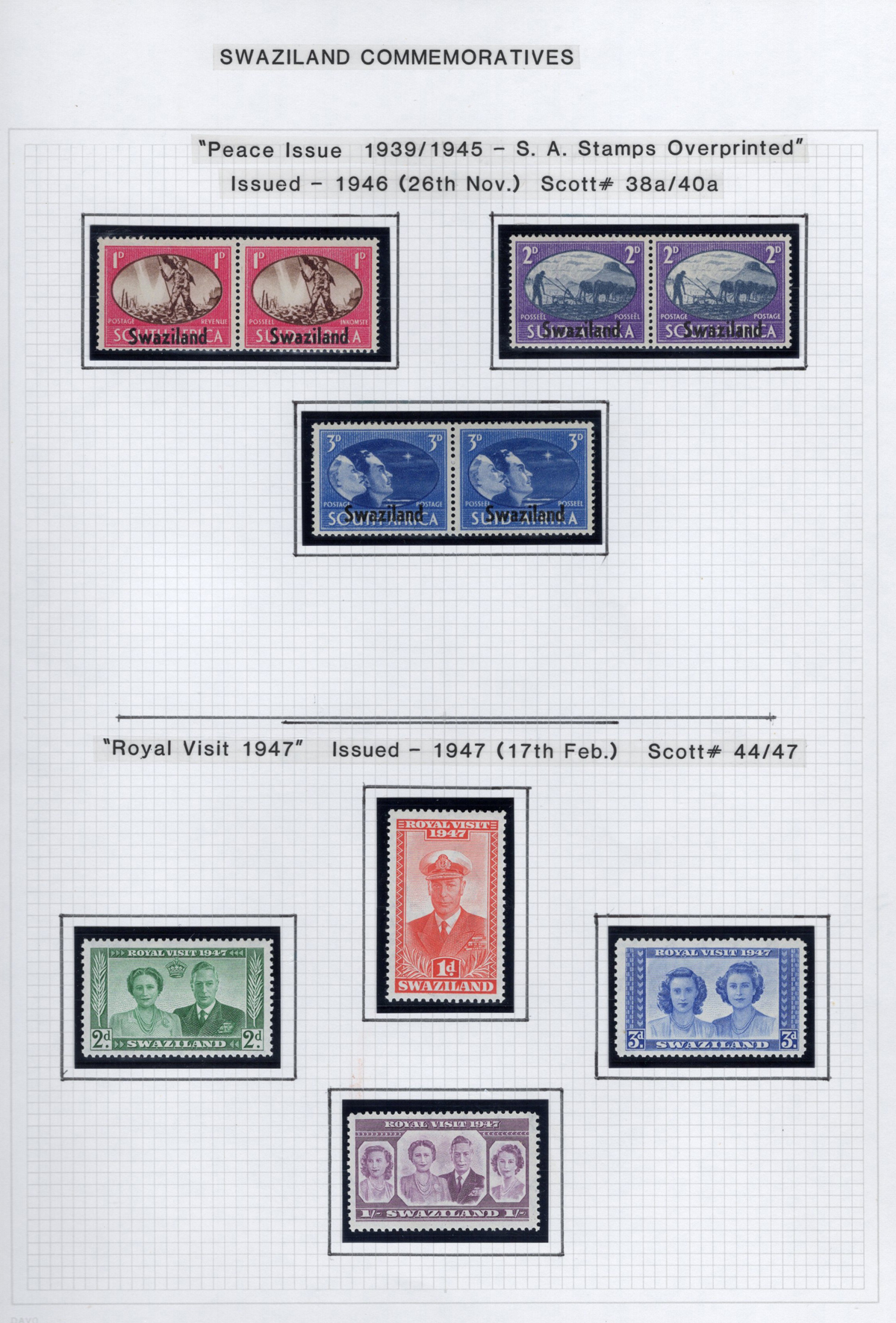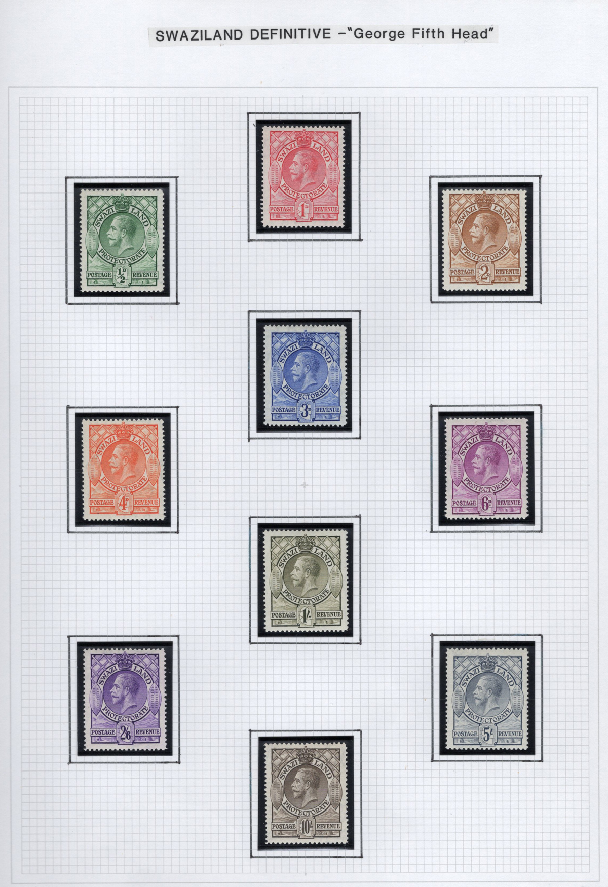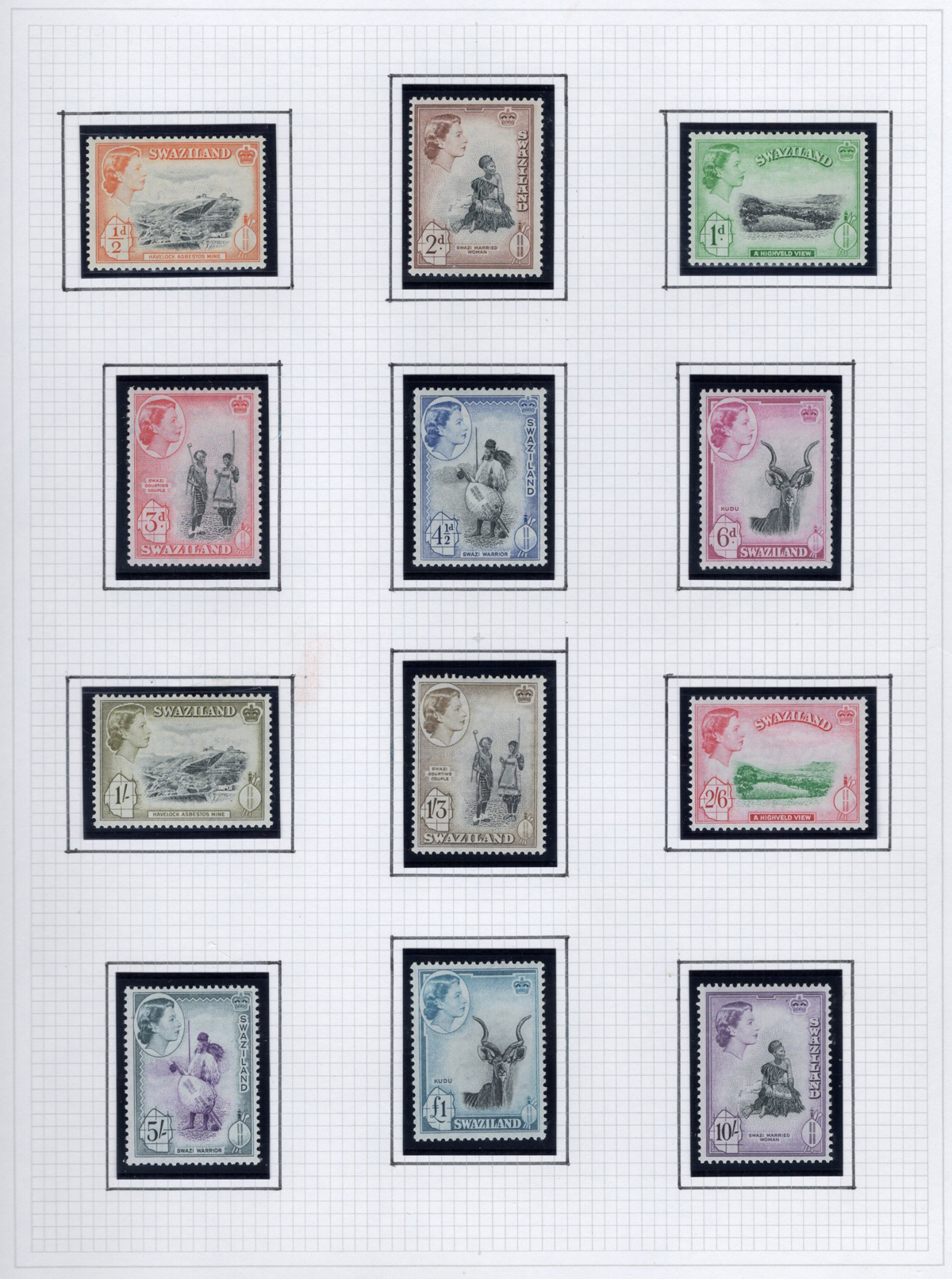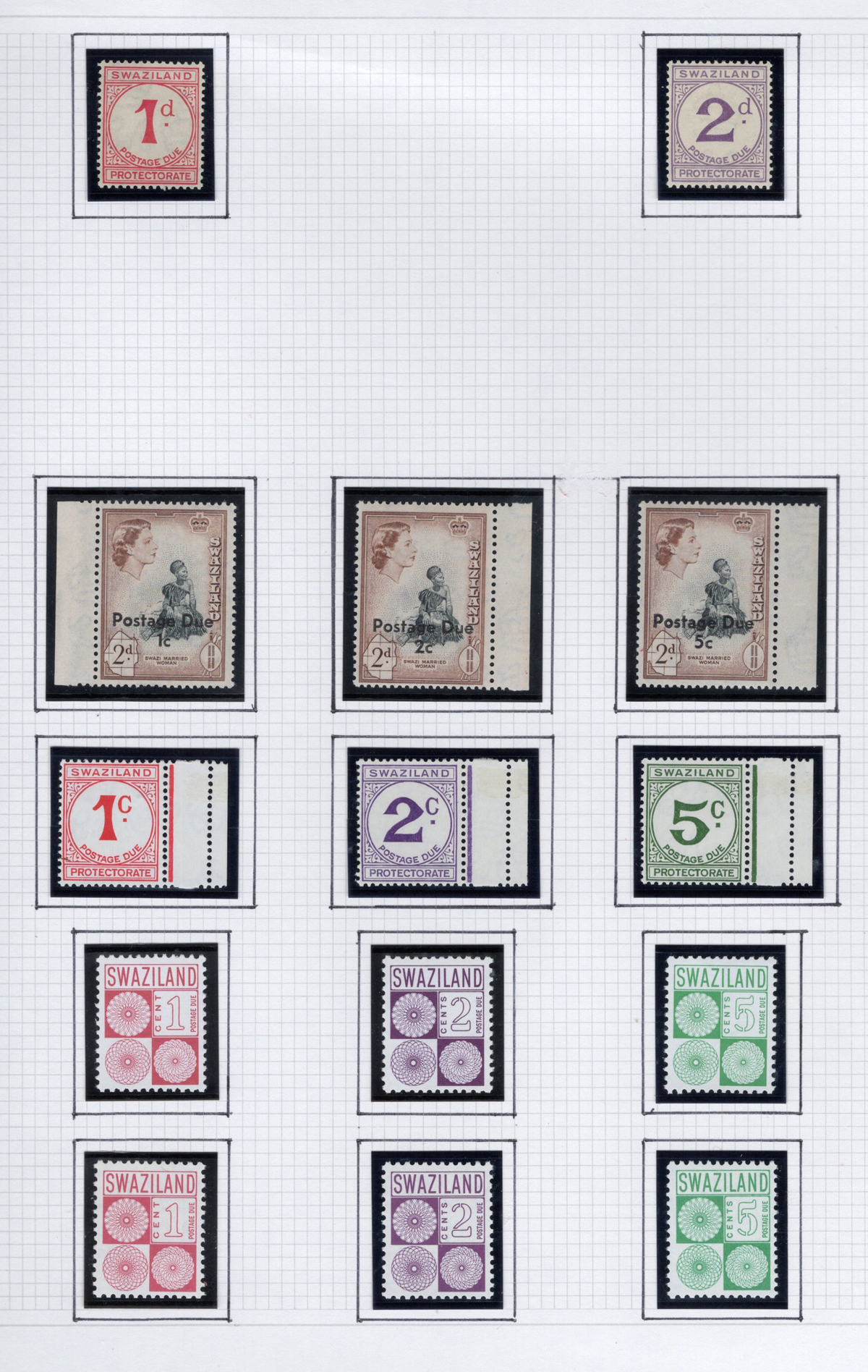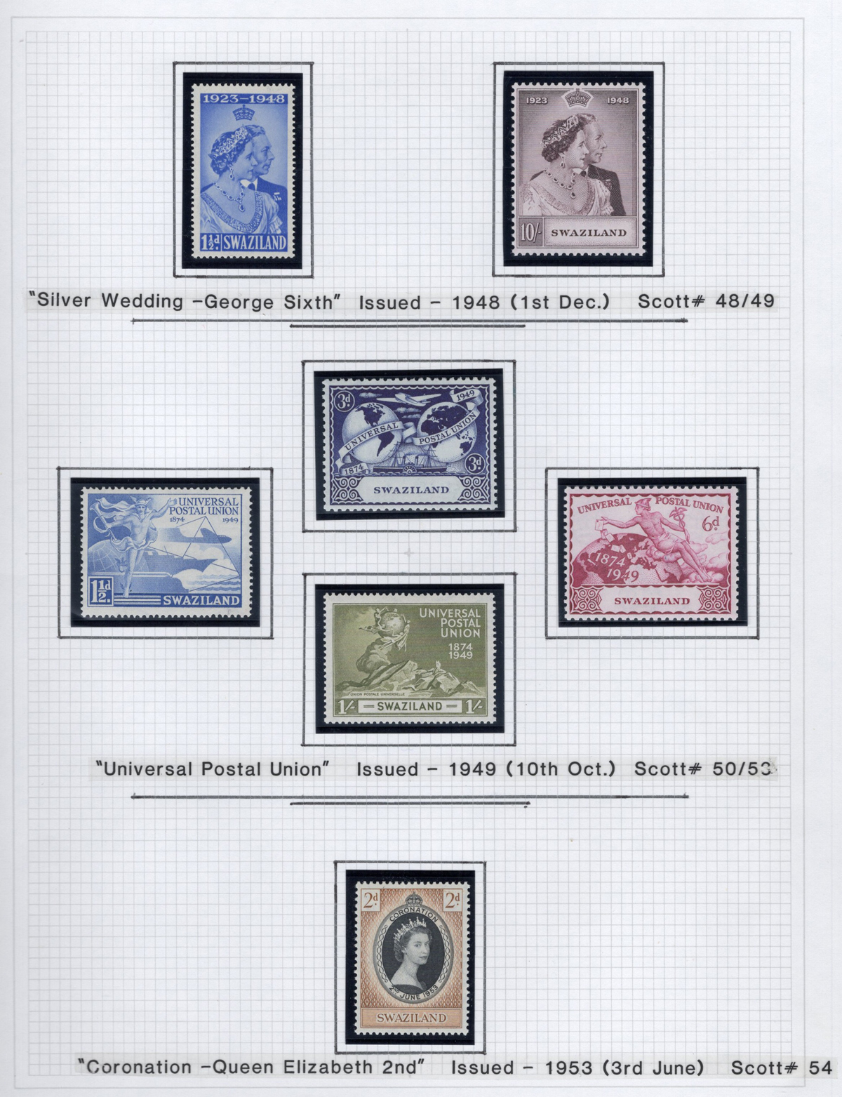 721 og/nh 10/124 imageCollection of Mint Swaziland, 1933-1966, all neatly displayed in black mounts on 16 quadrille pages, We noted Scott #s 10-16, 27-37 (never hinged), 27a-37a, 55-66, 67-79b, 80-91, 92-107, and others, including a page of Postage Due sets. One of the 1966 surcharged issues (50c on 5sh) is identified by the owner as the rare Type III but we have counted it as a Type I, as a certificate would be required. A fresh and lightly hinged collection (except the noted NH set), very fine. Accompanied by a detailed map of Africa showing Swaziland’s location. (Scan 1) (Scan 2) (Scan 3) (Scan 4) (Scan 5) (Scan 6) (Scan 7) (Scan 8) (Scan 9) (Scan 10) (Scan 11) (Scan 12) (Scan 13) (Scan 14) (Scan 15) (All Scans) (All Images)