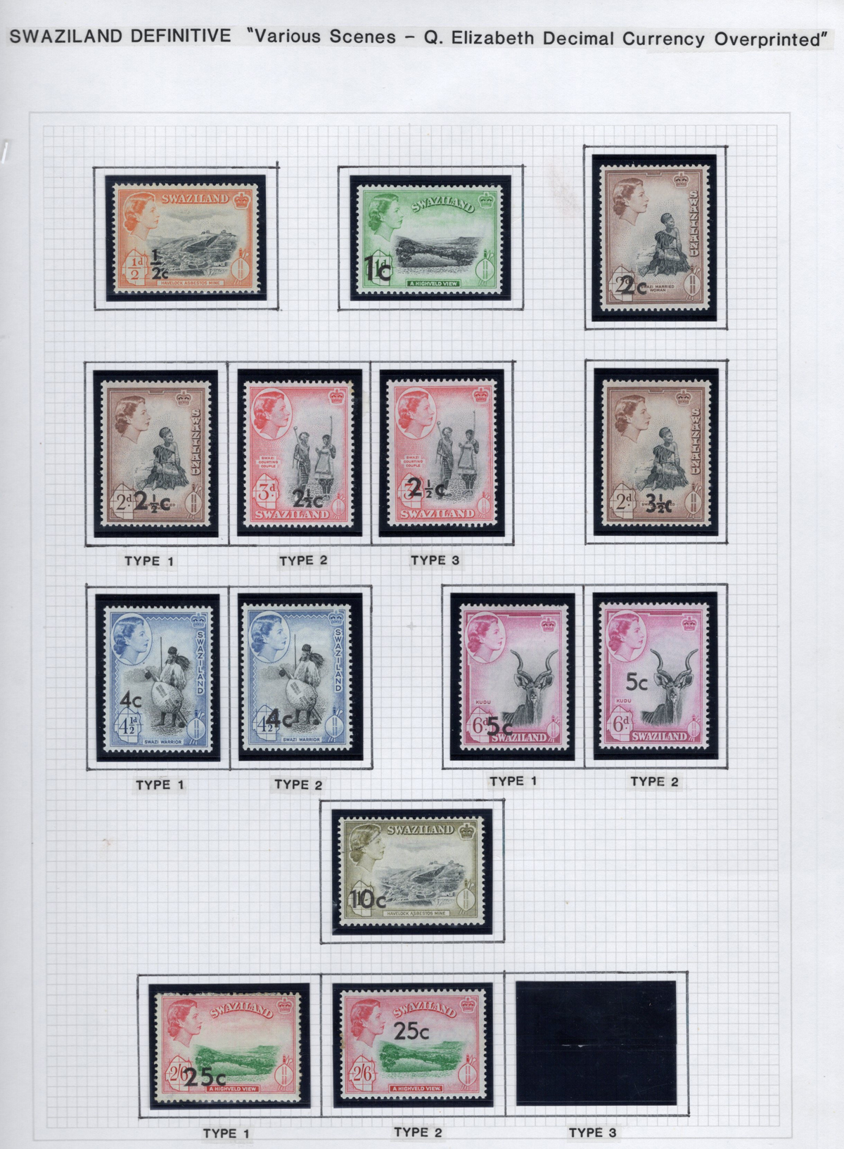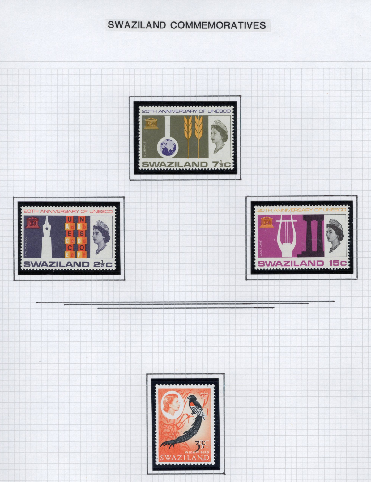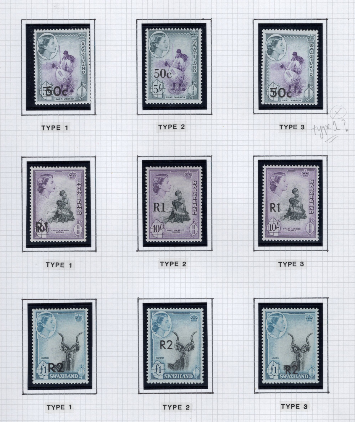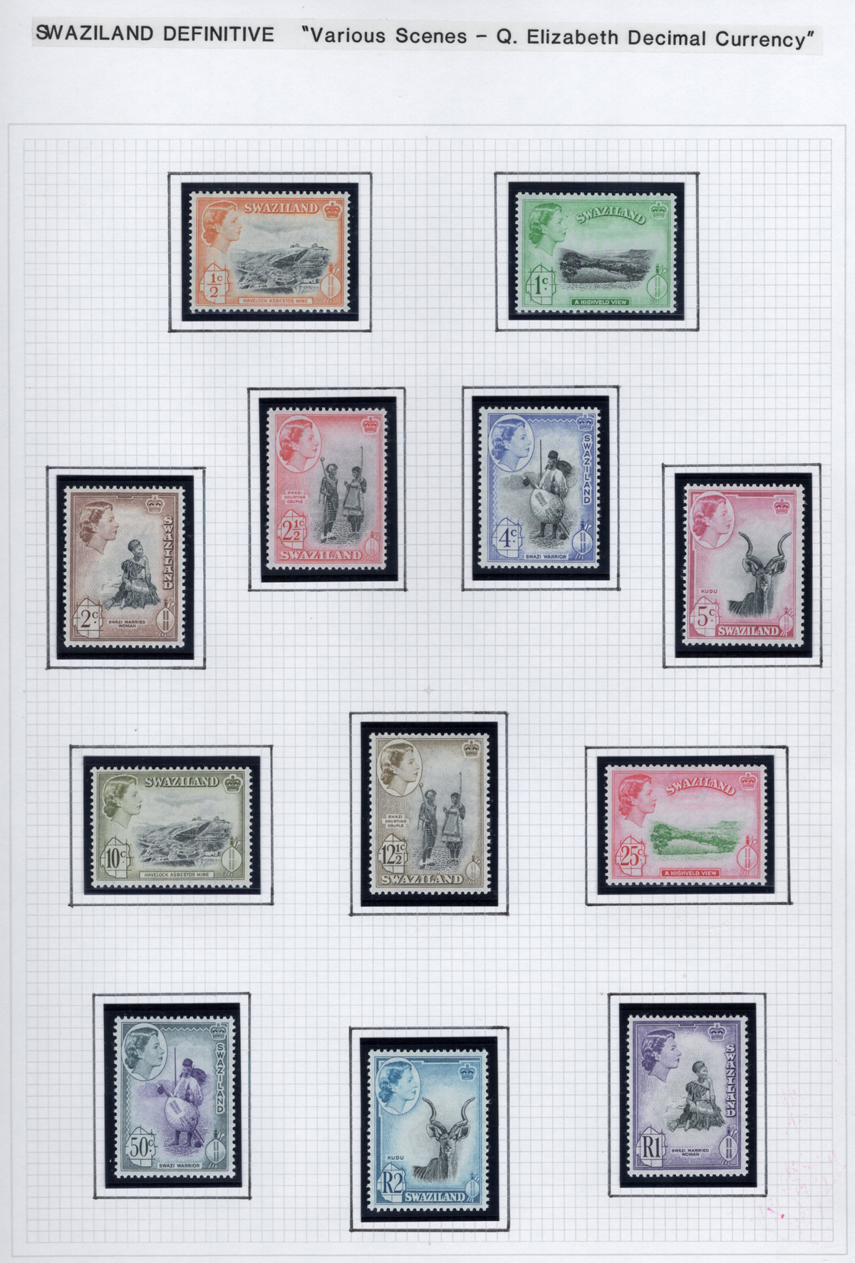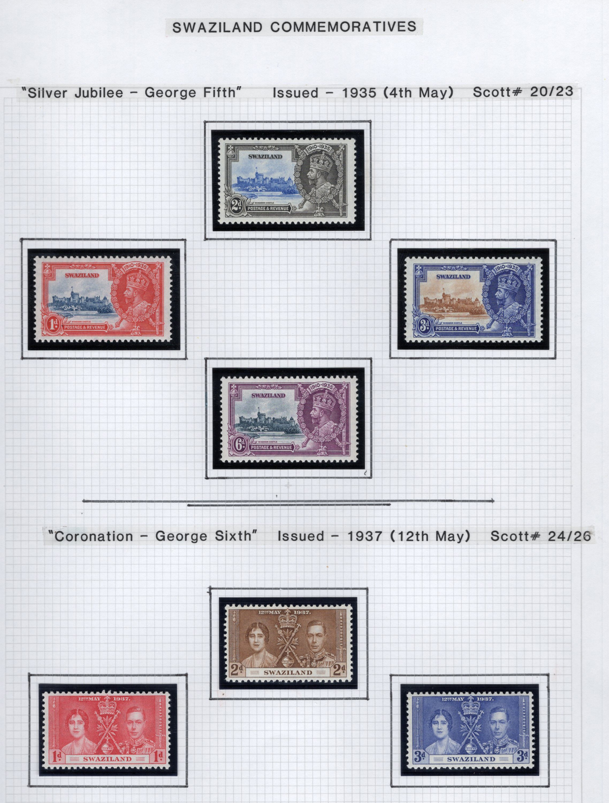 721 og/nh 10/124 imageCollection of Mint Swaziland, 1933-1966, all neatly displayed in black mounts on 16 quadrille pages, We noted Scott #s 10-16, 27-37 (never hinged), 27a-37a, 55-66, 67-79b, 80-91, 92-107, and others, including a page of Postage Due sets. One of the 1966 surcharged issues (50c on 5sh) is identified by the owner as the rare Type III but we have counted it as a Type I, as a certificate would be required. A fresh and lightly hinged collection (except the noted NH set), very fine. Accompanied by a detailed map of Africa showing Swaziland’s location. (Scan 1) (Scan 2) (Scan 3) (Scan 4) (Scan 5) (Scan 6) (Scan 7) (Scan 8) (Scan 9) (Scan 10) (Scan 11) (Scan 12) (Scan 13) (Scan 14) (Scan 15) (All Scans) (All Images)
