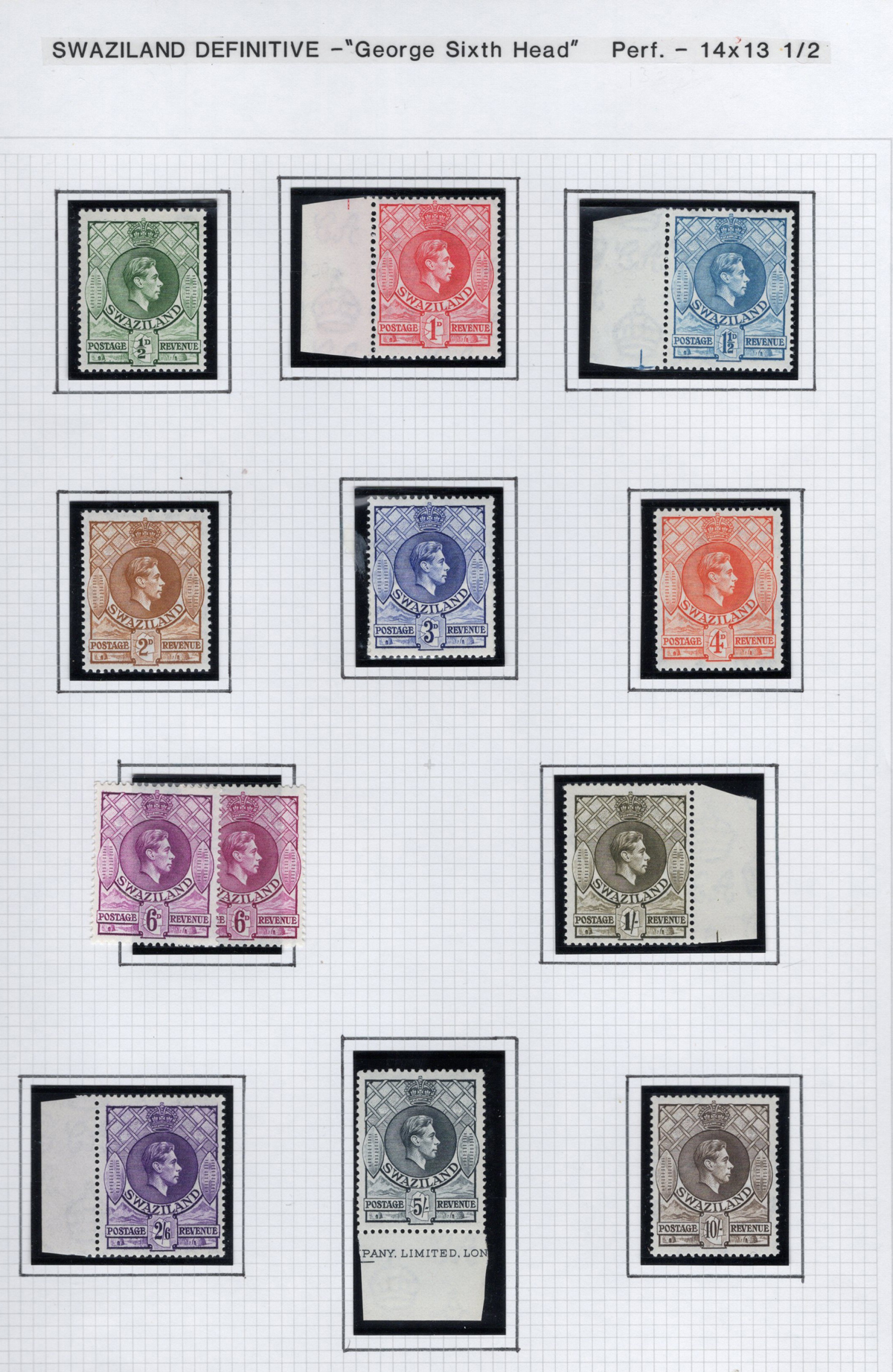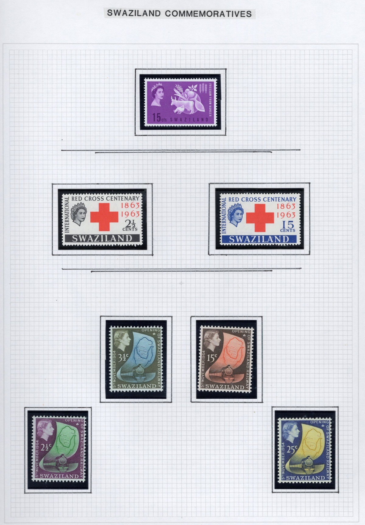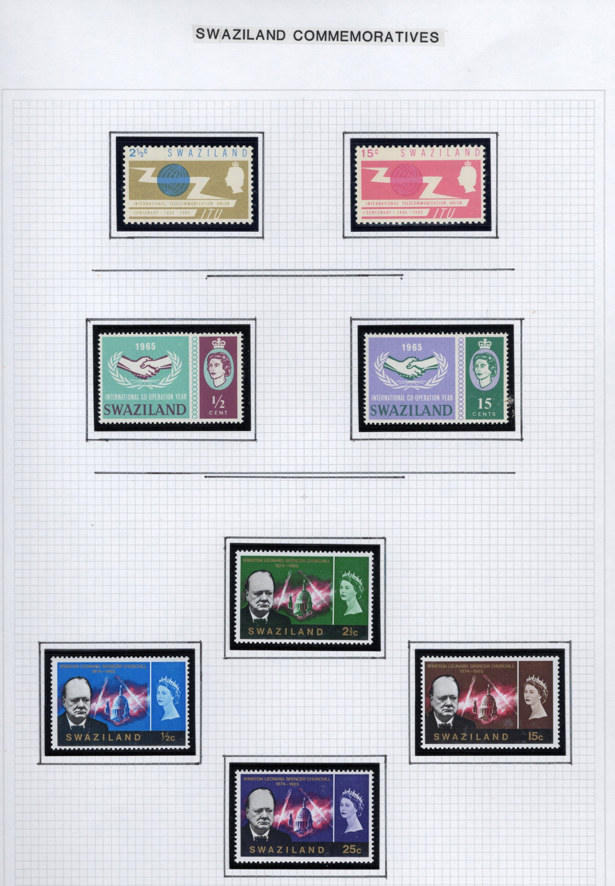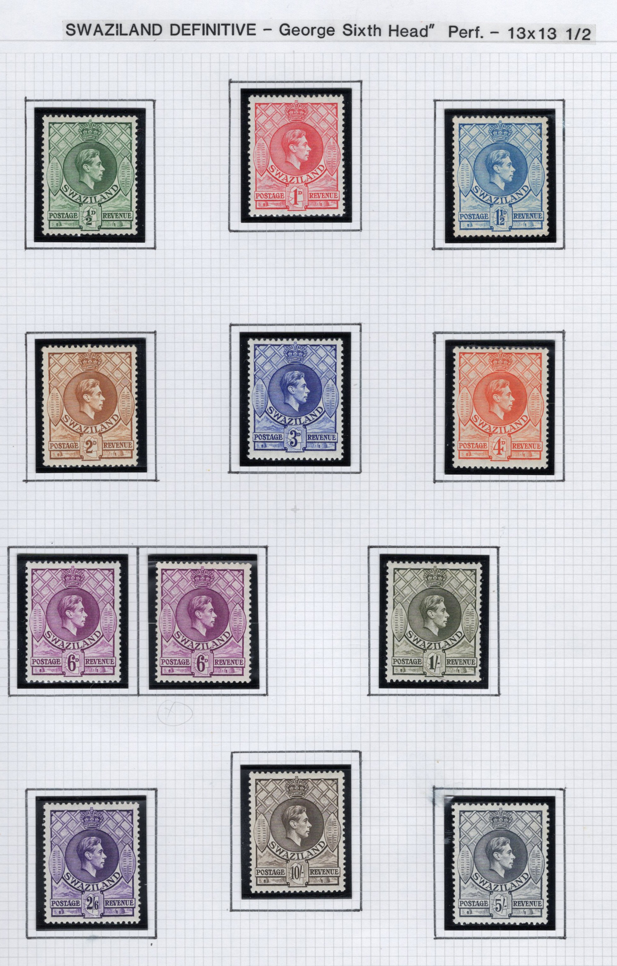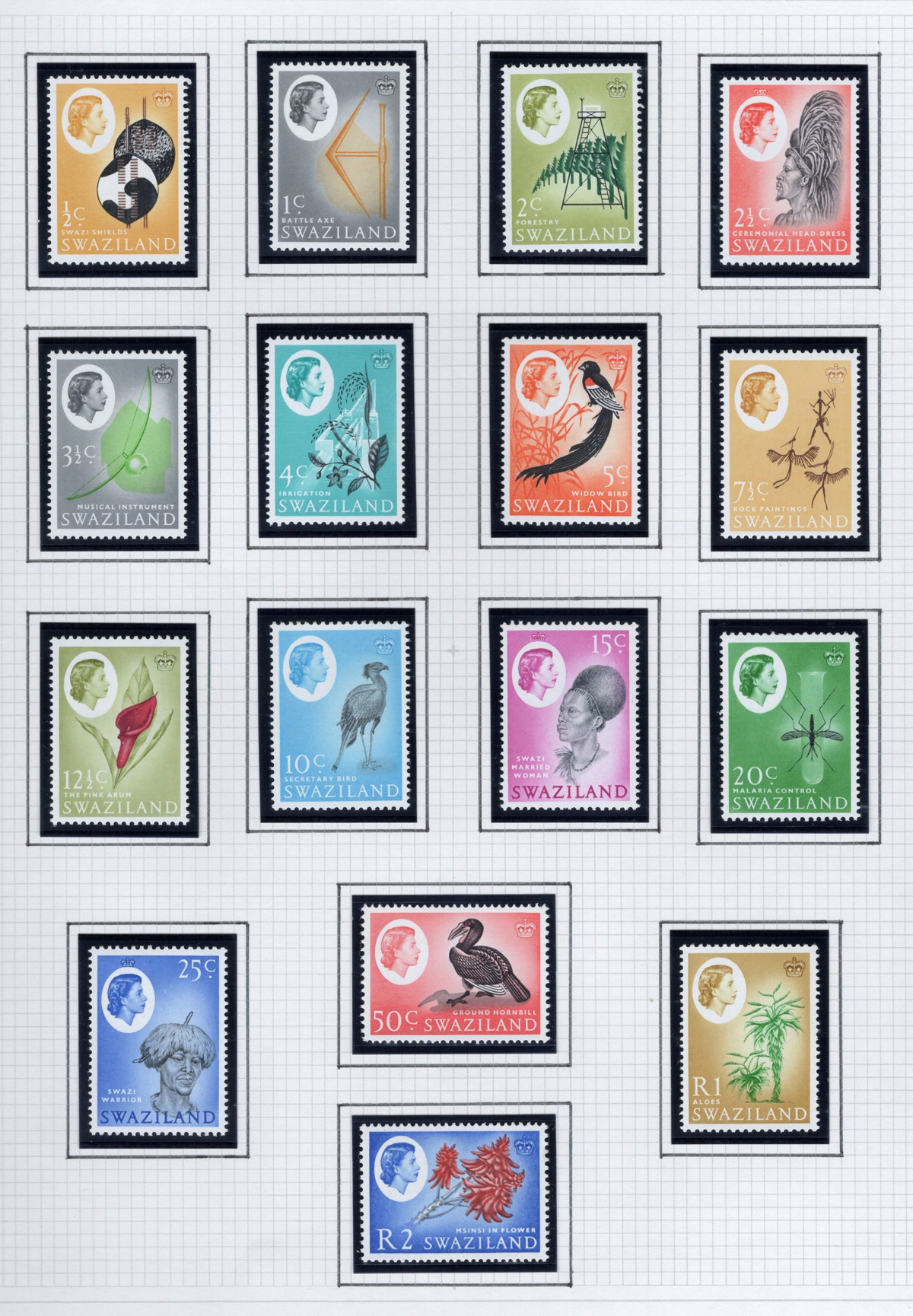 721 og/nh 10/124 imageCollection of Mint Swaziland, 1933-1966, all neatly displayed in black mounts on 16 quadrille pages, We noted Scott #s 10-16, 27-37 (never hinged), 27a-37a, 55-66, 67-79b, 80-91, 92-107, and others, including a page of Postage Due sets. One of the 1966 surcharged issues (50c on 5sh) is identified by the owner as the rare Type III but we have counted it as a Type I, as a certificate would be required. A fresh and lightly hinged collection (except the noted NH set), very fine. Accompanied by a detailed map of Africa showing Swaziland’s location. (Scan 1) (Scan 2) (Scan 3) (Scan 4) (Scan 5) (Scan 6) (Scan 7) (Scan 8) (Scan 9) (Scan 10) (Scan 11) (Scan 12) (Scan 13) (Scan 14) (Scan 15) (All Scans) (All Images)