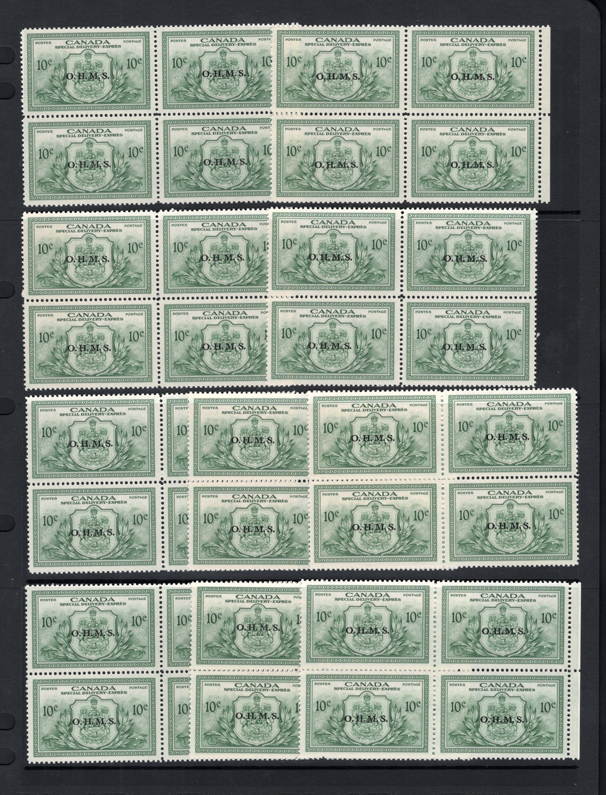 73 nh EO1 image1950 10c Green Special Delivery Official, with O.H.M.S. Overprint, a group of 10 mint never hinged blocks of four, very fine.