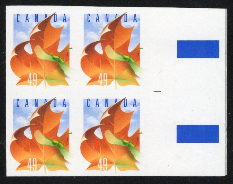 64 nh 2053a image2004 49c Maple Leaf Self-Adhesive with Die Cutting Omitted, a mint never hinged block of four with a sheet margin at right, very fine and scarce.