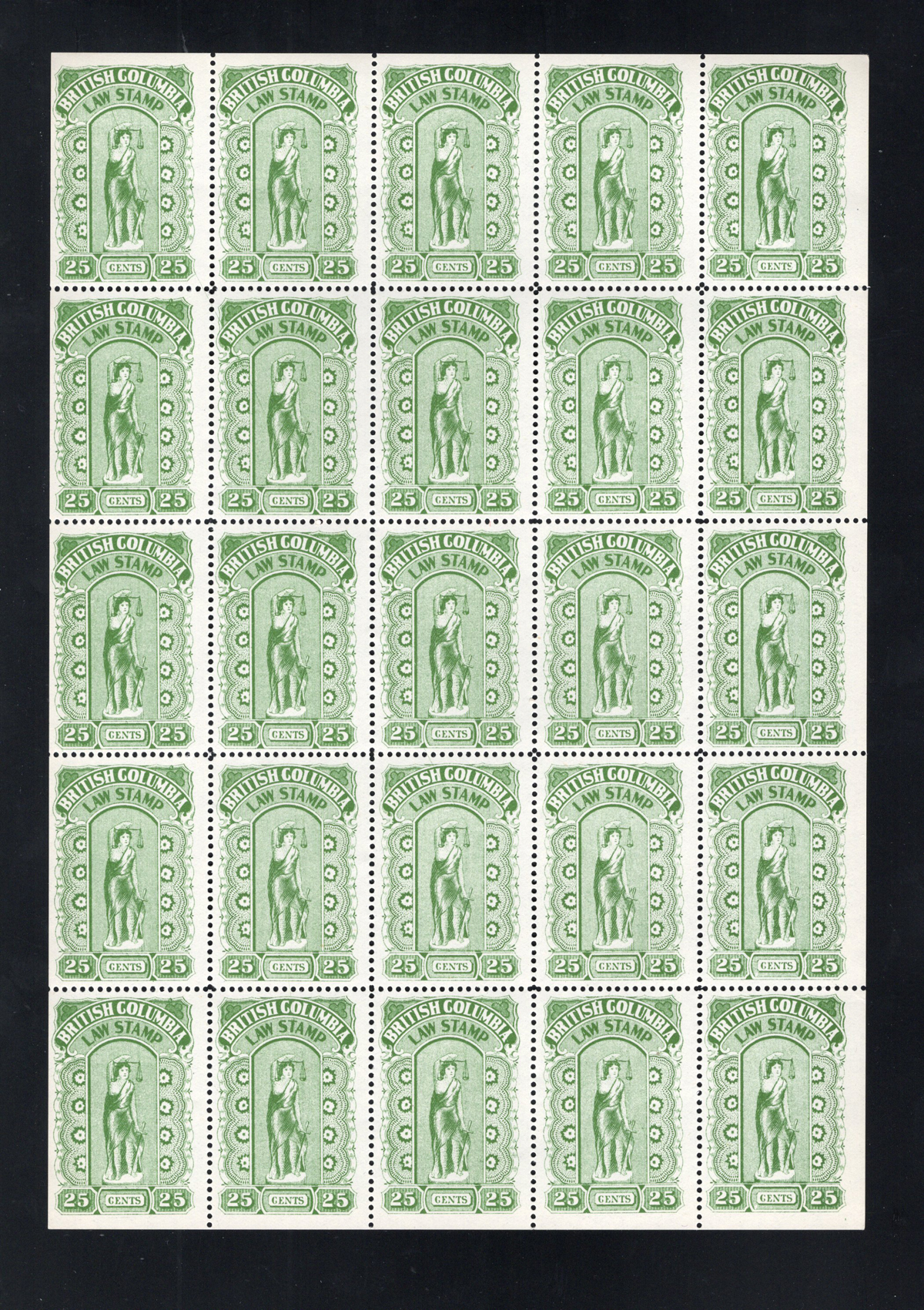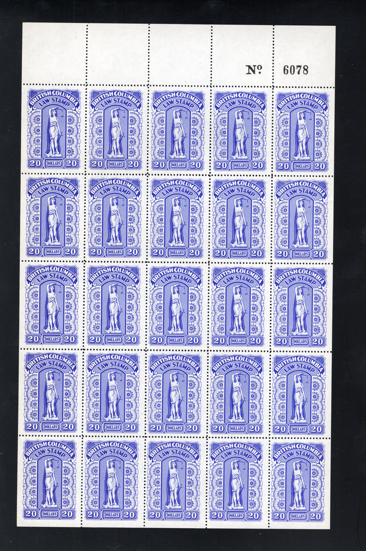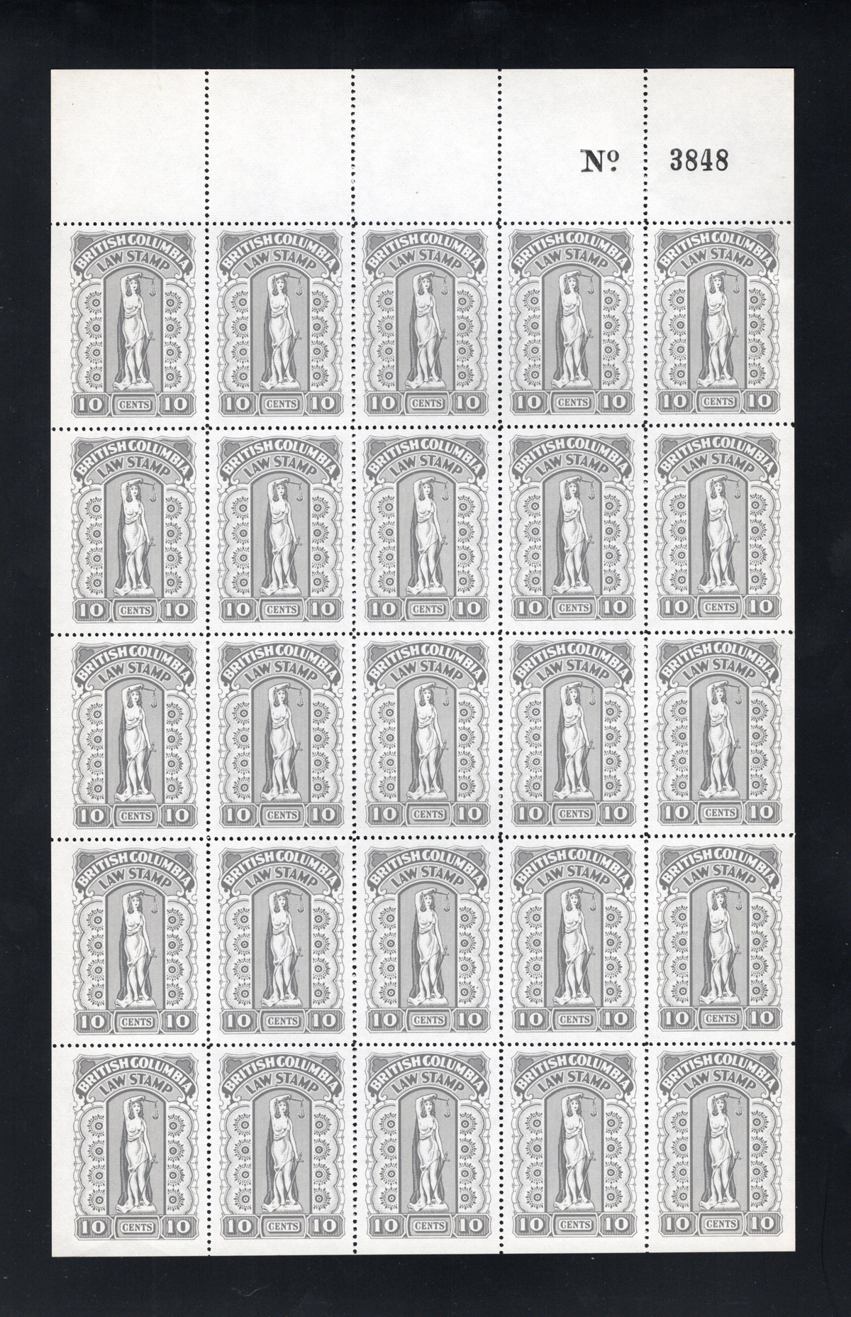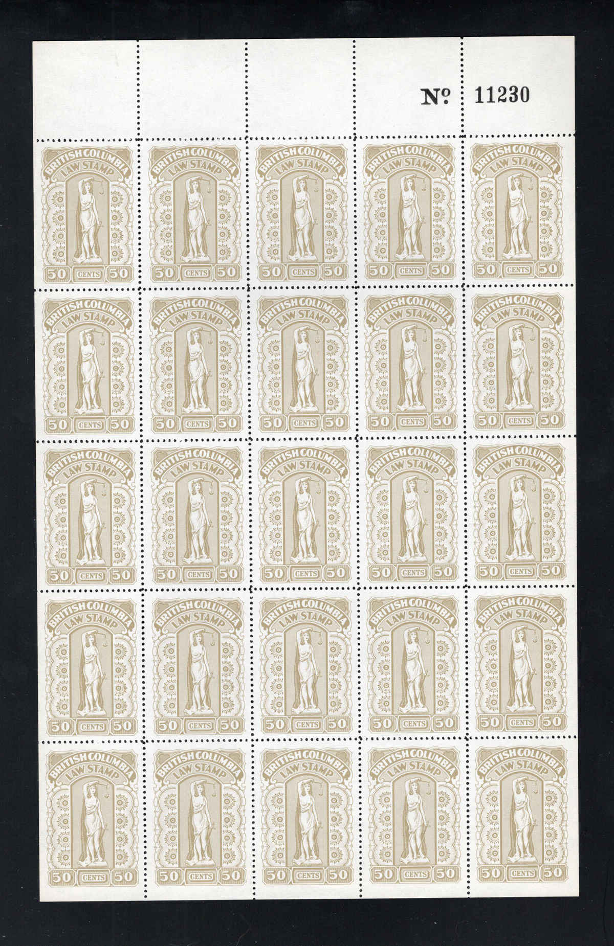 80 nh BCL23/63 imageGroup of 9 Different British Columbia Law Stamp Sheets, with BCL #s 23 (with three van Dam-listed plate scratches BCL23d), 38, 51, 52, 55, 57 (position 16 has the "flaw above C of COLUMBIA" variety BCL57a), 58 (position 3 has the "horizontal bar joining 2 and 0 at right" variety, BCL58a), 60 and 63 (cataloguing $6,250 by itself), each in a mint never hinged sheet of 25, all but two with plate number in top selvedge. A very fine group. (Scan 1) (Scan 2) (Scan 3) (Scan 4) (Scan 5) (Scan 6) (Scan 7) (Scan 8) (Scan 9) (All Scans) (All Images)