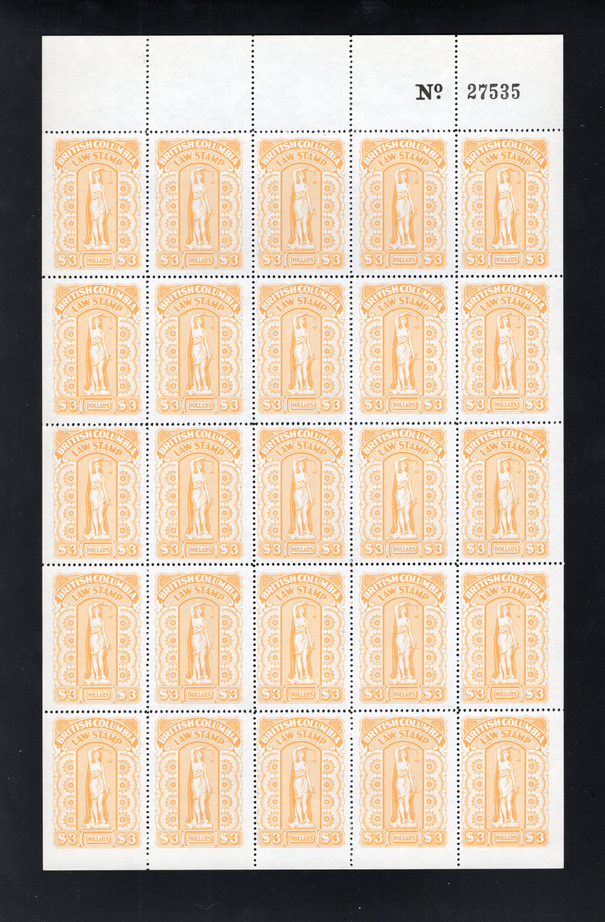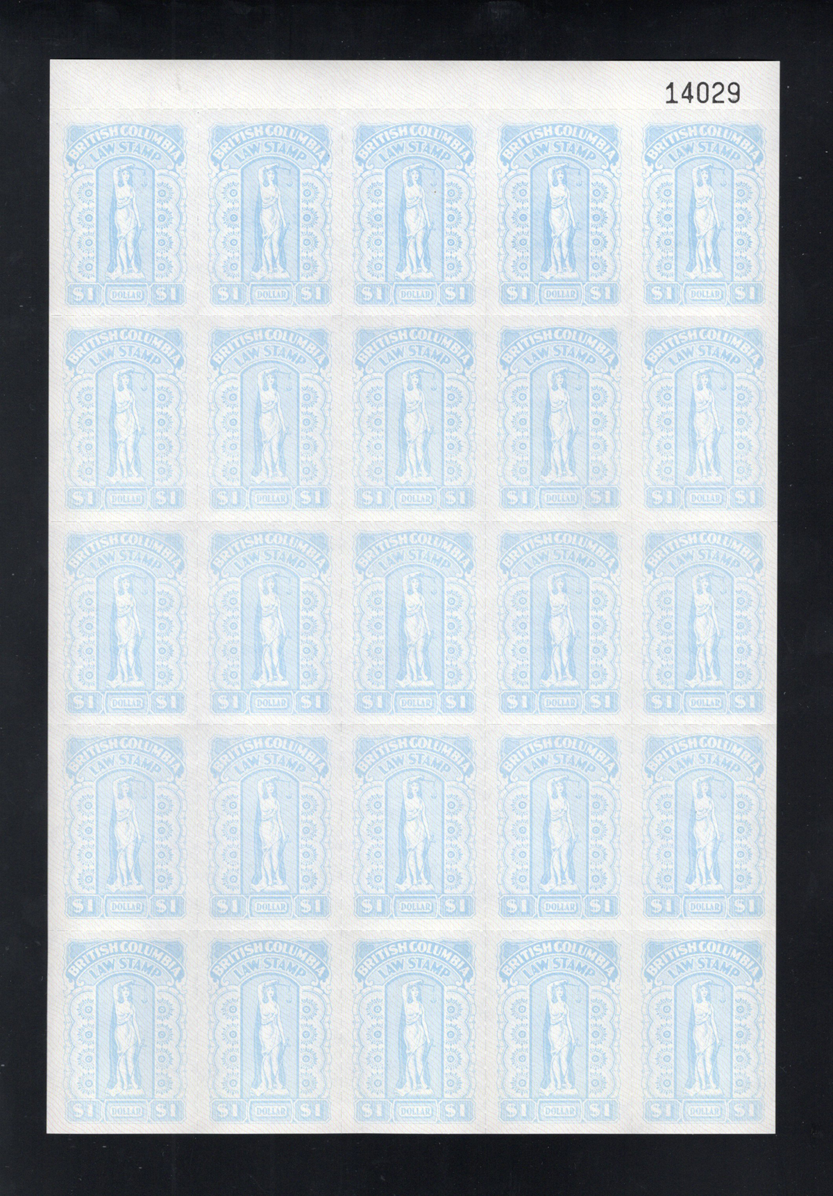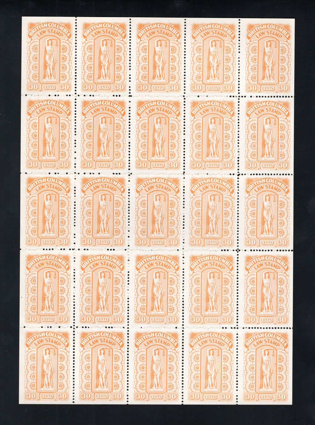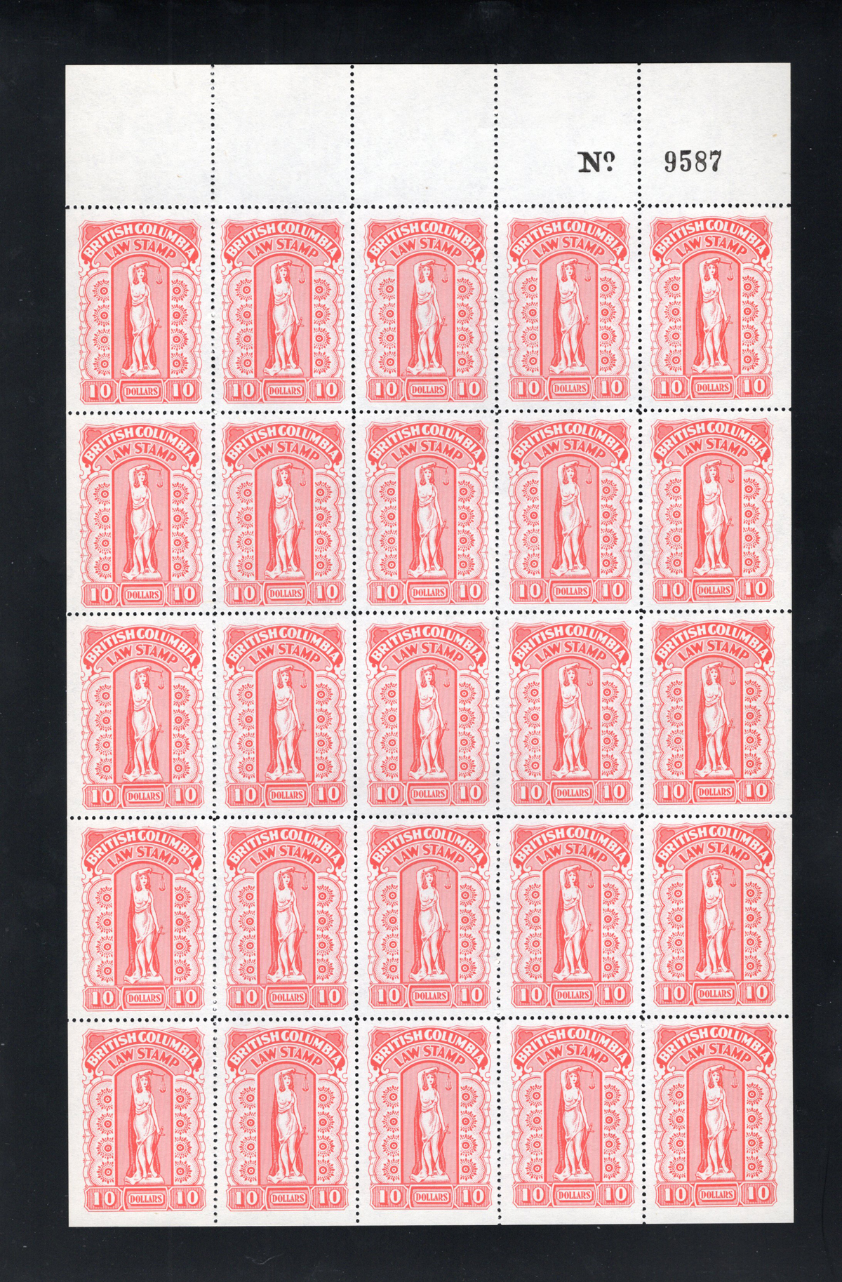80 nh BCL23/63 imageGroup of 9 Different British Columbia Law Stamp Sheets, with BCL #s 23 (with three van Dam-listed plate scratches BCL23d), 38, 51, 52, 55, 57 (position 16 has the "flaw above C of COLUMBIA" variety BCL57a), 58 (position 3 has the "horizontal bar joining 2 and 0 at right" variety, BCL58a), 60 and 63 (cataloguing $6,250 by itself), each in a mint never hinged sheet of 25, all but two with plate number in top selvedge. A very fine group. (Scan 1) (Scan 2) (Scan 3) (Scan 4) (Scan 5) (Scan 6) (Scan 7) (Scan 8) (Scan 9) (All Scans) (All Images)