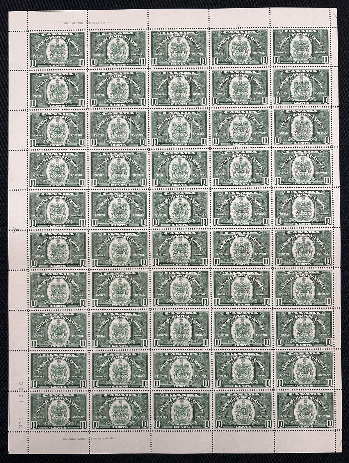69 nh E7 image1939 10c Dark Green Special Delivery, a complete mint never hinged sheet of 50, with plate 1 inscription at lower left. Folded once horizontally, with light yellowing of the gum in places, else fresh and very fine.