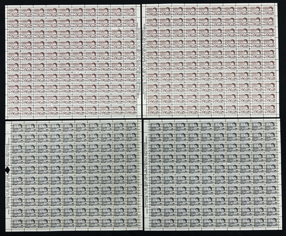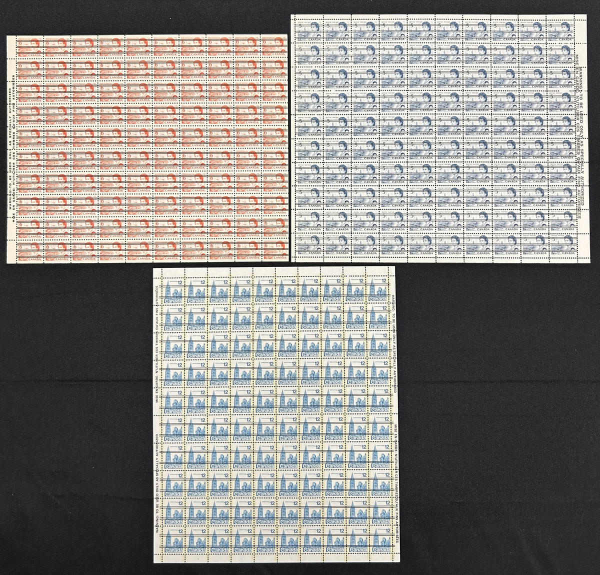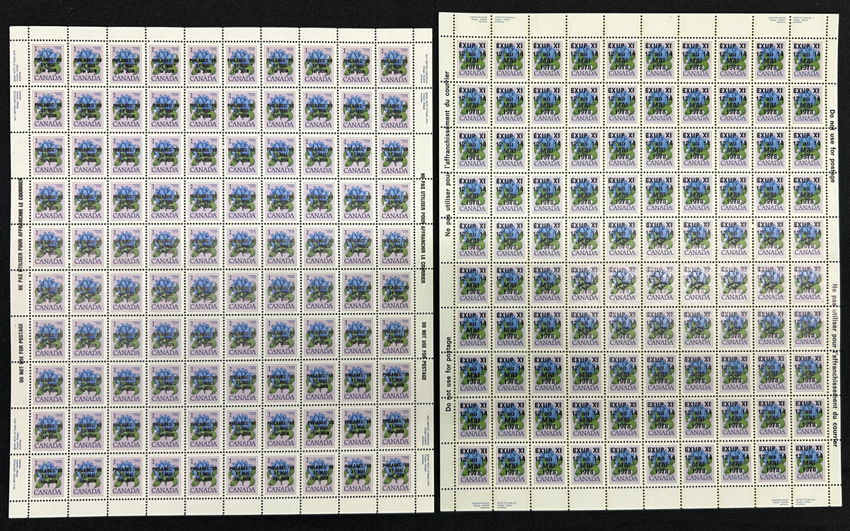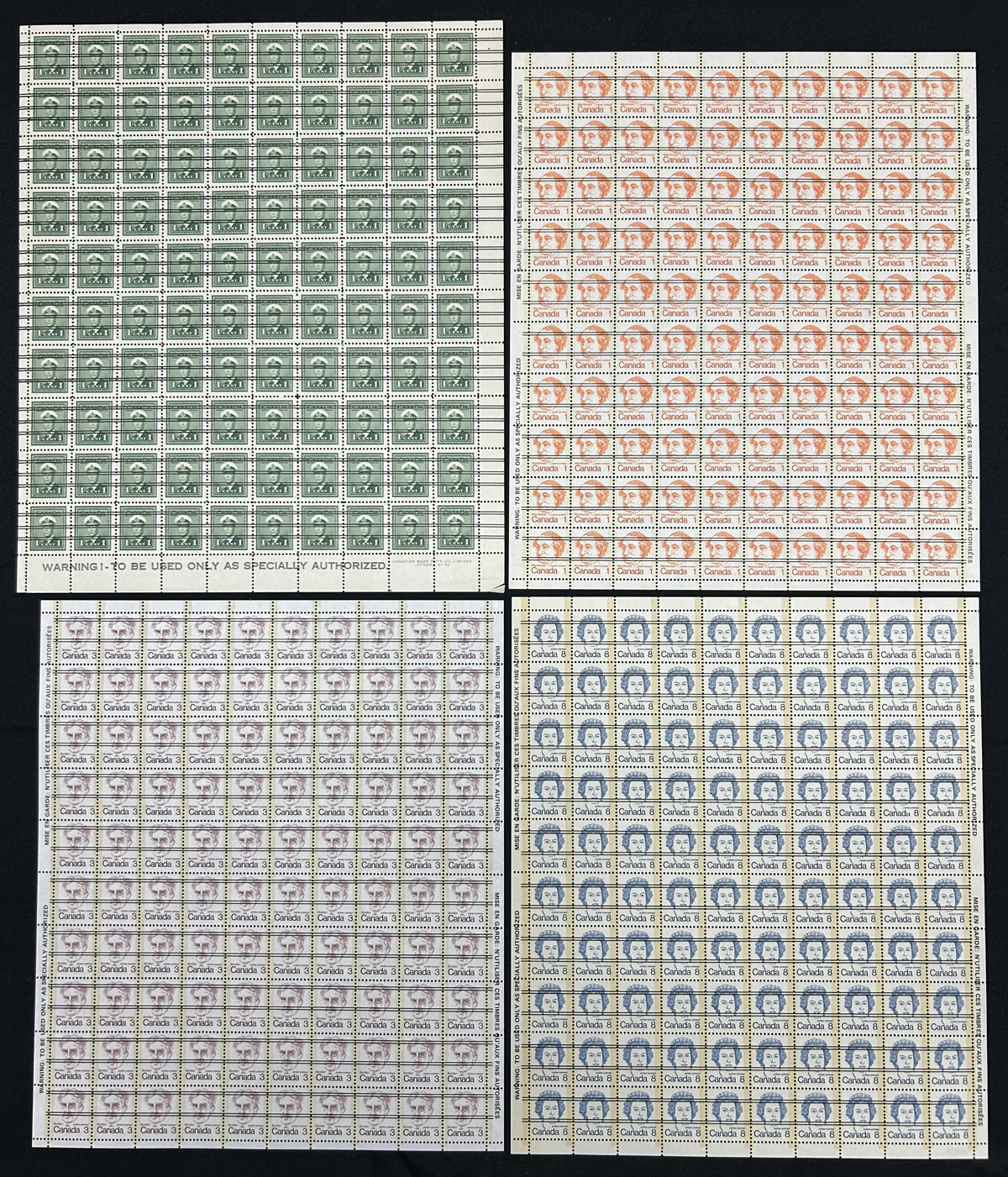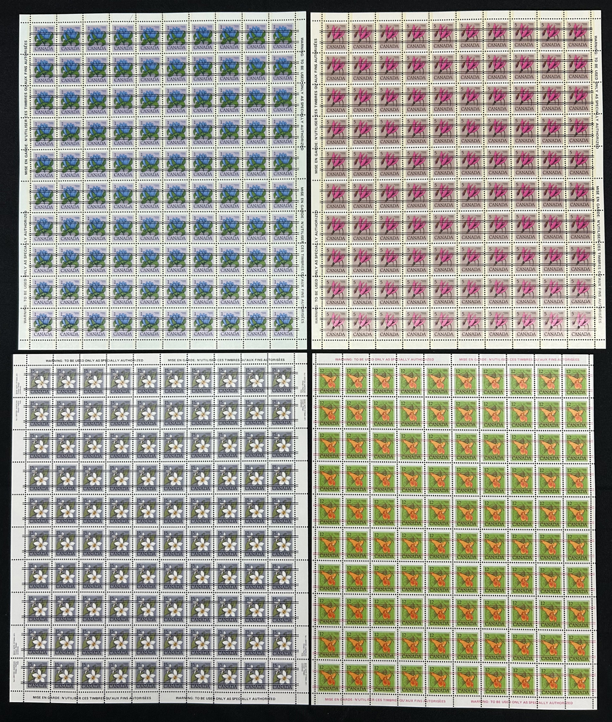 65 nh   imageCollection of 17 Mostly Different Precancelled Complete Sheets, includes 1c green War, 1c brown Centennial (x2), 5c blue Centennial, 6c black Centennial (x2), 6c orange Centennial, 1c orange Macdonald, 3c purple Borden, 8c blue QEII, 5c, 12c and 15c Flowers, 12c blue Parliament, as well as one sheet each of Exup XI and Philabec 80. All have a warning message in the margin. All mint never hinged and fresh, overall very fine. (Scan 1) (Scan 2) (Scan 3) (Scan 4) (Scan 5) (All Scans) (All Images)