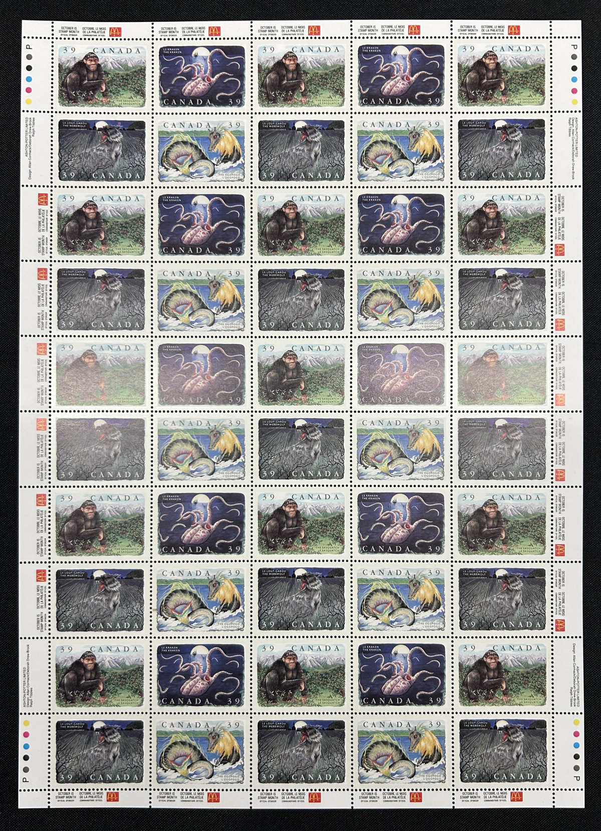 62 nh 1292d image1991 39c Legendary Creatures, Perforated 12.5 x 12, a mint never hinged complete sheet of 50, with plate blocks in each corner, as well as McDonald's advertising in selvedge. Quite fresh and not previously folded, very fine and scarce.