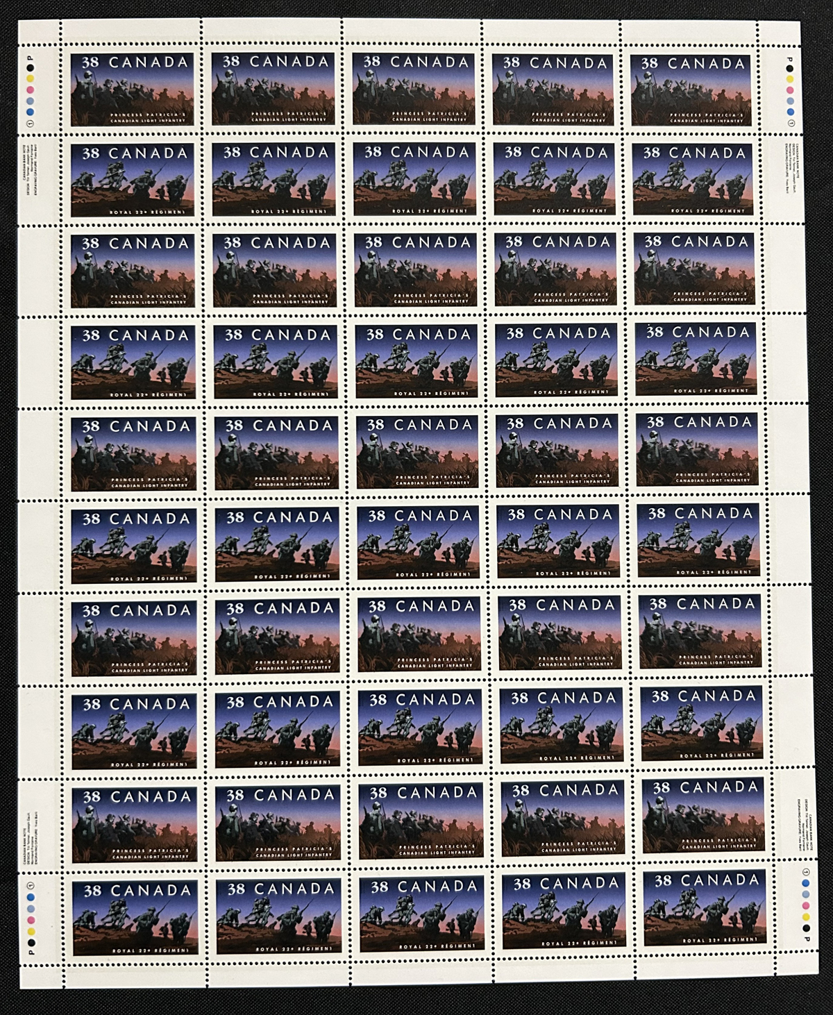 61 nh 1250ii image1989 38c Canadian Infantry Regiments, a complete mint never hinged sheet of 50, with plate inscriptions in all four corners, fresh and never previously folded, very fine. Unitrade notes that "fewer than 50 full panes exist with imprints".