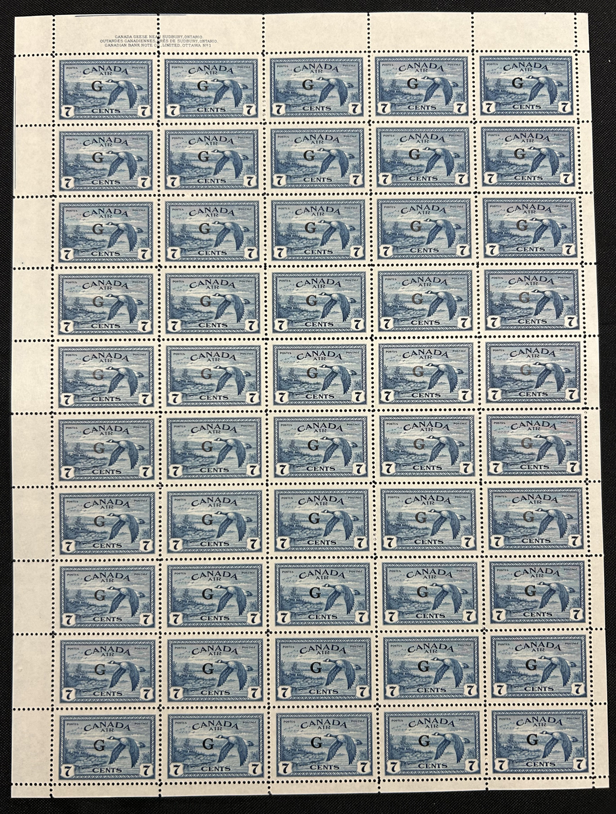 72 nh CO2 image1950 7c Blue Canada Goose Official, Overprinted G, a complete mint never hinged sheet of 50, with plate 1 inscription at upper left, fresh with no evidence of having been previously folded, very fine.