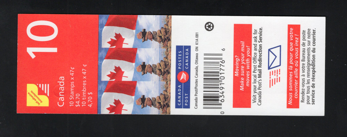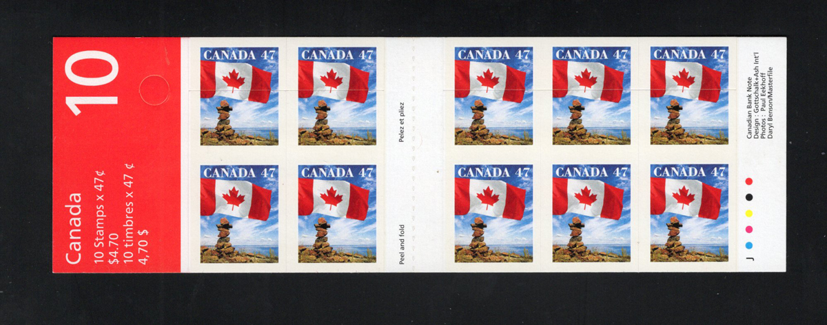 66 nh BK236A var image2001 47c Flag Over Inukshuk Booklet with Die Cutting Error, a complete booklet of 10 with the horizontal die cut shifted drastically up by 12mm, very fine and scarce. (Scan 1) (Scan 2) (All Scans) (All Images)