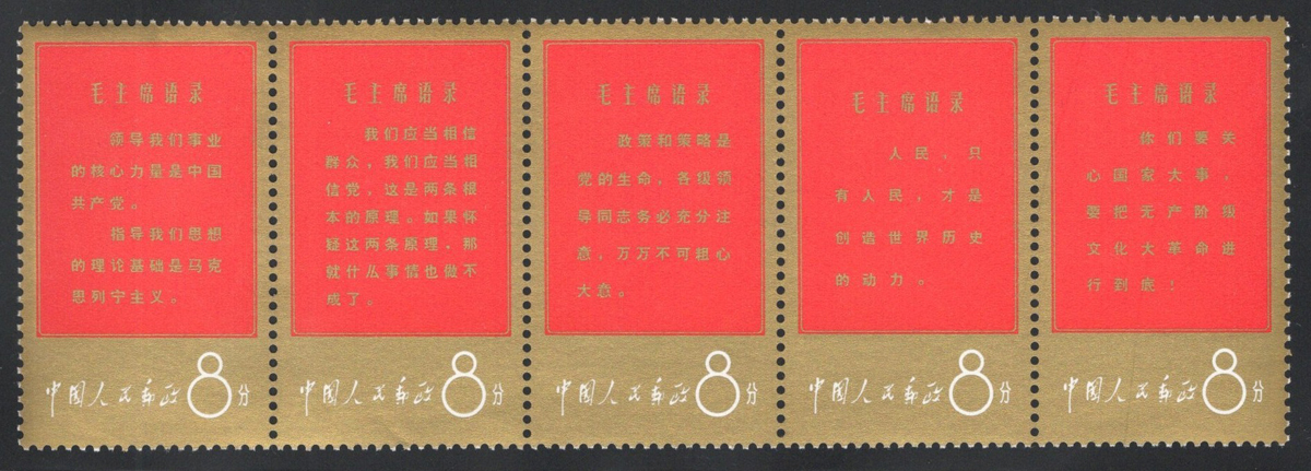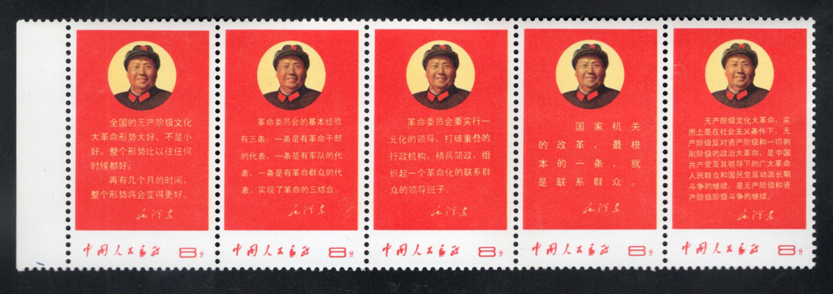 Thoughts of Mao Tse-tung Strip of 5, mint never hinged, never folded, with a very light bend at top of the left stamp, still fresh and very fine.