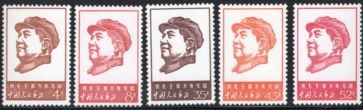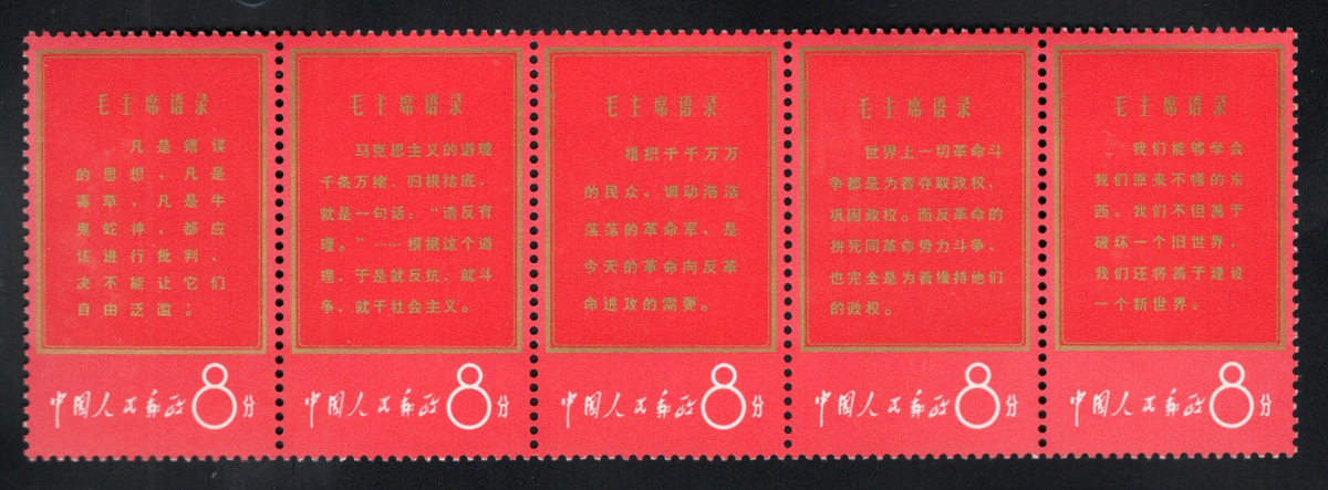 Thoughts of Mao Tse-tung Strip of 5, mint never hinged, never folded, with a minute bend at top of left stamp, still fresh and very fine.