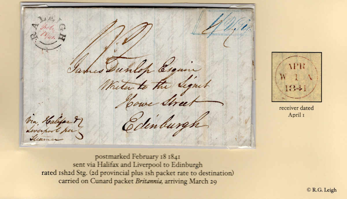 Folded Letter to Scotland, mailed on FEB.18.1841 (1829-type in black) to Edinburgh (APR.1 receiver), endorsed via Halifax and Liverpool, and carried on the Cunard packet Britannia, very fine.