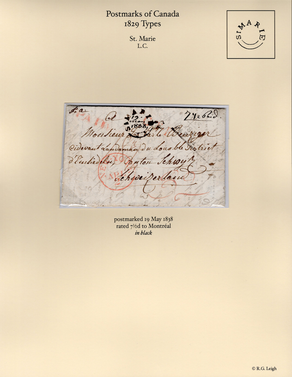 Folded Letter to Switzerland, a very long 4 page letter datelined "Montagne de Ste Thérese, Compté de Rouville, B. Canada, Paroisse de St Marie, le 15 mars 1838", mailed on MAY.19.1838 (1829-Type in black) to Switzerland (scarce thus), via New