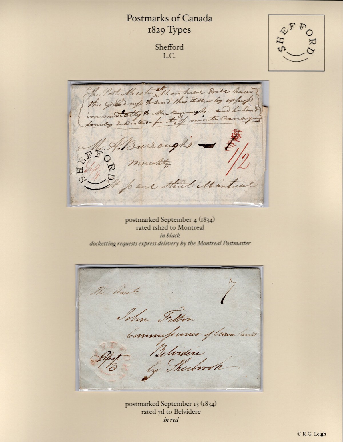 Two Folded Cover to Québec City, first was mailed on SEP.4.1834 (1829-type in black) to Montréal, with a long message on front requesting express service by the Montréal postmaster. The second was mailed on SEP.13.1834 (1829-Type in red) to