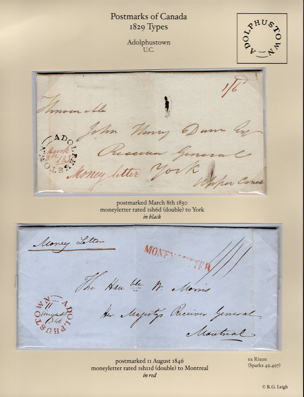Adolphustown (U.C.) Two Folded Letters, first is a double rate money letter mailed on MAR.8.1830 (1829-type in black is the ERD) to York, second is a double rate money letter mailed on AUG.11.1846 to Montréal (1829-Type in red, ex Rixon), both